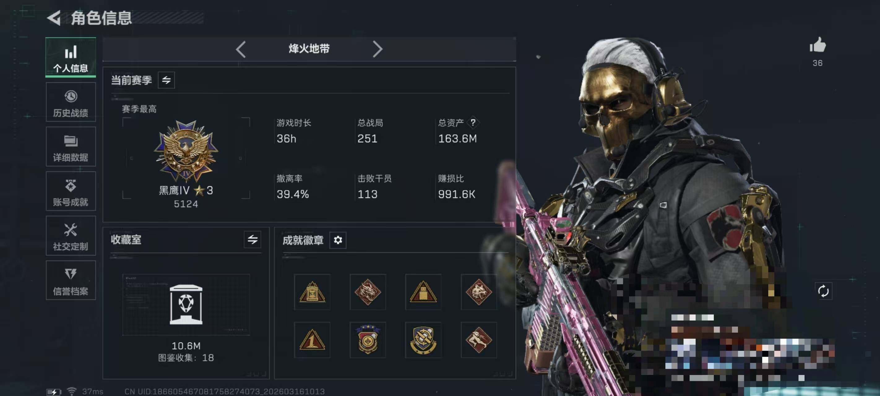 163m总资产-38423k哈伏币-60烽火等级-黑鹰-50战场等级-上等兵