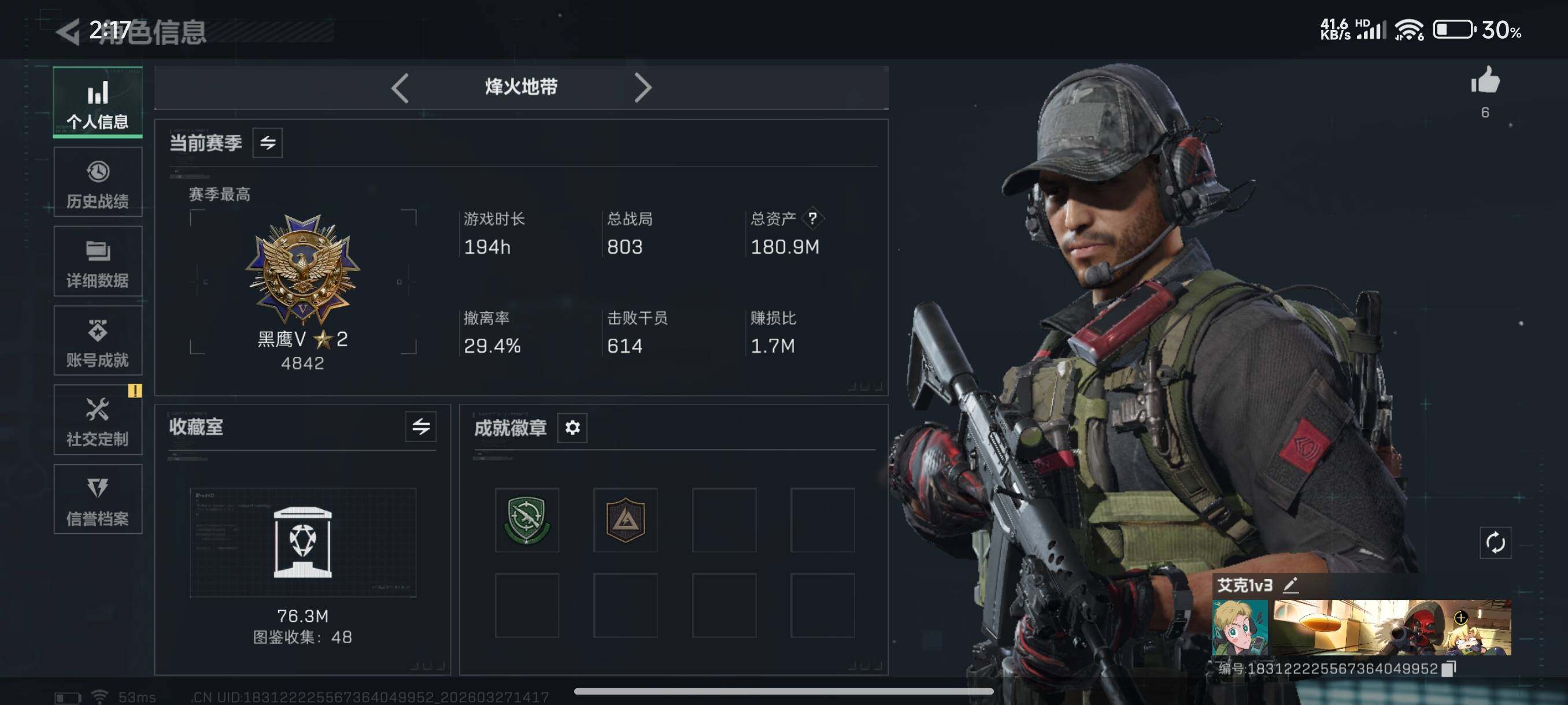 {特价出售}等级:60总资产:180.9M 纯币2263k 红皮:蚀金玫瑰 刀皮:信条 砖皮: 优品C棱镜攻势M7 特勤处:仓库7,训练4,靶场4