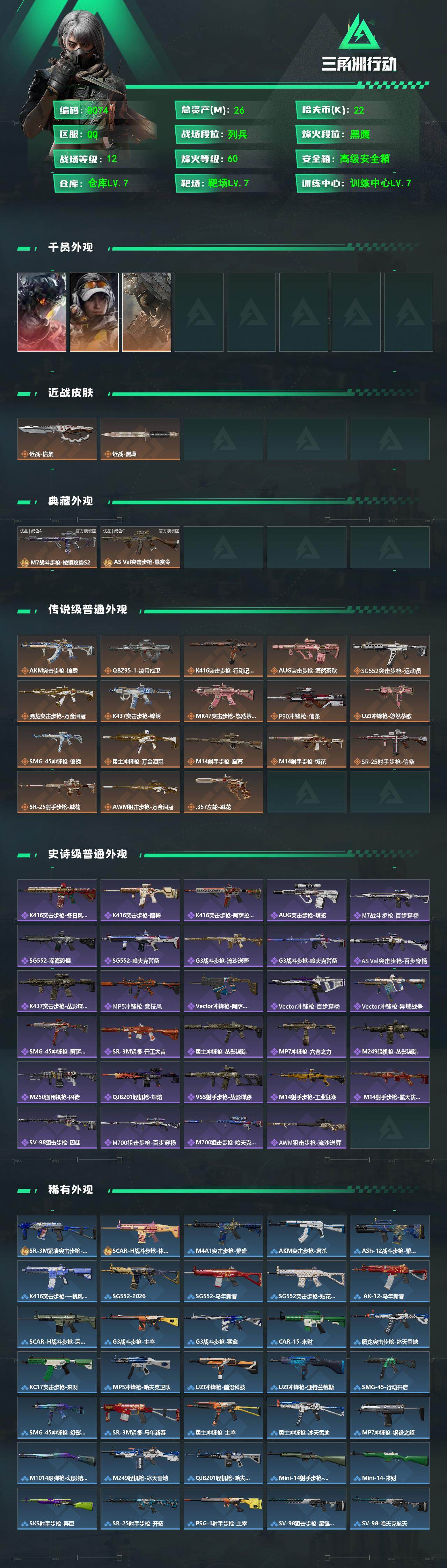 {特价出售}等级:60 总资产:26.4M 流动资产: 2.3 M 纯币:22157 红皮: 凌霄戍卫 战令皮肤:荒原猎手 金牌射手 刀皮:信条 砖皮: 优品a m7 优品c 巨浪 特勤处:仓库7,训练7,靶场7
