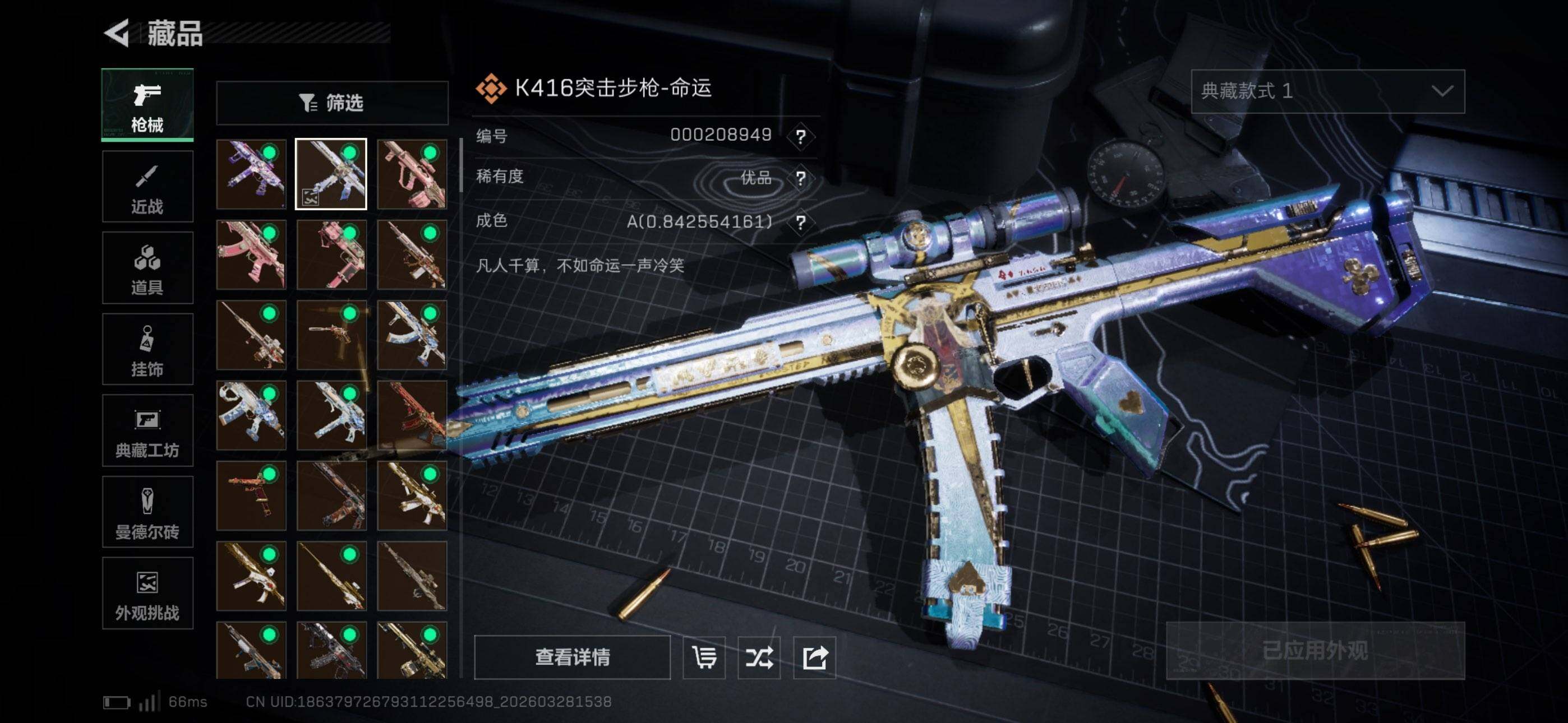 【SJZYT767】总资产(M):172M/哈夫币(K):131K/哈夫币(K):131K/传说枪皮数:39/全面战场等级:47_段位:上等兵/烽火地带等级:60_段位:钻石/红狼-蚀金玫瑰/蜂医-送葬人·无题密令/深蓝-不破誓约/红狼-电锯惊魂/乌鲁鲁-荒原猎手/蛊-不羁人生/近战-北极星/近战-黑鹰/K416突击步枪-命运/K416突击步枪-命运(优品A)/M4A1突击步枪-蚀金玫瑰/M4A
