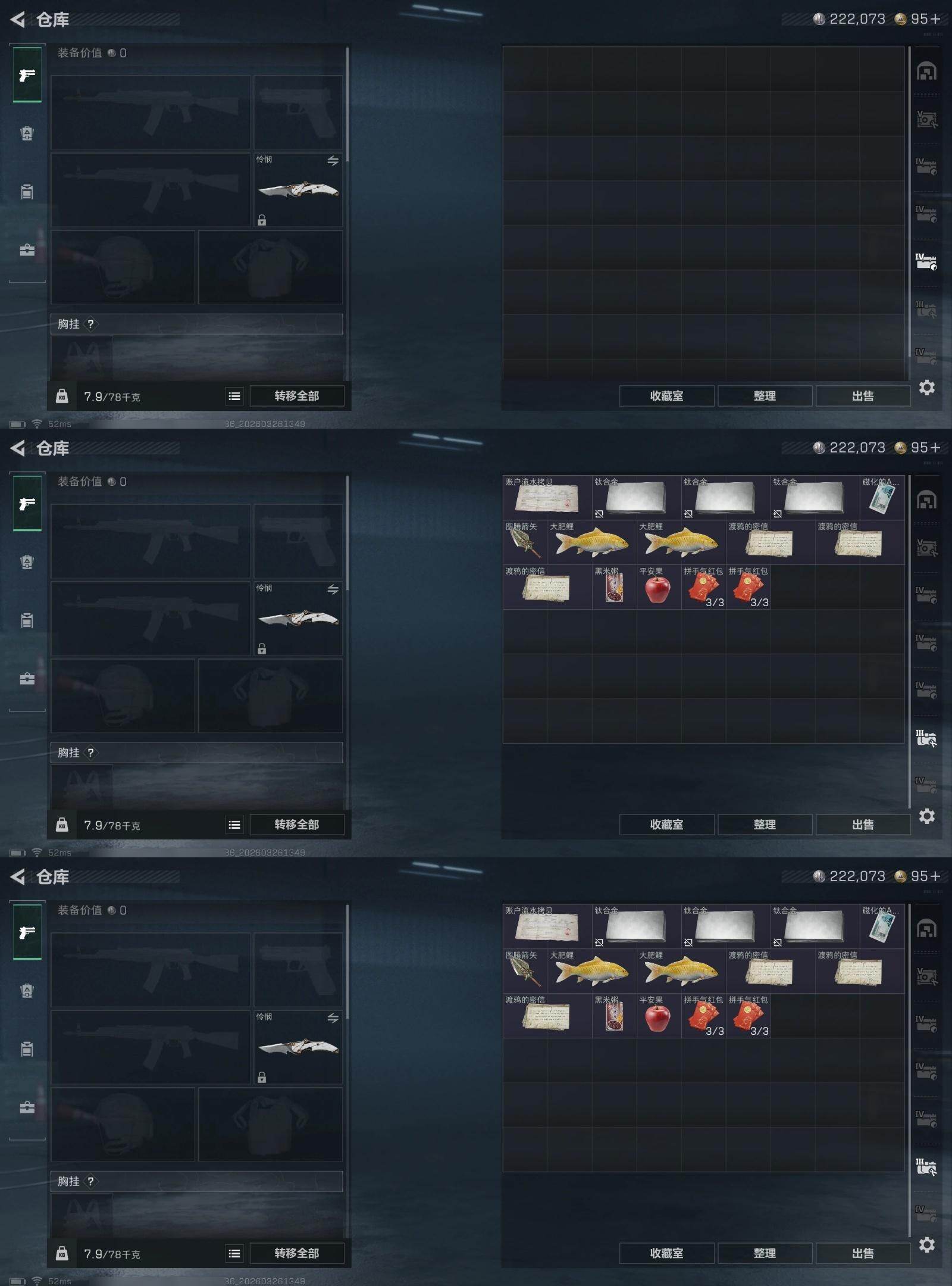 【2858】总资产(M):135M/哈夫币(K):222K/哈夫币(K):222K/全面战场等级:15_段位:列兵/烽火地带等级:60_段位:钻石/红狼-电锯惊魂/威龙-凌霄戍卫/乌鲁鲁-荒原猎手/露娜-金牌射手/近战-处刑者1级/近战-暗星/近战-怜悯/近战-黑鹰/M250通用机枪-电玩高手S2/AUG突击步枪-悠然茶歇/MK47突击步枪-悠然茶歇/UZI冲锋枪-悠然茶歇/M14射手步枪-缄花