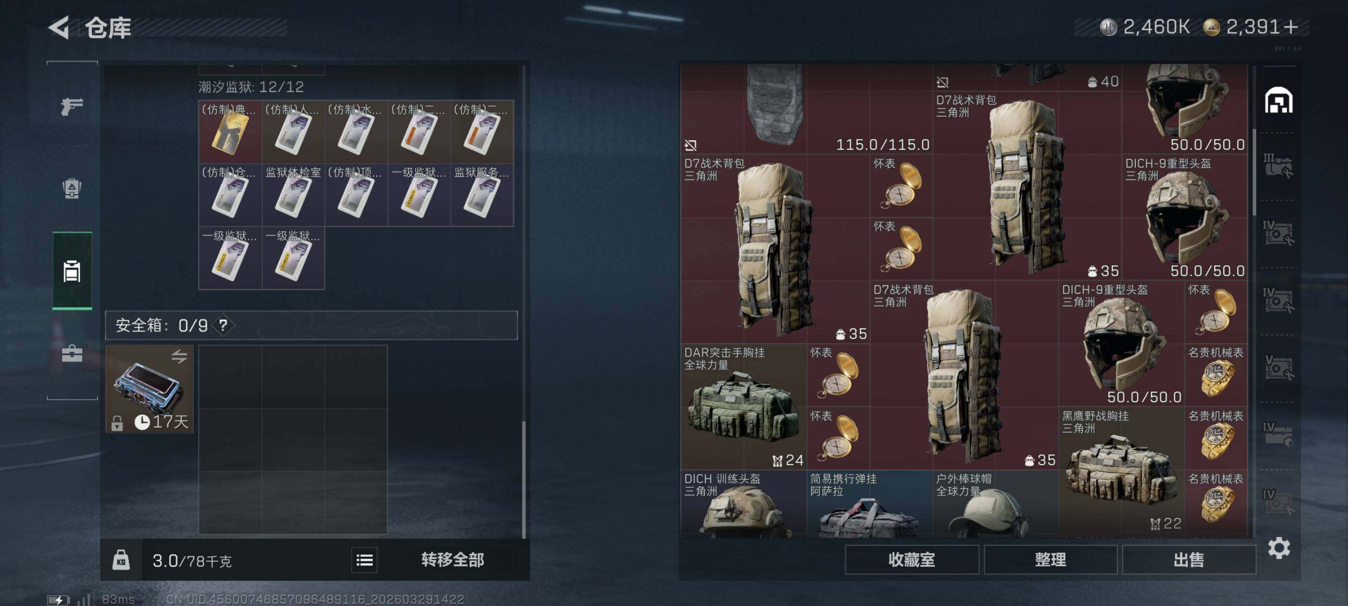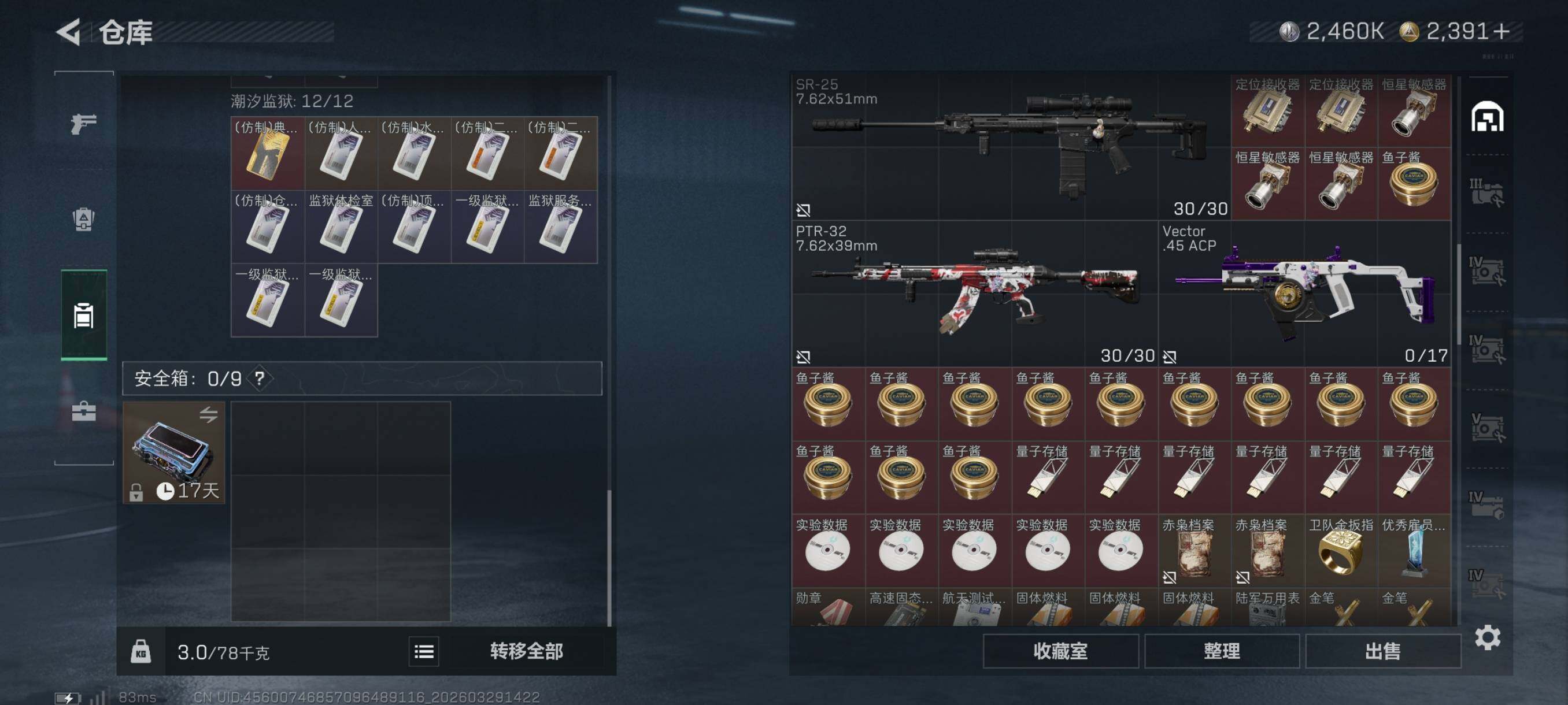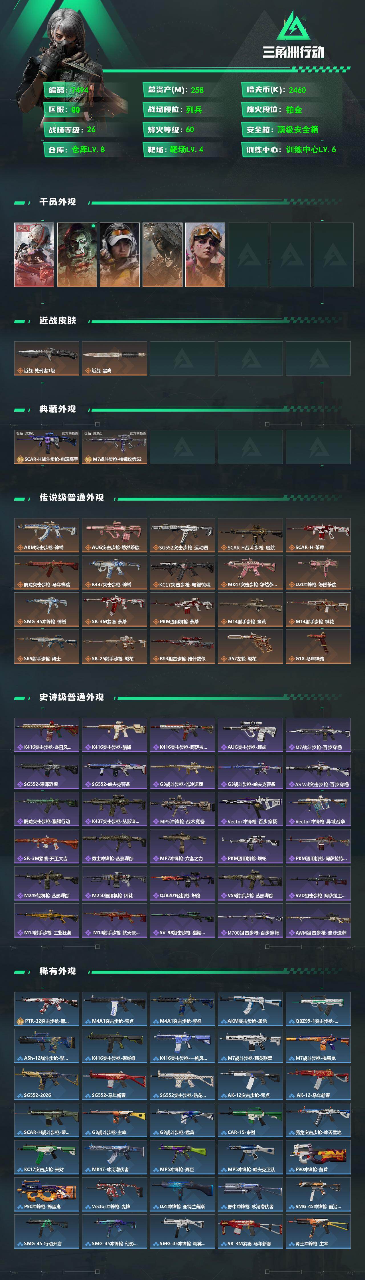 {特价出售}等级:60 总资产:258.9M 纯币2460k 隐藏挂饰:黑夜猎手 红皮:骇爪-维什戴尔/乌鲁鲁-荒原猎手/露娜-金牌射手/红狼-电锯惊魂/蛊-不羁人生 砖皮: SCAR-H战斗步枪-电玩高手(极品C)/M7战斗步枪-棱镜攻势S2(优品C), 特勤处:仓库8,训练6,靶场4