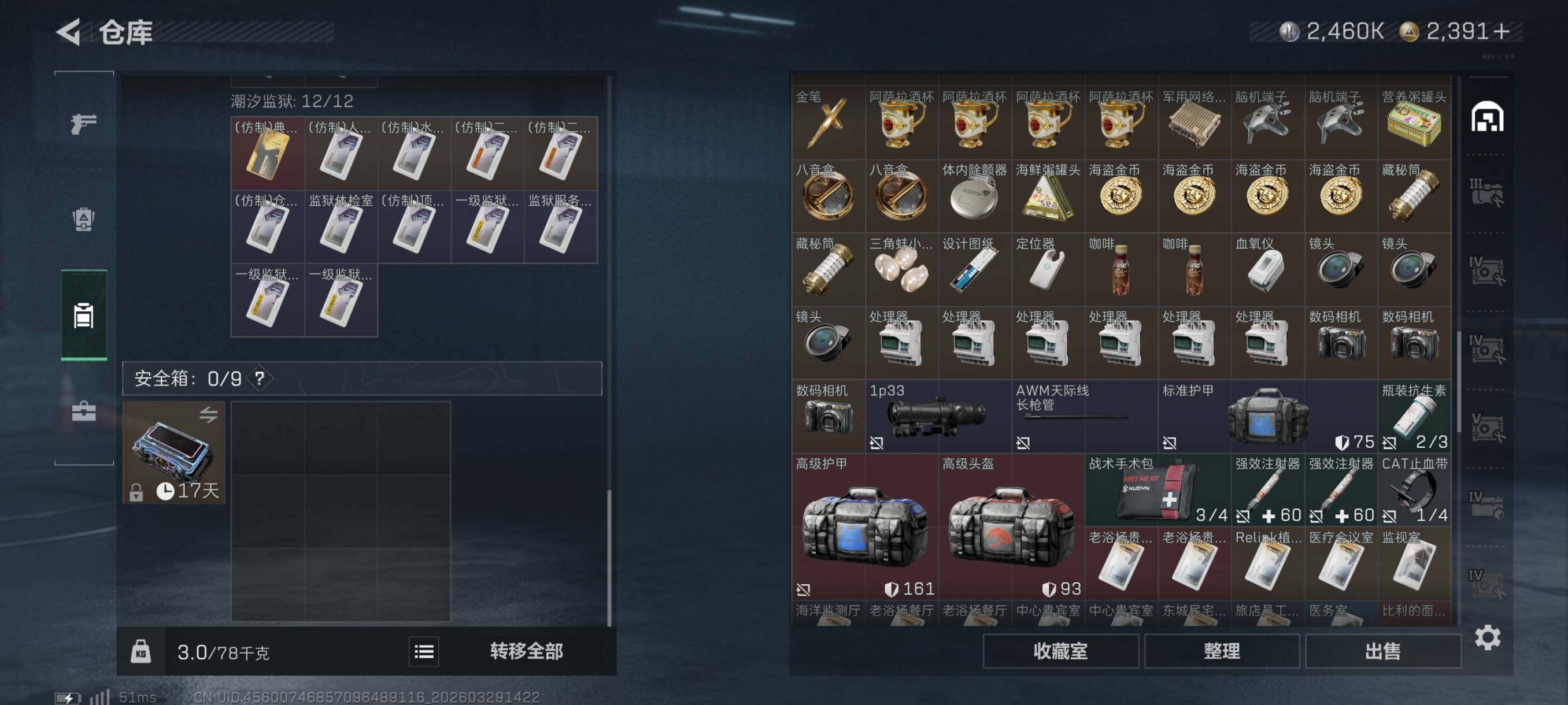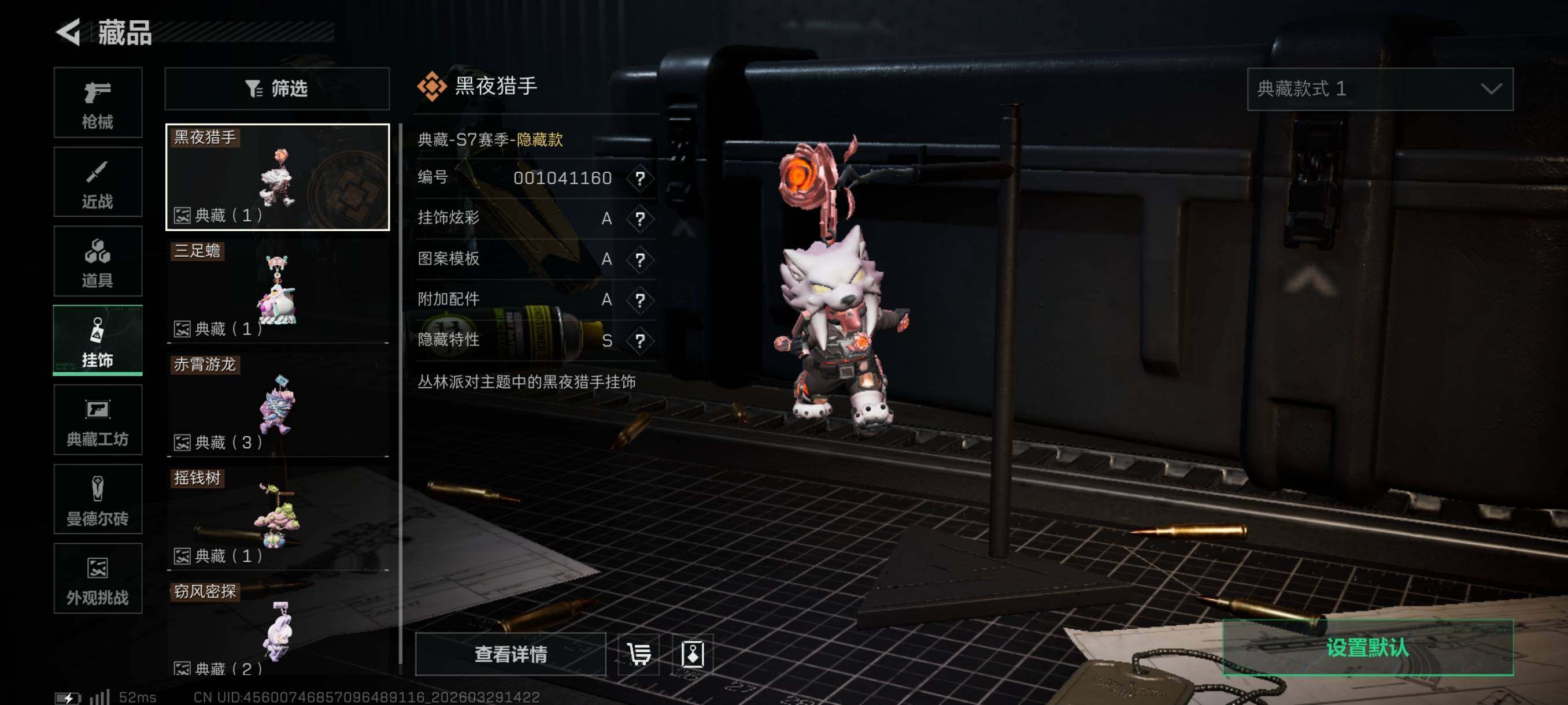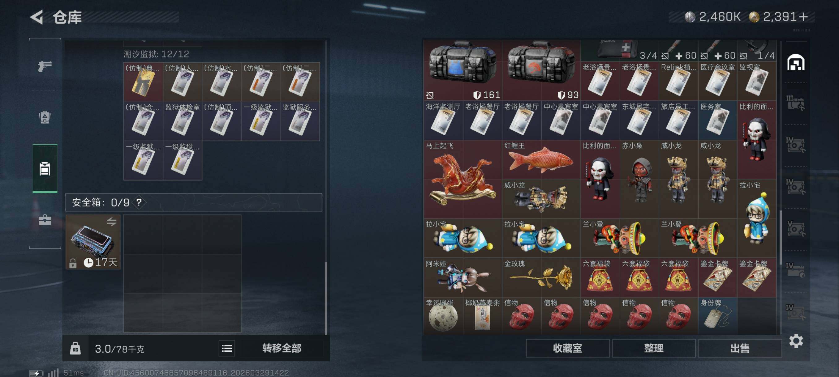 {特价出售}等级:60 总资产:258.9M 纯币2460k 隐藏挂饰:黑夜猎手 红皮:骇爪-维什戴尔/乌鲁鲁-荒原猎手/露娜-金牌射手/红狼-电锯惊魂/蛊-不羁人生 砖皮: SCAR-H战斗步枪-电玩高手(极品C)/M7战斗步枪-棱镜攻势S2(优品C), 特勤处:仓库8,训练6,靶场4