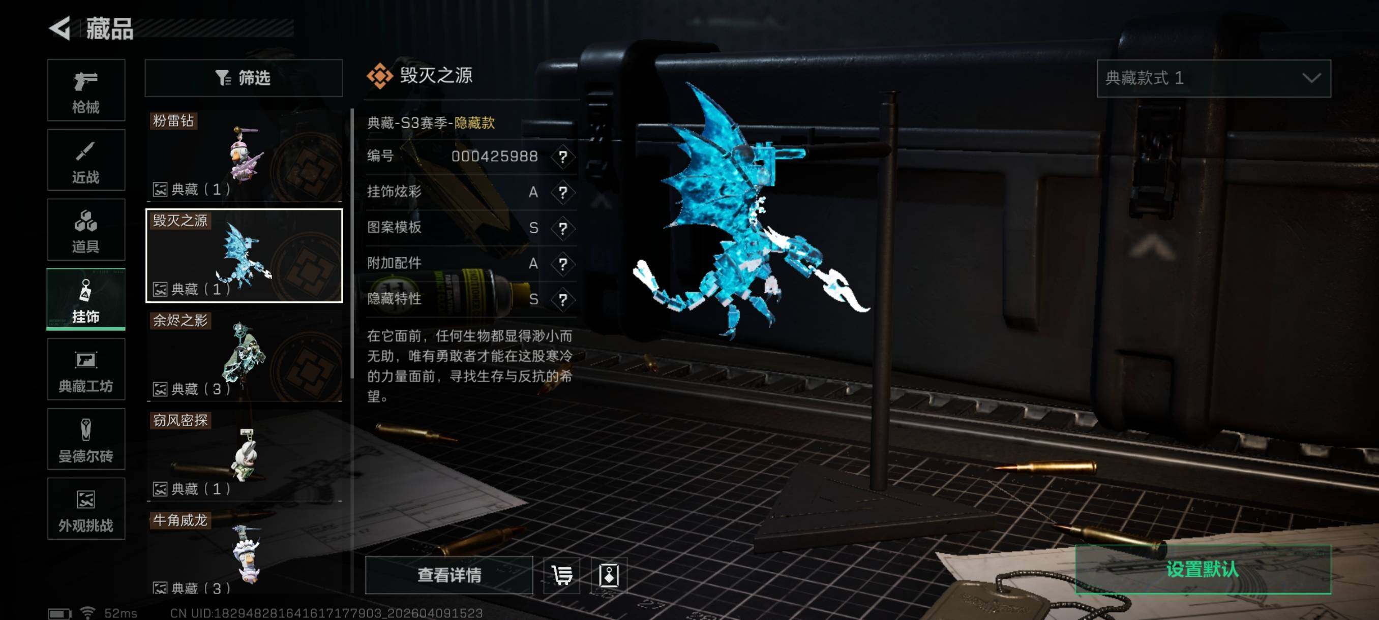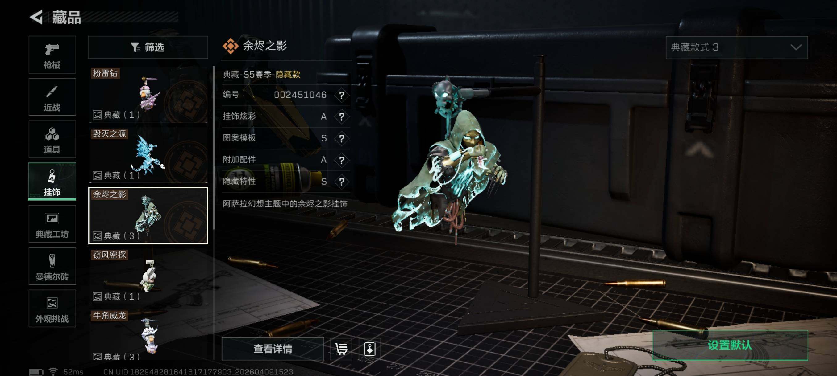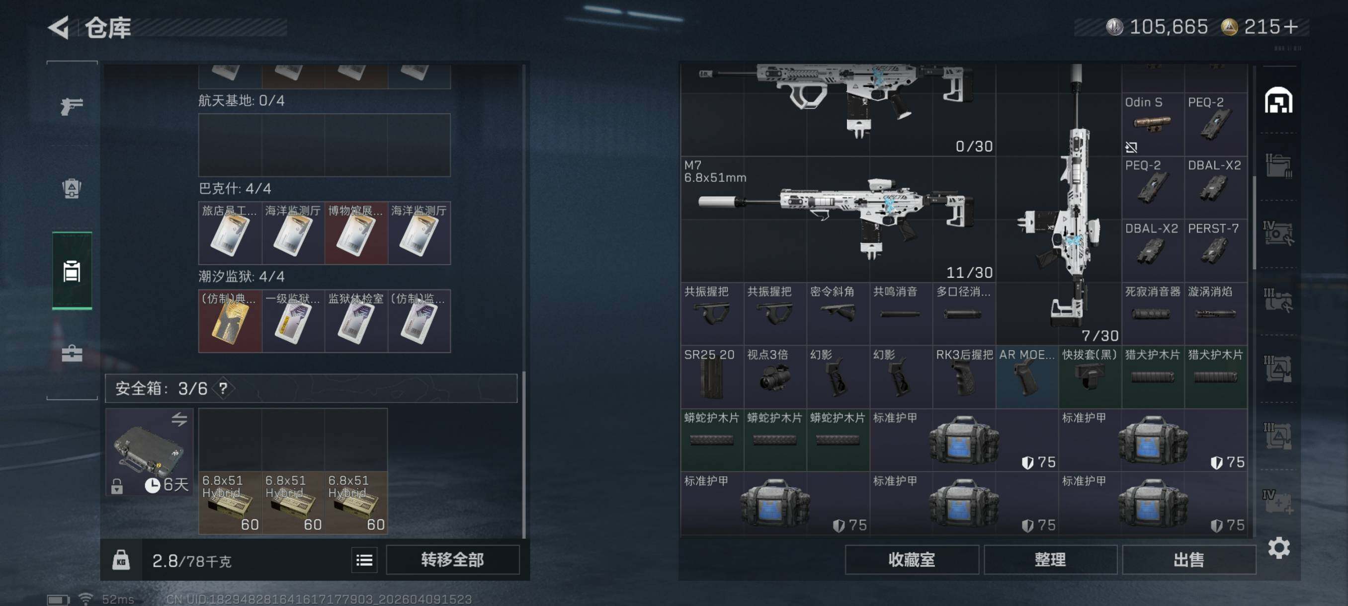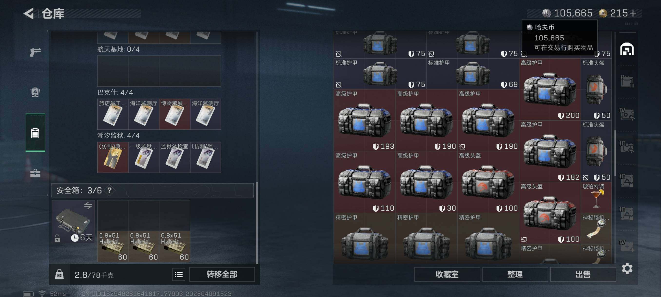 {特价出售}等级: 60 总资产:71.8M 流动资产: 54.1 M 纯币:105665 隐藏挂饰:毁灭之源,余烬之影*3 肘击王 红皮: 战令皮肤:乌鲁鲁-荒原猎手/红狼-电锯惊魂/深蓝-不破誓约/蜂医-送葬人无题密令 刀皮:北极星 砖皮:AS Val突击步枪-悬赏令(优品C) 特勤处:仓库7,训练4,靶场4