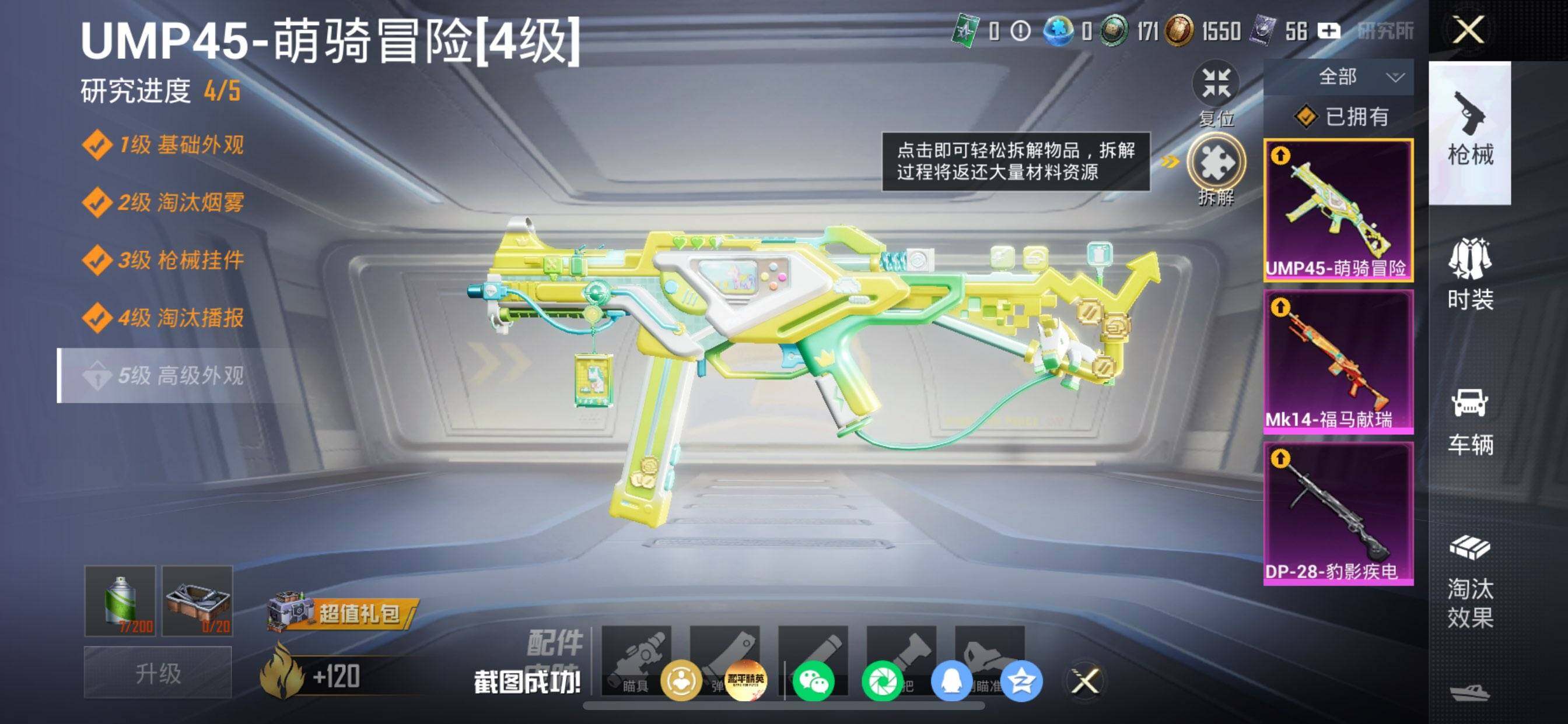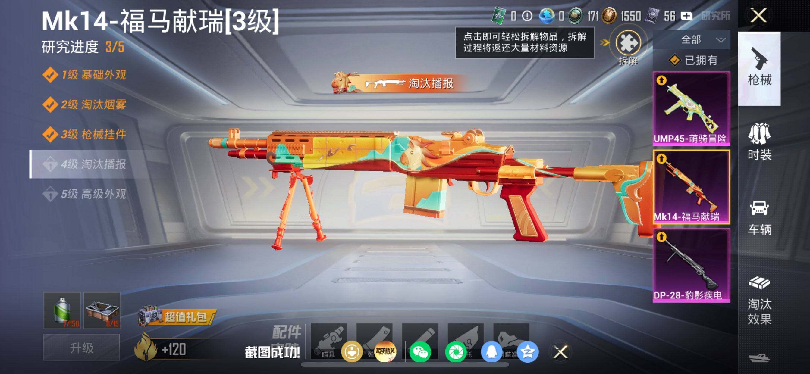 【粉色枪皮等级】:UMP45-萌骑冒险(四级),Mk14-福马献瑞(三级),DP-28-豹影疾电(五级)