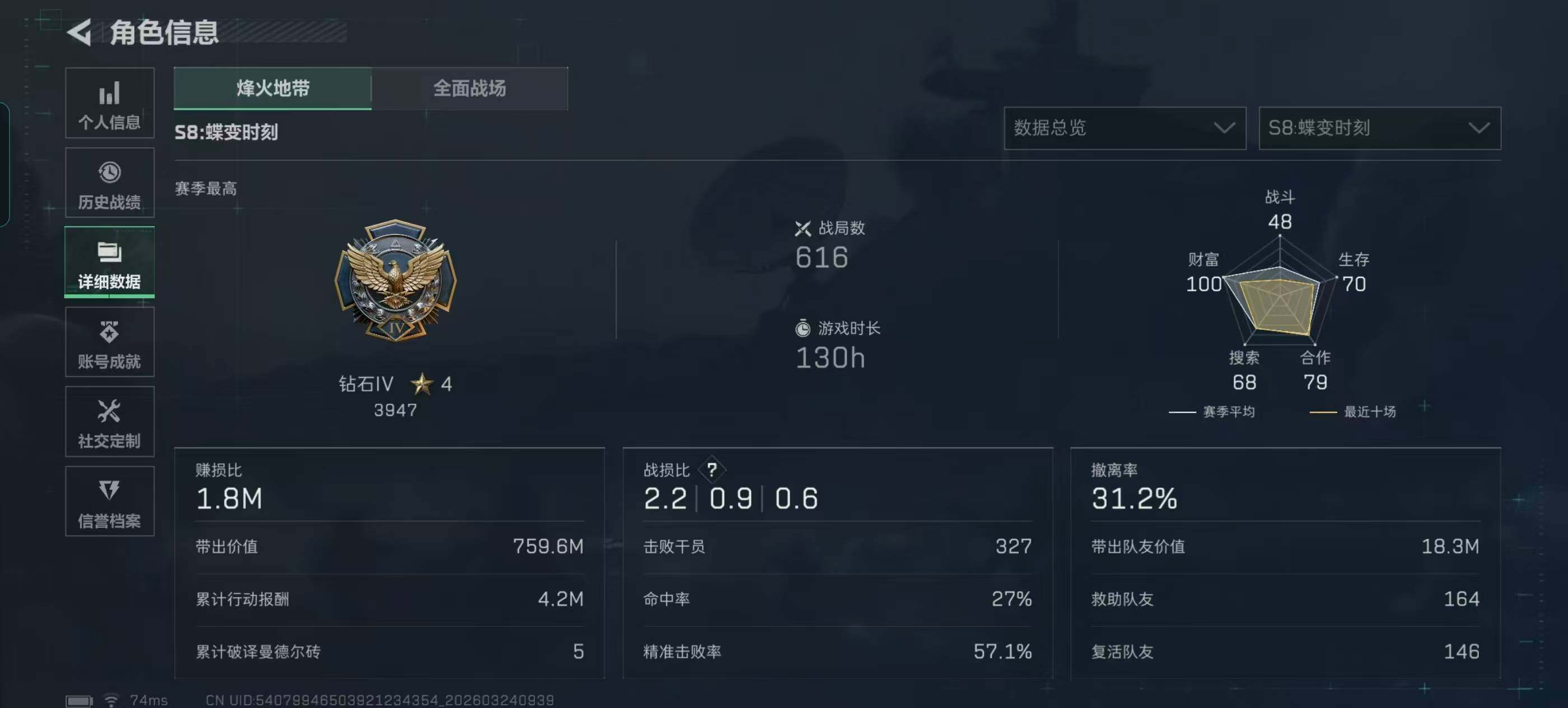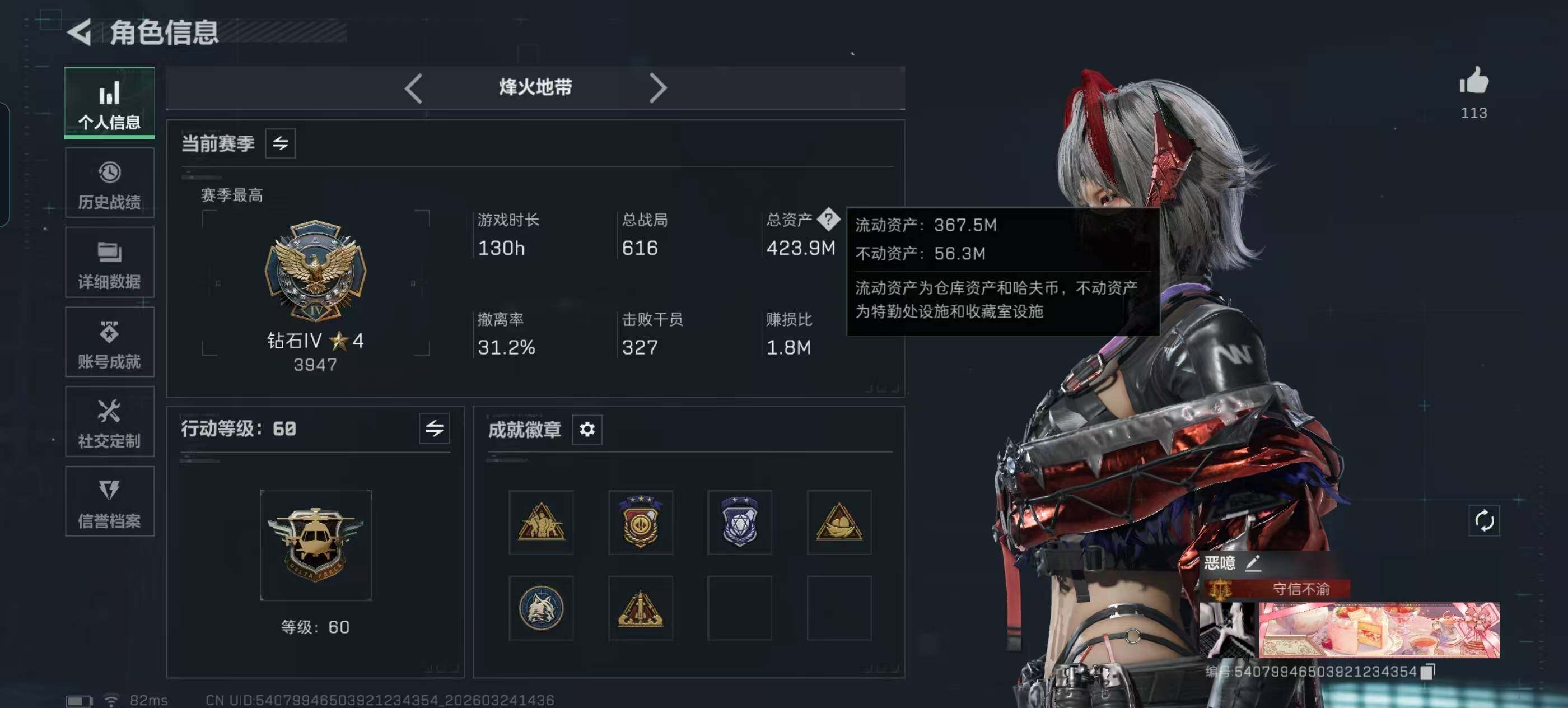 【SJ1526】423m总资产-52811k哈夫币-60烽火等级-钻石-25战