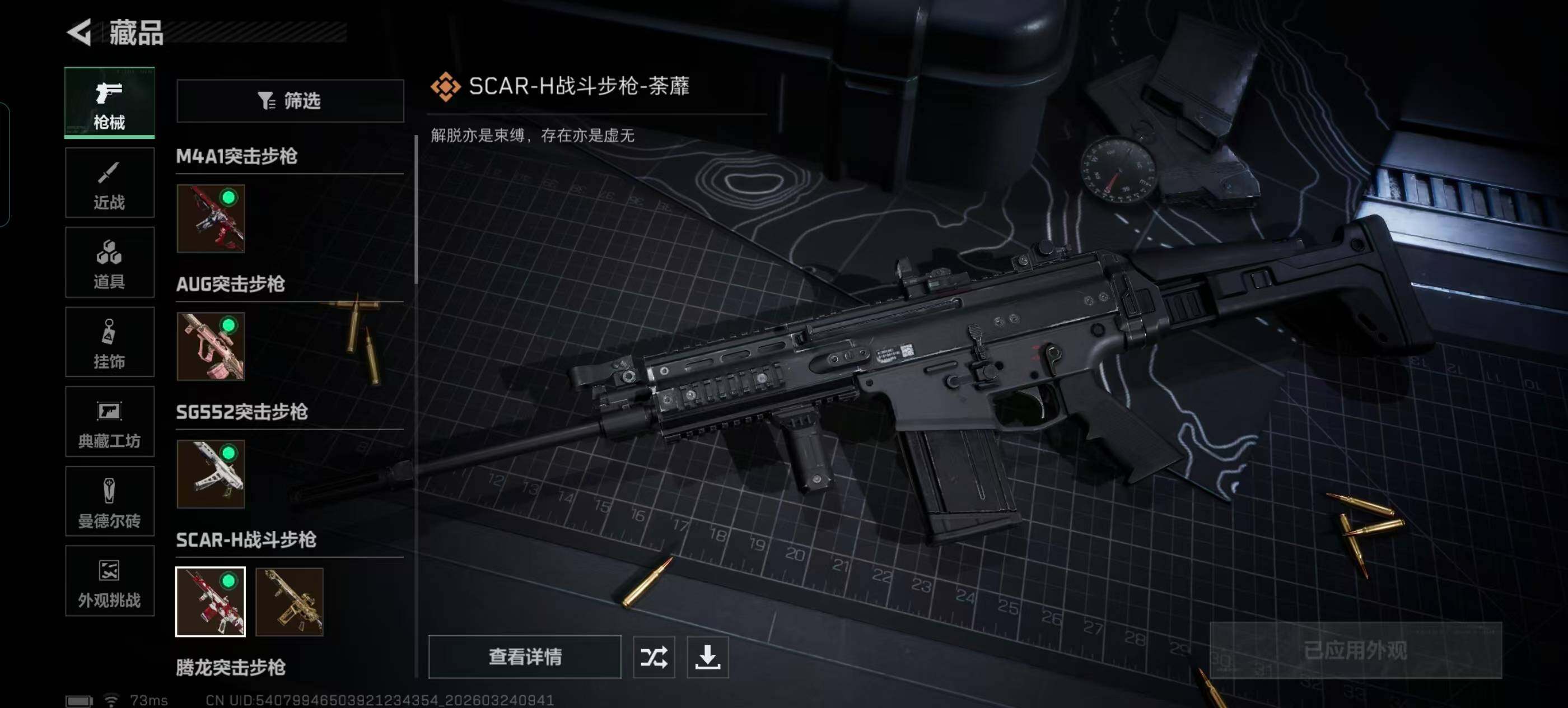 【传说外观】:M4A1突击步枪-阿米娅,AUG突击步枪-悠然茶歇,SG552突击步枪-运动员,SCAR-H战斗步枪-启航,SCAR-H战斗步枪-荼蘼,腾龙突击步枪-马年祥瑞,KC17突击