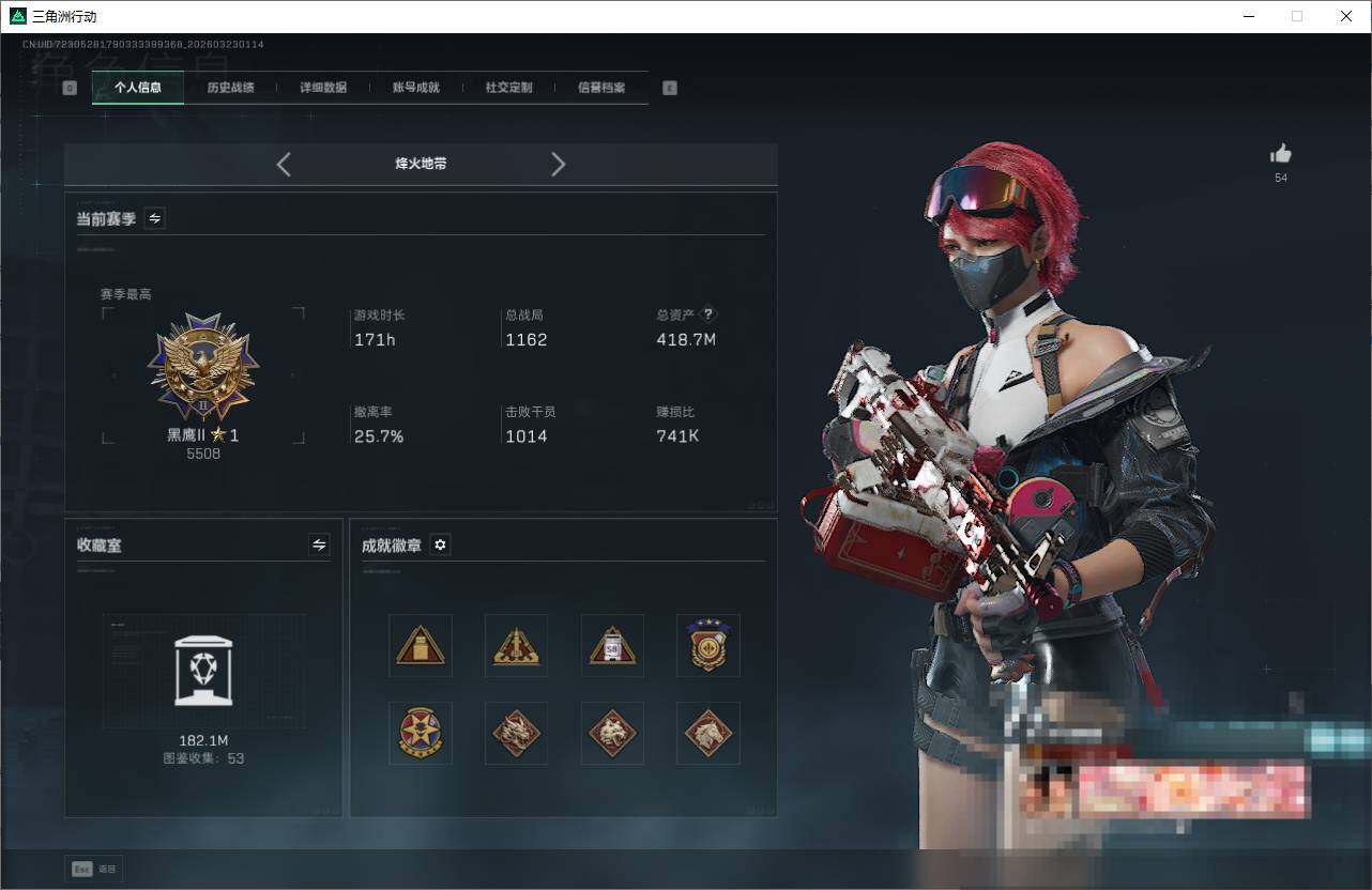 【SJZF6820】总资产(M):418M/哈夫币(K):25743K/哈夫币(K):25743K/传说枪皮数:30/全面战场等级:36_段位:上等兵/烽火地带等级:60_段位:黑鹰/零号玩家/蛊-能天使午夜邮差/红狼-电锯惊魂/露娜-金牌射手/蛊-不羁人生/近战-信条/近战-处刑者1级/近战-黑鹰/M4A1突击步枪-阿米娅/AKM突击步枪-锦绣/K416突击步枪-行动记录/M16A4突击步枪-