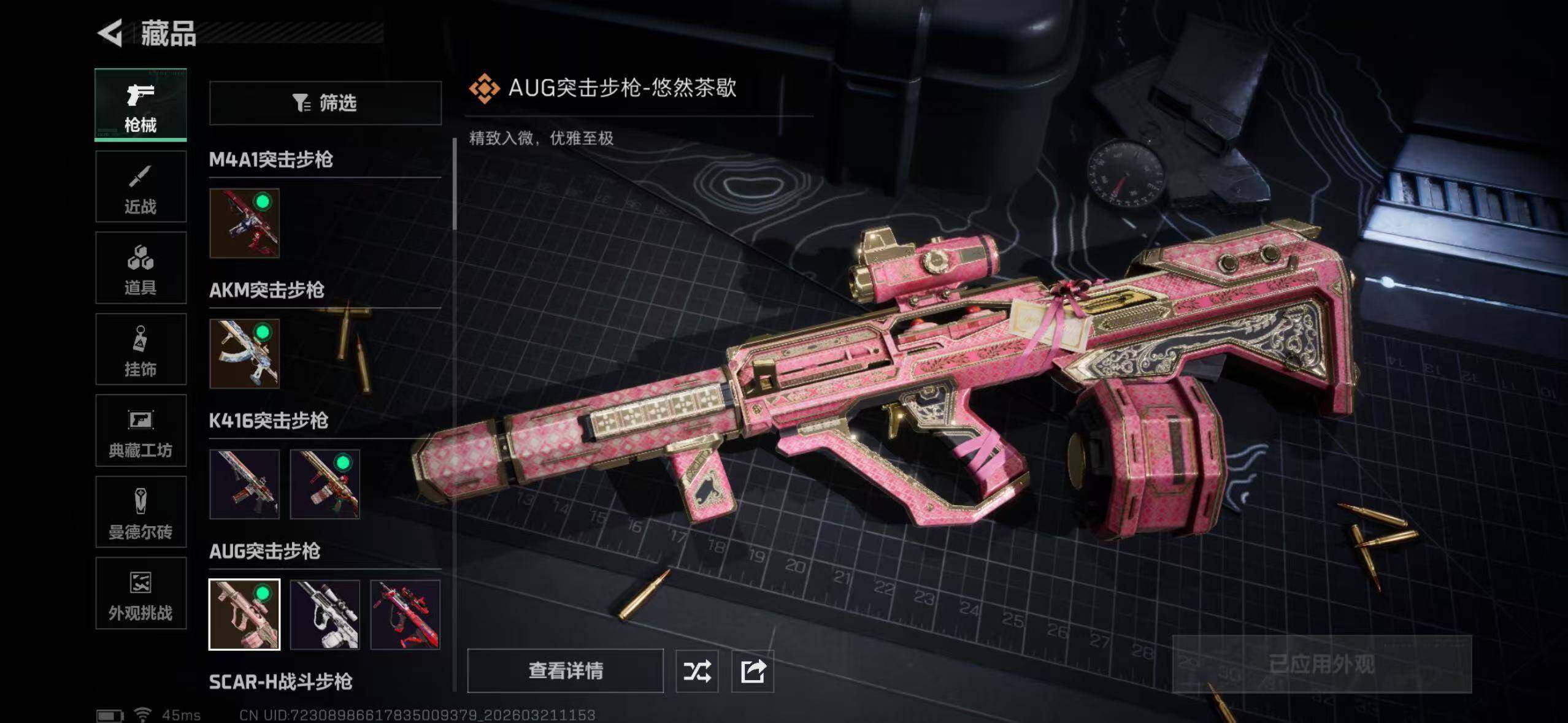 【传说外观】:M4A1突击步枪-阿米娅,AKM突击步枪-锦绣,AUG突击步枪-悠然茶歇,SCAR