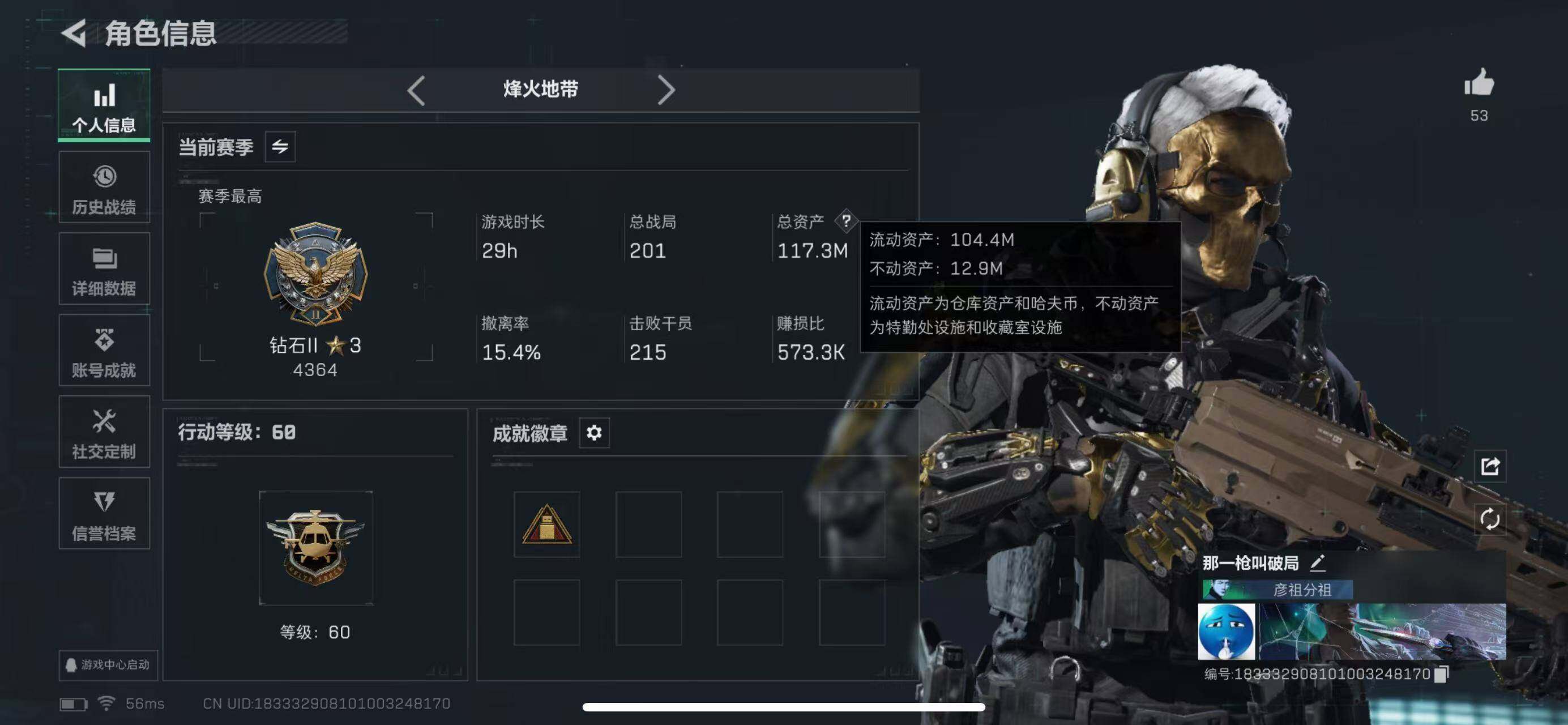 【SJ850】117m总资产-12138k哈伏币-60烽火等级-钻石-50战场等级-校官