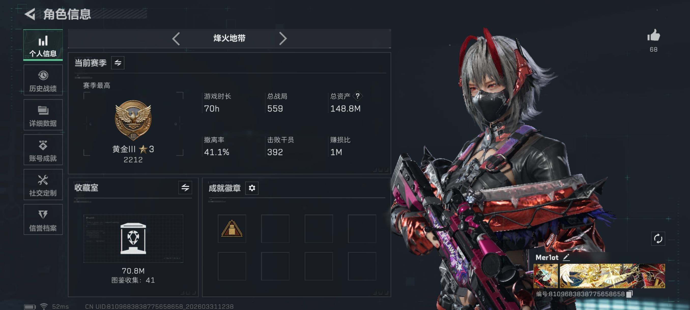 {特价出售}等级:60总资产:148.8M 纯币3474k 红皮:骇爪联动 刀皮: 暗星 信条 怜悯 砖皮: M7棱镜攻势优品B 特勤处:仓库8,训练满,靶场6