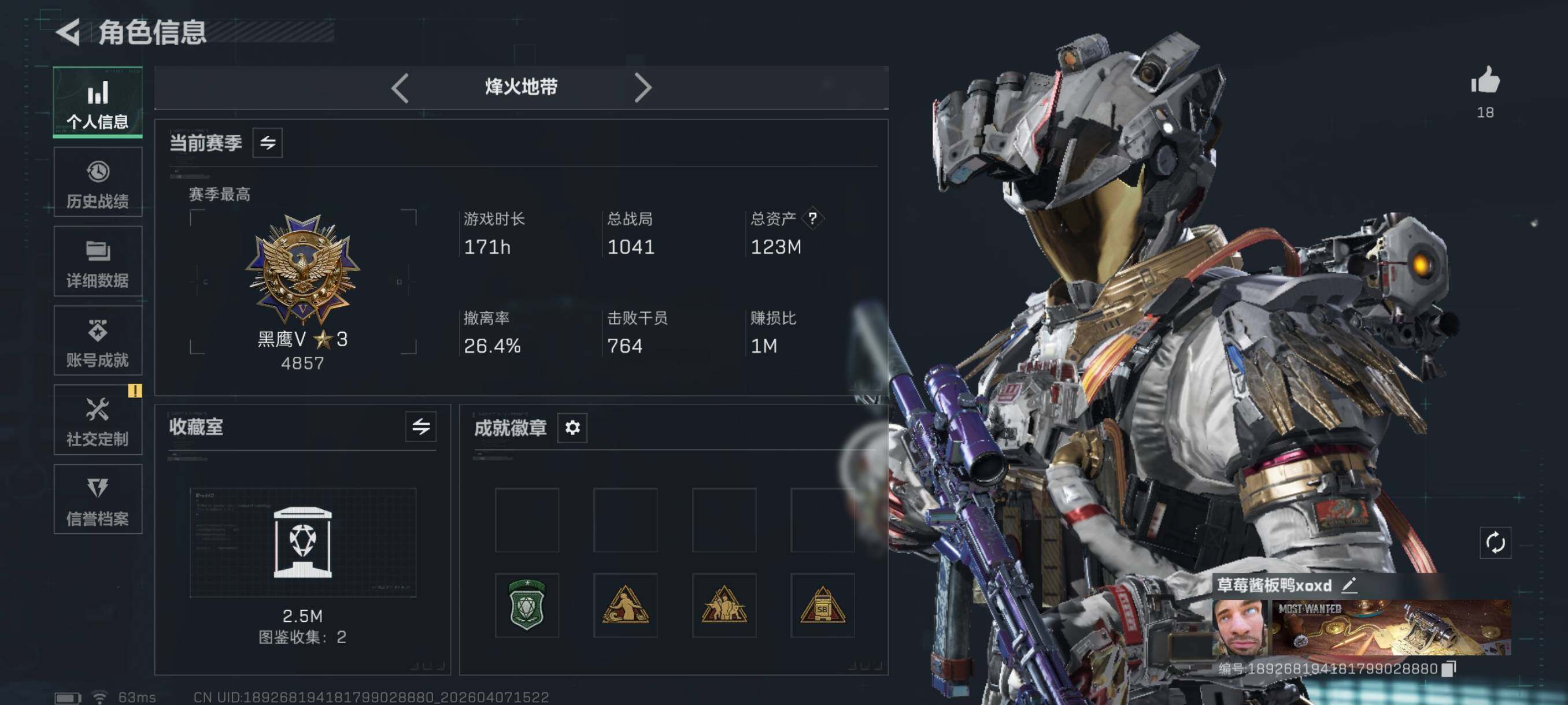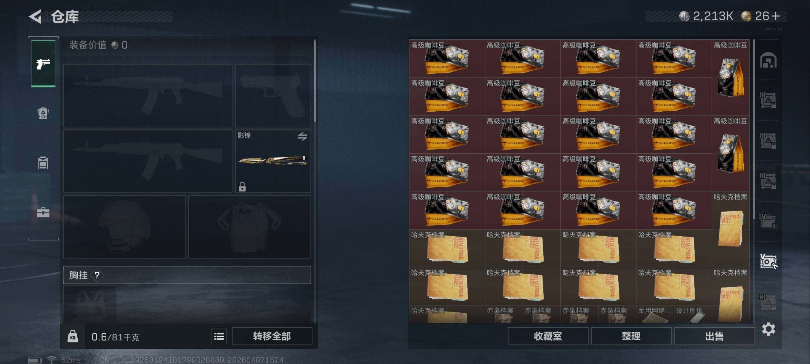 {特价出售}等级:60总资产:123M 纯币2213k 隐藏挂饰: 1S黑夜猎手 红皮:凌霄戍卫 刀皮: 暗星 影锋 砖皮: AS悬赏令优品B M250电玩优品A 特勤处:仓库7,训练6,靶场5