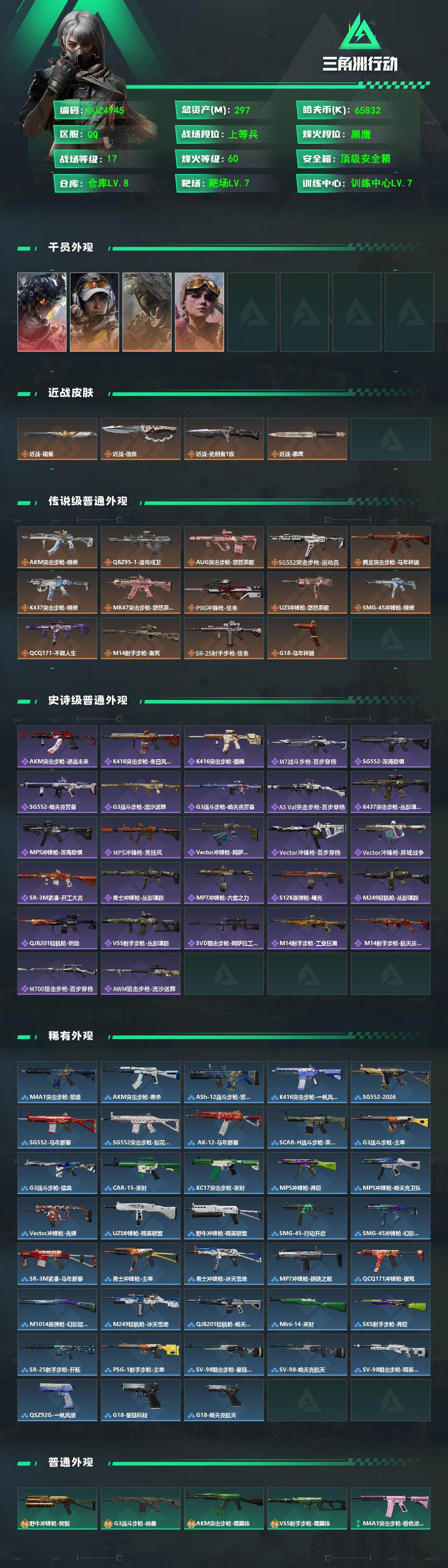 【SJZ4945】总资产(M):297M/哈夫币(K):65832K/哈夫币(K):65832K/传说枪皮数:14/全面战场等级:17_段位:上等兵/烽火地带等级:60_段位:黑鹰/威龙-凌霄戍卫/露娜-金牌射手/乌鲁鲁-荒原猎手/蛊-不羁人生/近战-暗星/近战-信条/近战-处刑者1级/近战-黑鹰/AKM突击步枪-锦绣/QBZ95-1突击步枪-凌霄戍卫/AUG突击步枪-悠然茶歇/SG552突击步