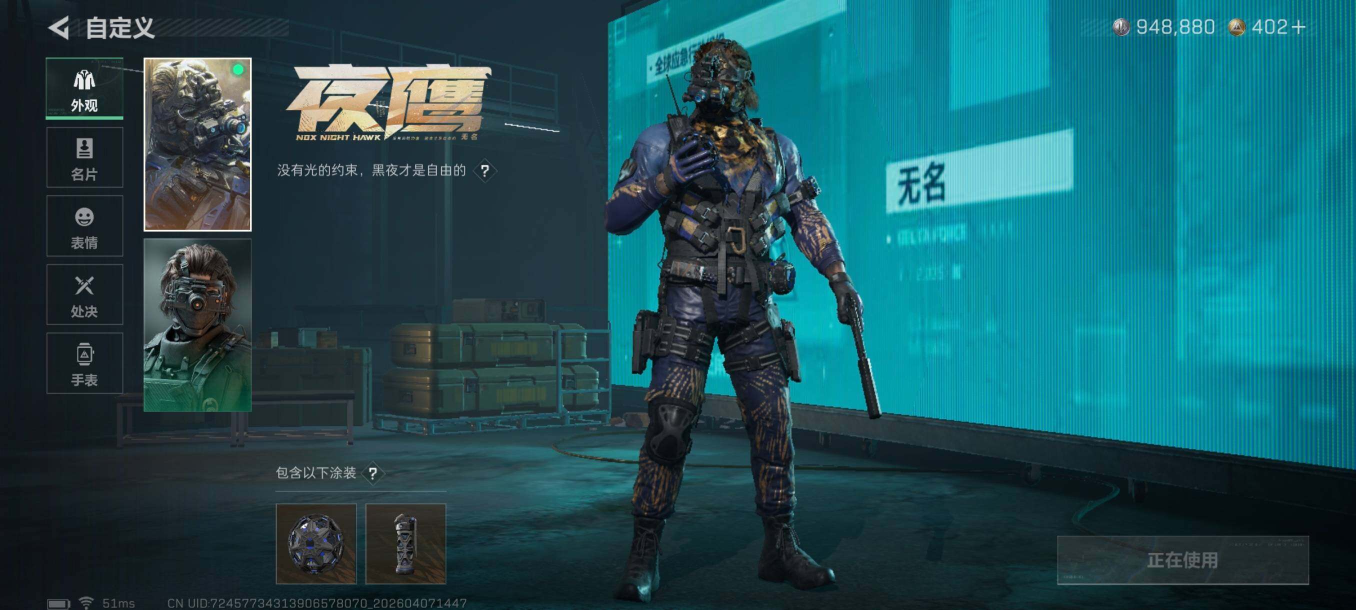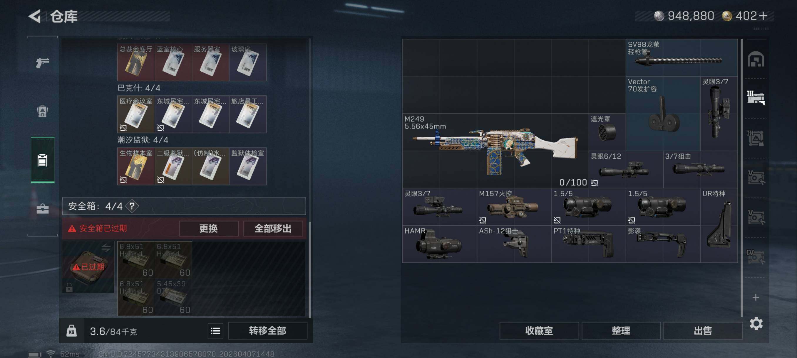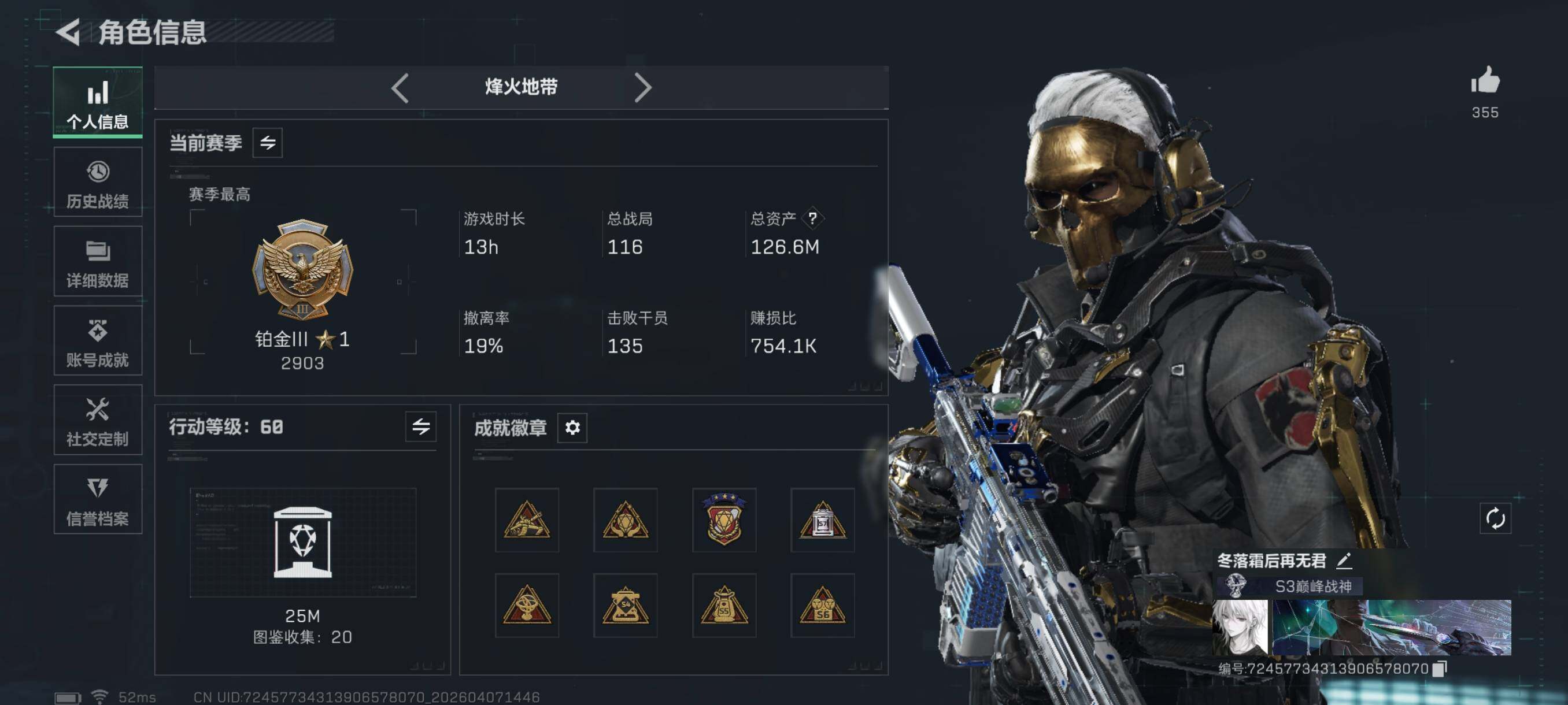 {特价出售}等级:60总资产:126.6M 纯币948880 红皮:蚀金玫瑰 黑天际线 战令皮 壮志凌云 夜鹰 风衣联动 不破誓约 刀皮 北极星 砖皮:优品c m7 特勤处:仓库9,训练6,靶场6