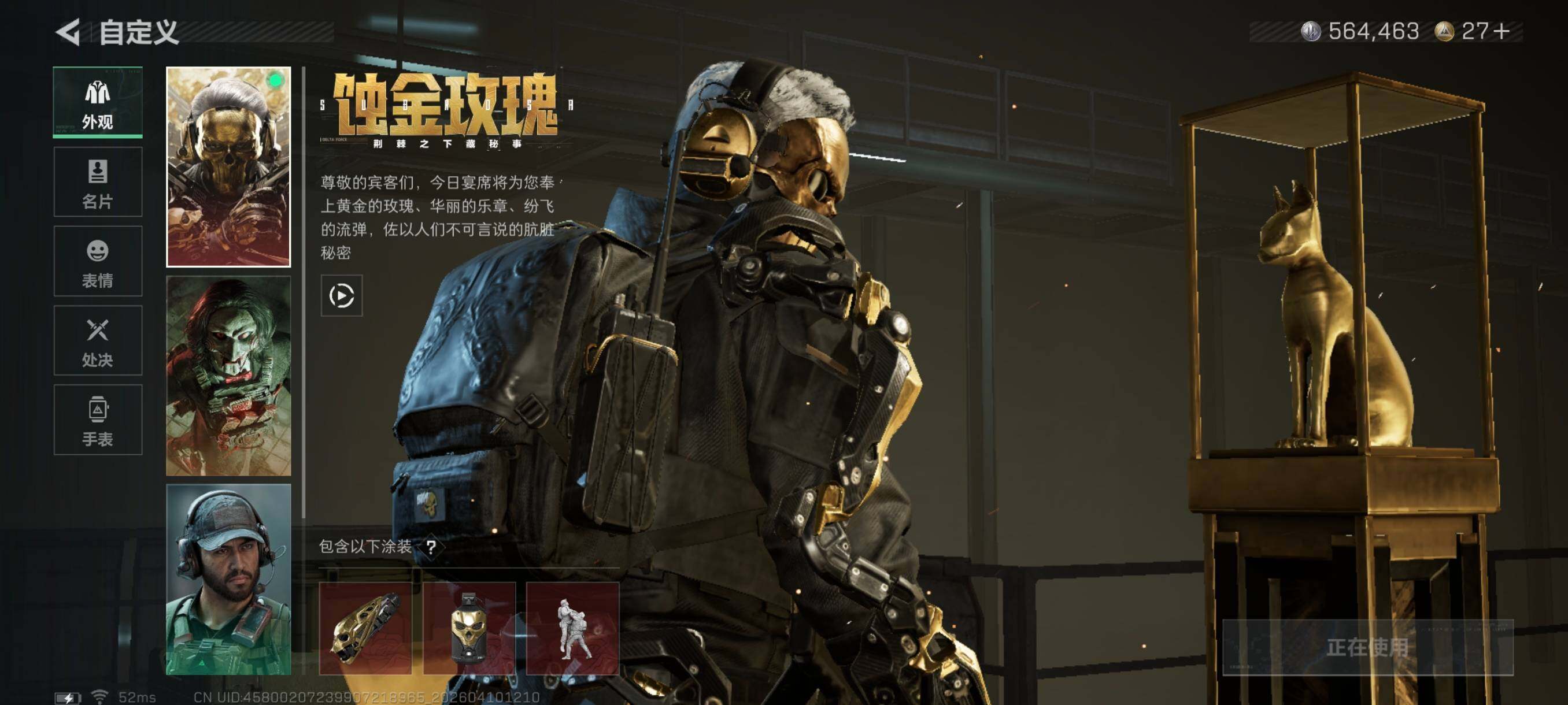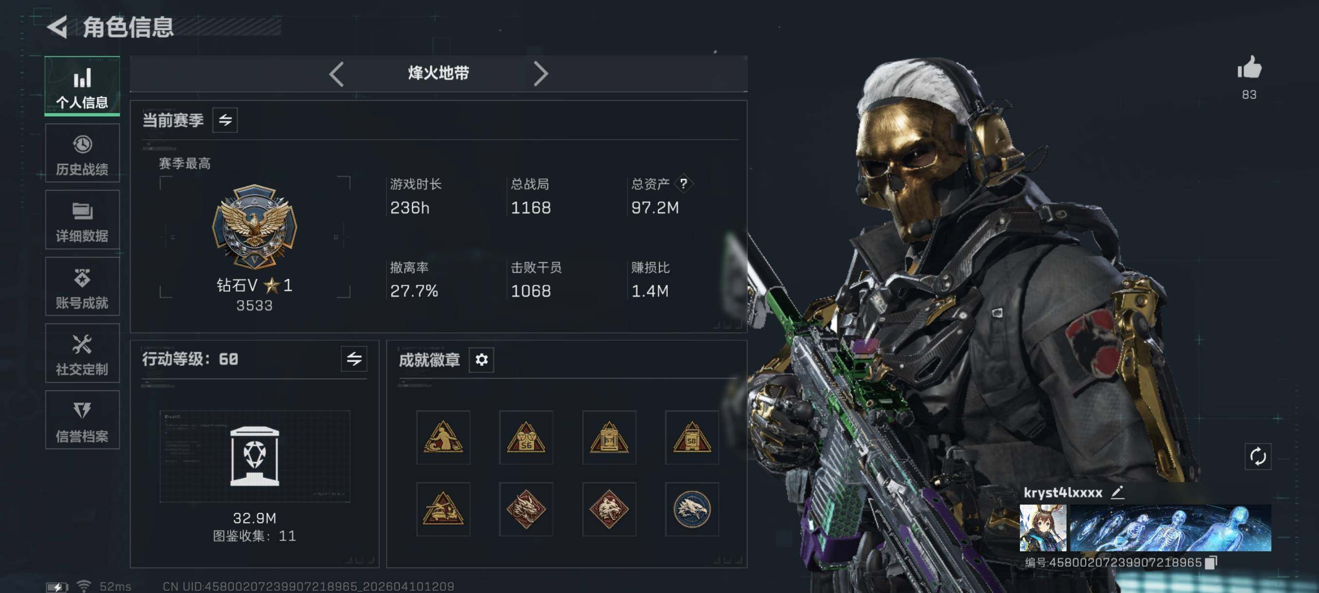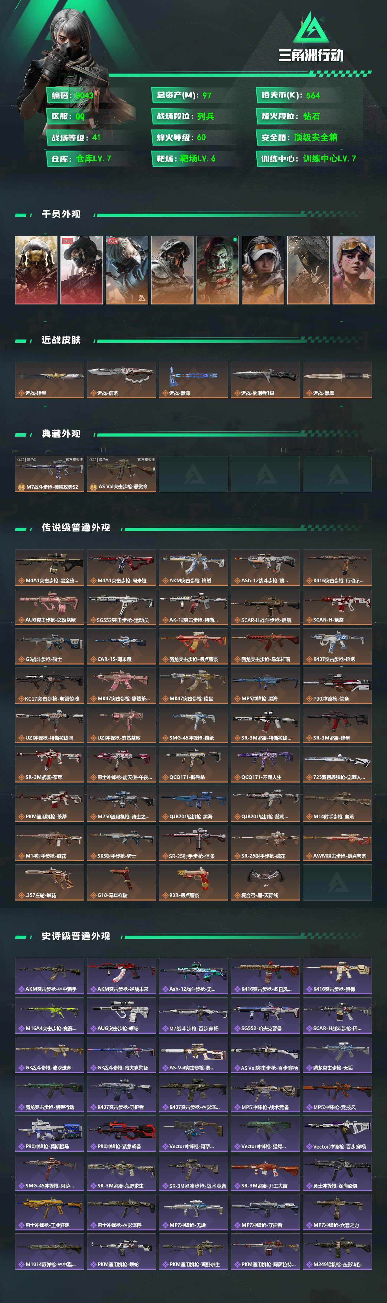{特价出售}等级:60 总资产:97.8M 流动资产:57 M 纯币:564463 红皮:露娜-黑天际线/红狼-蚀金玫瑰 战令皮肤:露娜-金牌射手/蜂医-送葬人无题密令/乌鲁鲁-荒原猎手/红狼-电锯惊魂/深蓝-不破誓约/蛊-不羁人生 刀皮:近战-黑海/近战-信条/近战-处刑者/近战-暗星 砖皮:AS Val突击步枪-悬赏令(优品A)/M7战斗步枪-棱镜攻势S