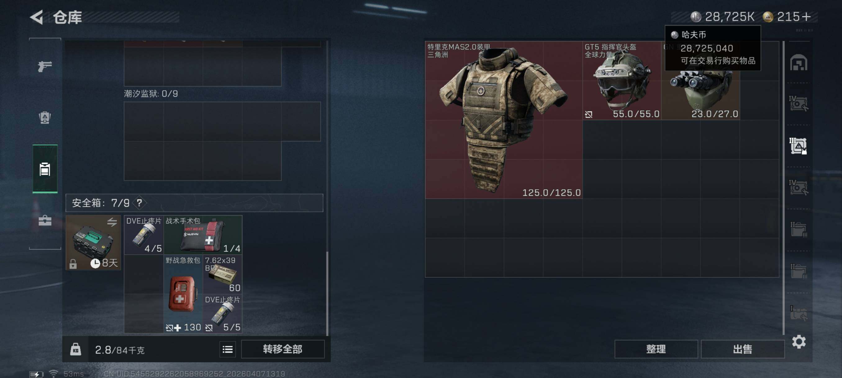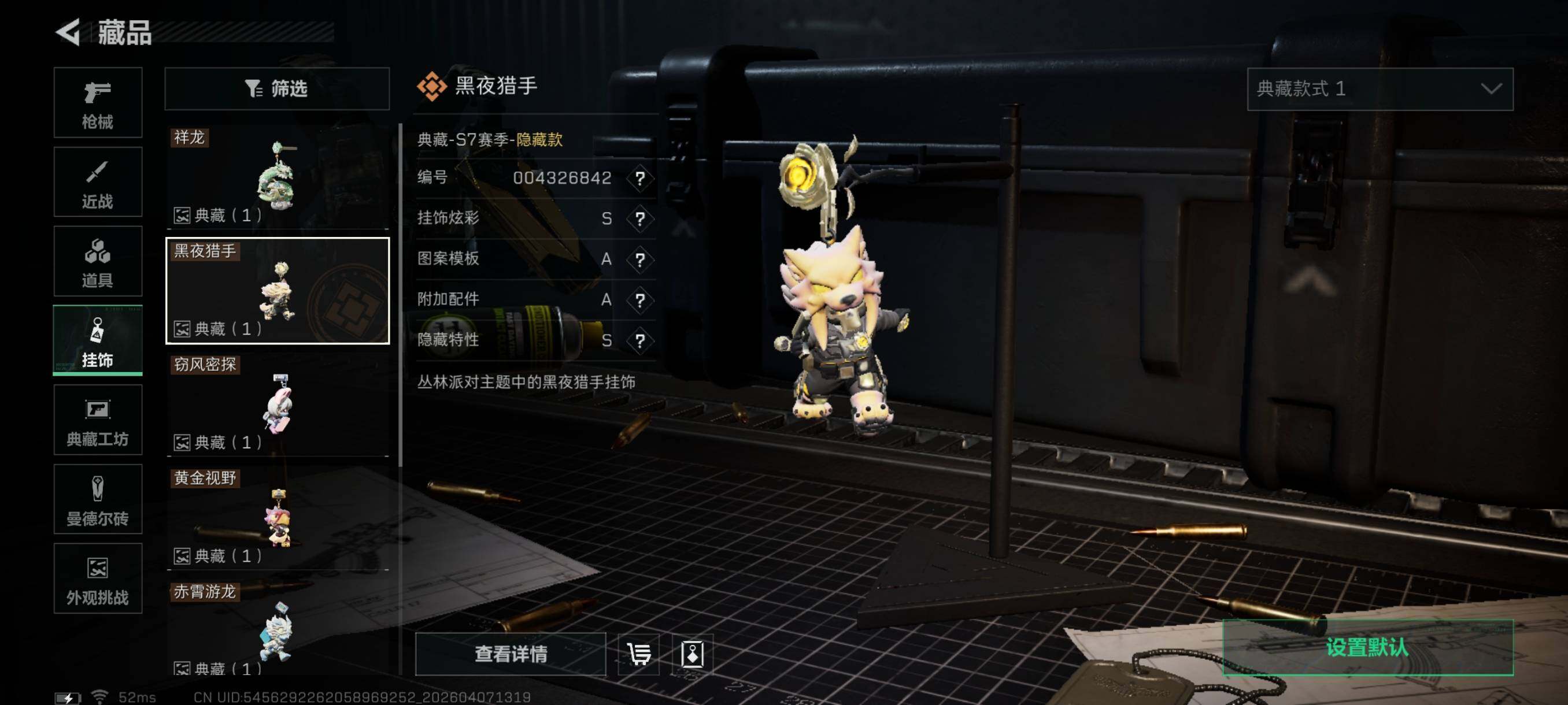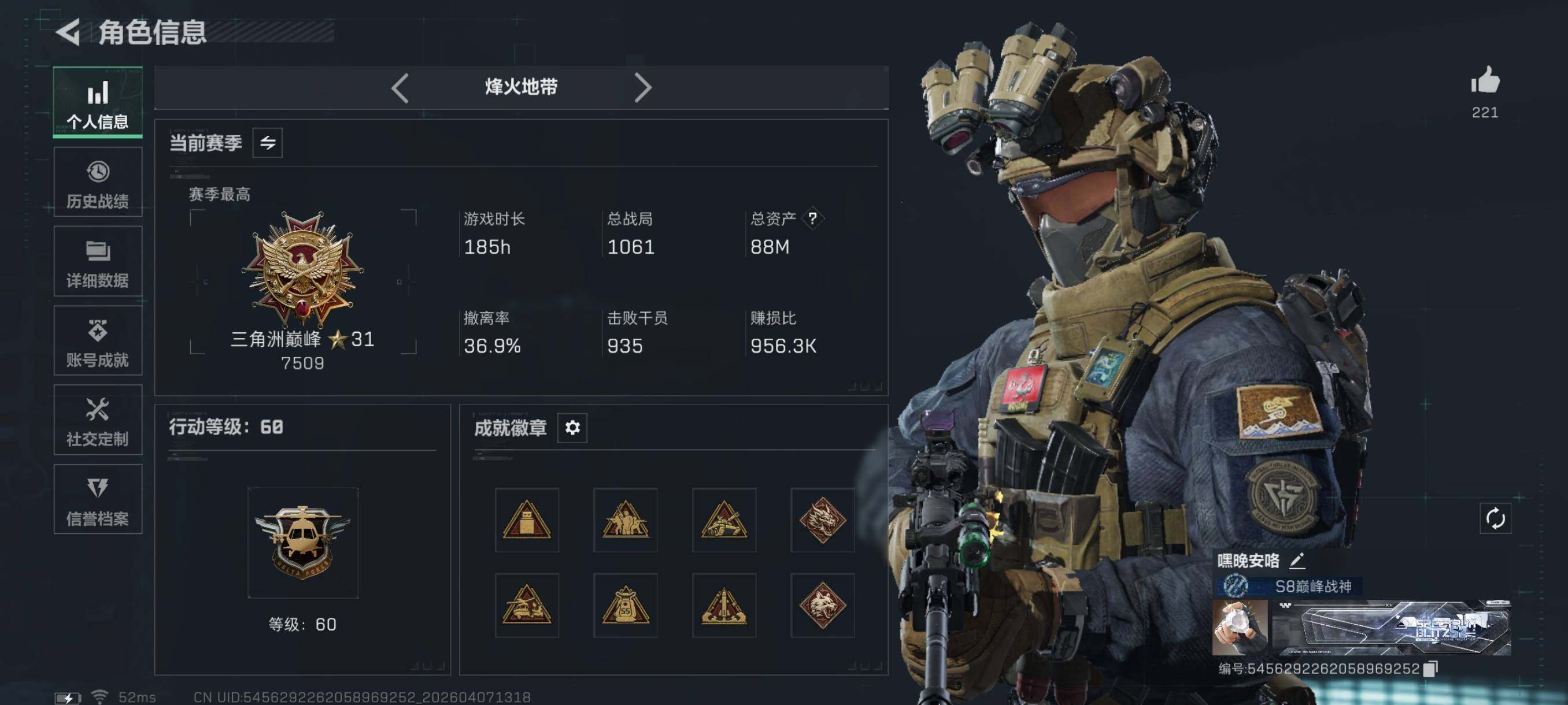 {特价出售}等级:60总资产:88M 纯币28725k 隐藏挂饰:2S黑夜猎手 3S余烬之影 红皮:蚀金玫瑰 凌霄戍卫 露娜联动 刀皮: 暗星 信条 北极星 砖皮: M7棱镜攻势优品C 特勤处:仓库7,训练满,靶场6