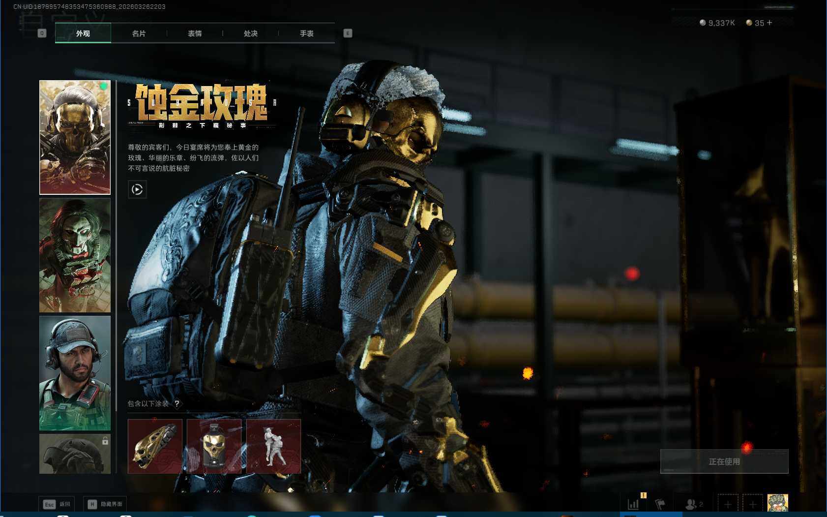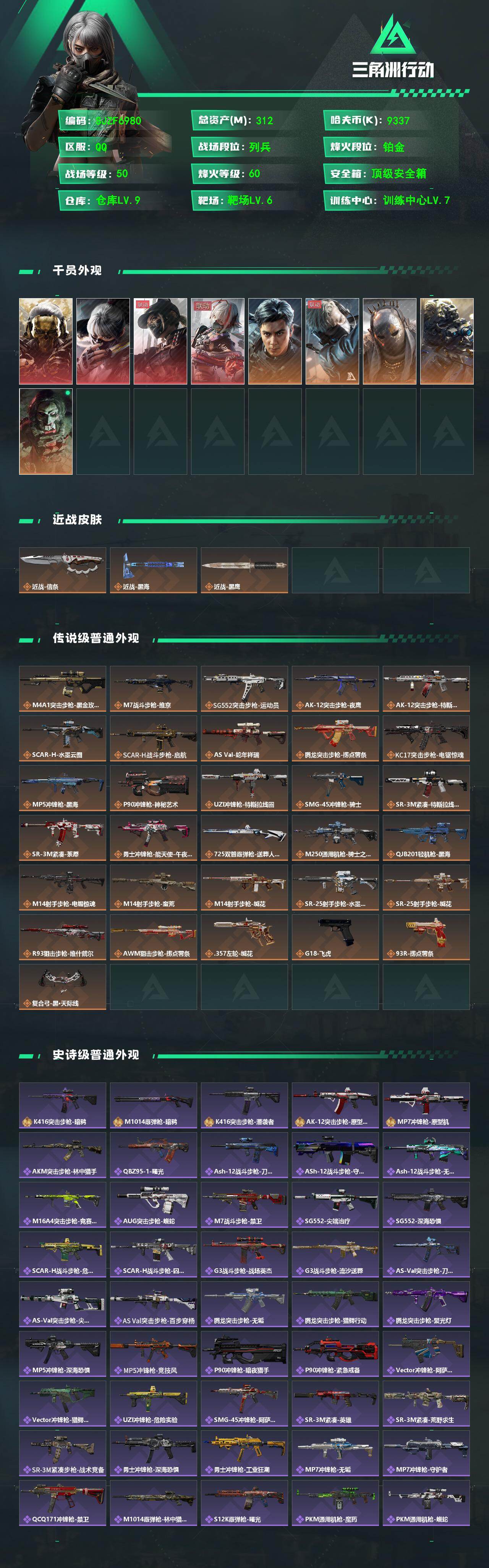 【SJZF6980】总资产(M):312M/哈夫币(K):9337K/哈夫币(K):9337K/传说枪皮数:31/全面战场等级:50_段位:列兵/烽火地带等级:60_段位:铂金/红狼-蚀金玫瑰/骇爪-水墨云图/露娜-黑·天际线/骇爪-维什戴尔/威龙-飞虎/蜂医-送葬人·无题密令/牧羊人-街头之王/无名-夜鹰/红狼-电锯惊魂/近战-信条/近战-黑海/近战-黑鹰/M4A1突击步枪-蚀金玫瑰/M7战斗