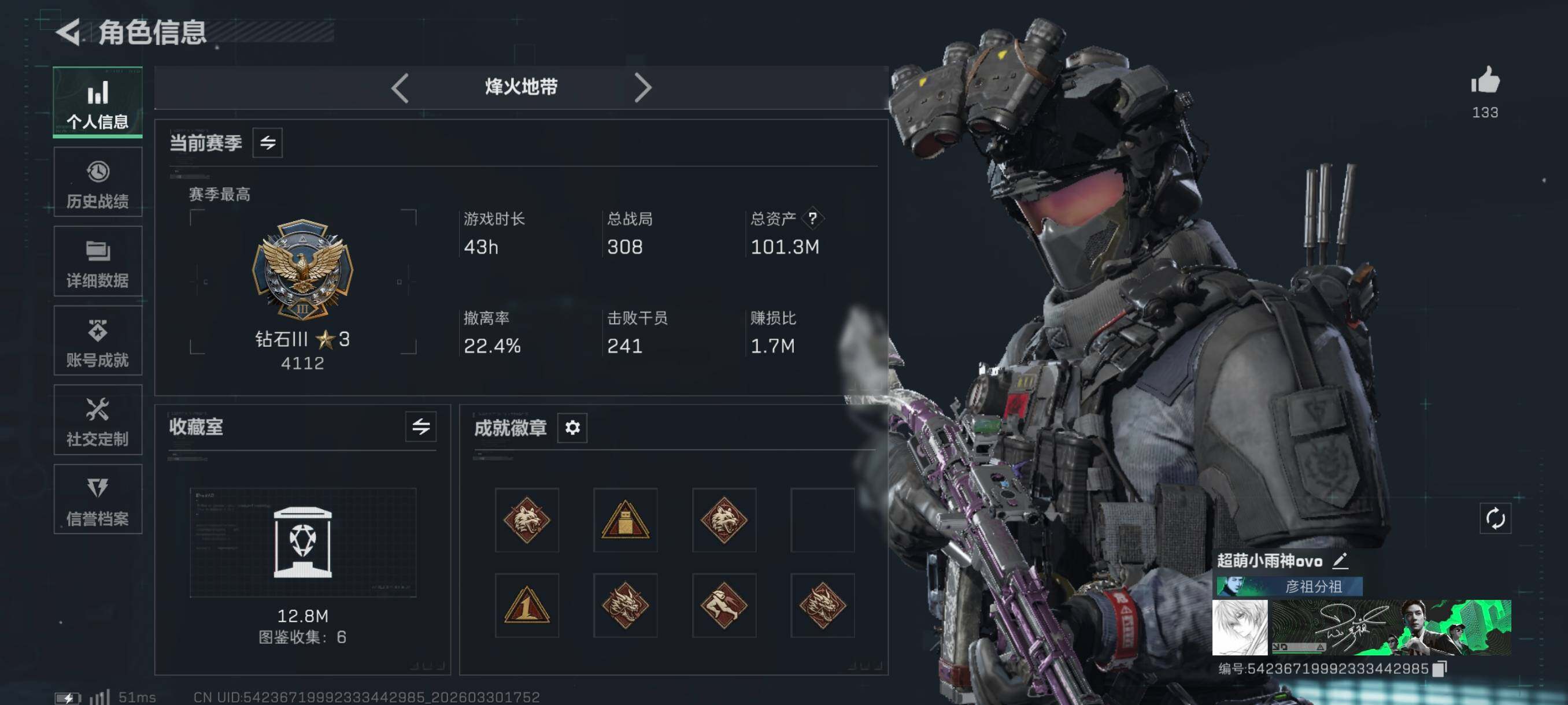 {特价出售}等级:60总资产101.3m 流动73.2m 纯币149126 人物皮 饰金玫瑰 威龙全皮 街头之王 麦晓雯全皮 刀皮 北极星 怜悯 黑海 信条 枪皮 优品a巨浪 挂坠 2s 毁灭之源 紫色 特勤仓库7级 体力7级 负重6级