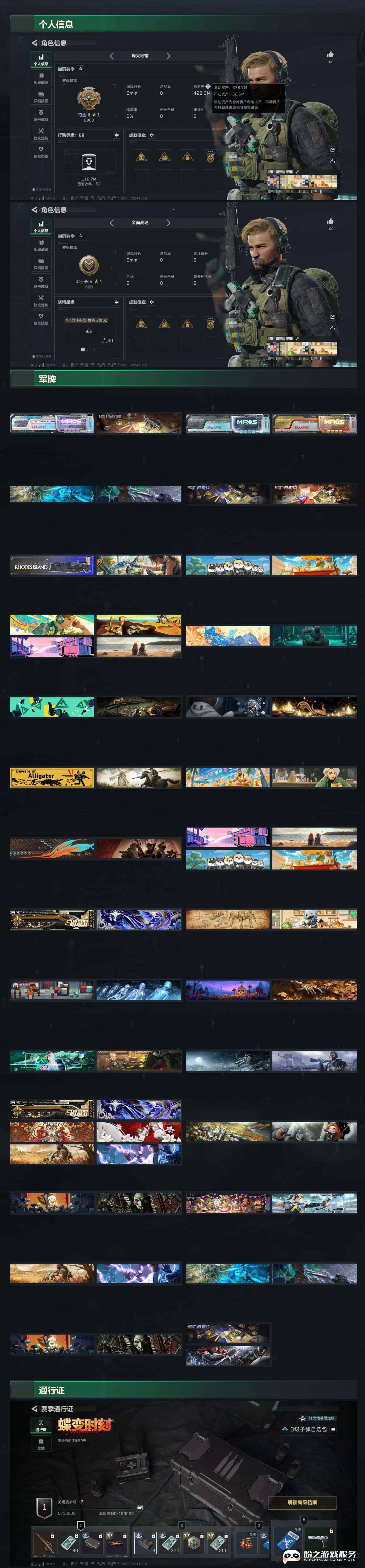 {特价出售}{可二次实名}等级:60总资产:427.9M 纯币797594 隐藏挂饰: 2S黑夜猎手,3S肘击王,2S余烬之影(2个) 红皮:骇爪-维什戴尔/露娜-黑天际线/红狼-蚀金玫瑰/蛊-能天使午夜邮差 刀皮: 近战-信条/近战-北极星 砖皮:AS Val突击步枪-悬赏令(极品S)/MP7冲锋枪-电玩高手S2白钻(极品B)/腾龙突击步枪-气象感应(极品C)/QBZ95-1突击步枪-王牌之剑