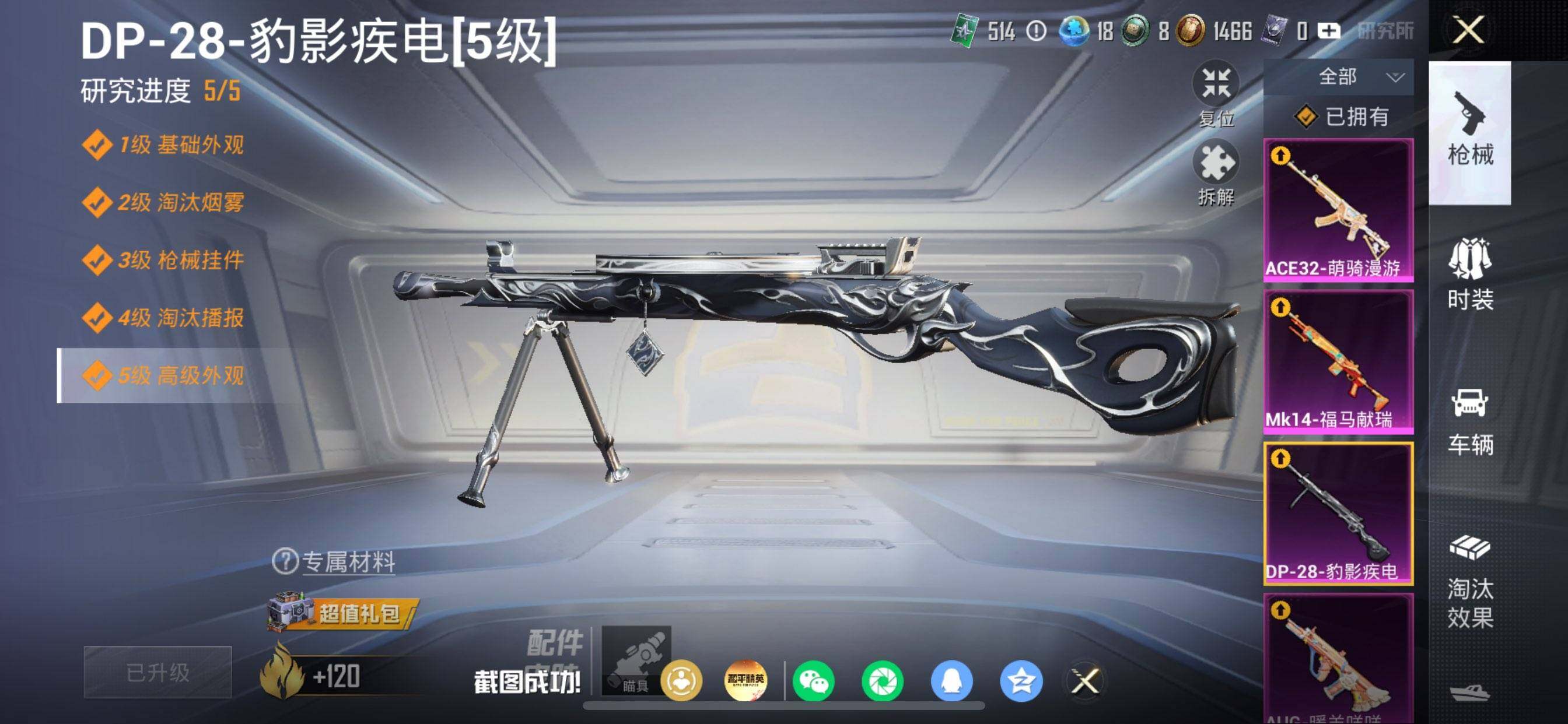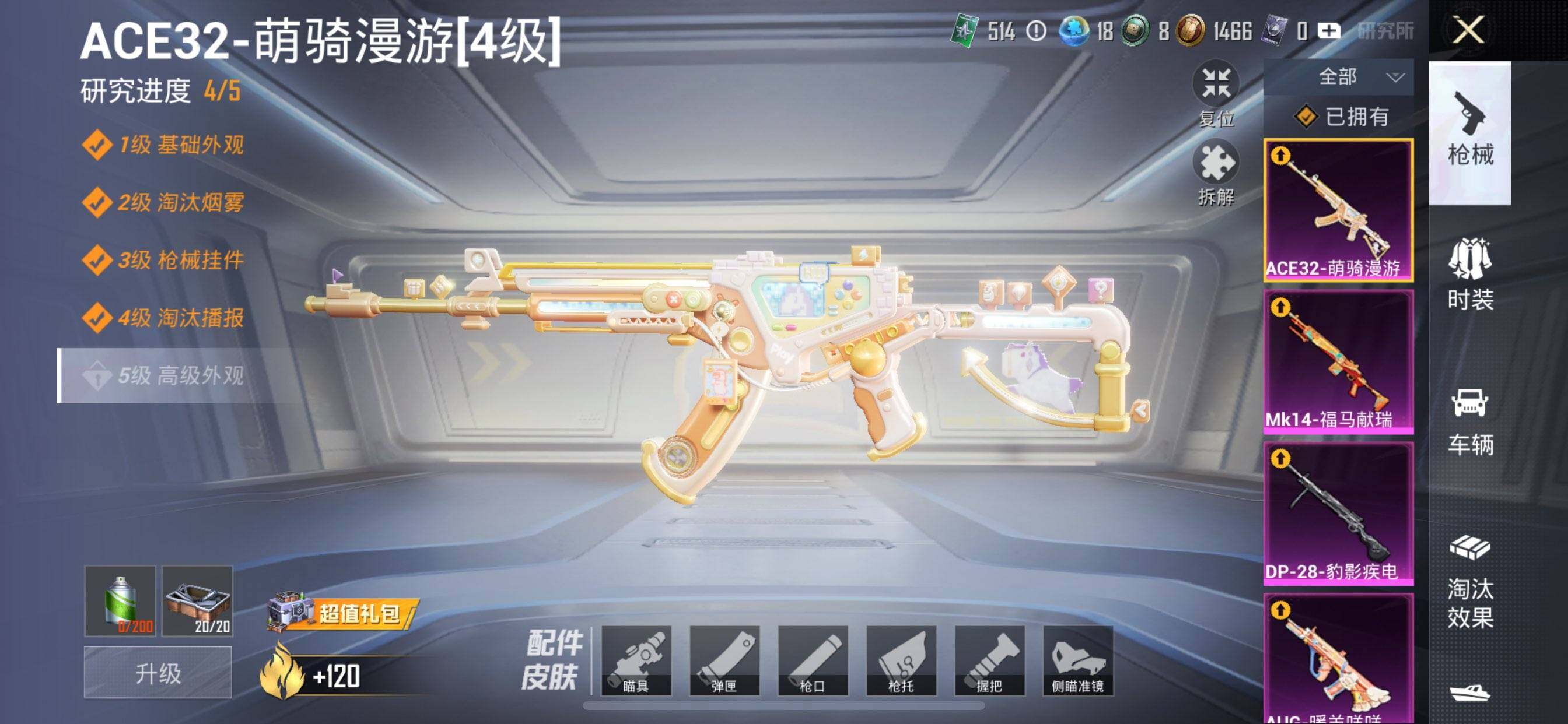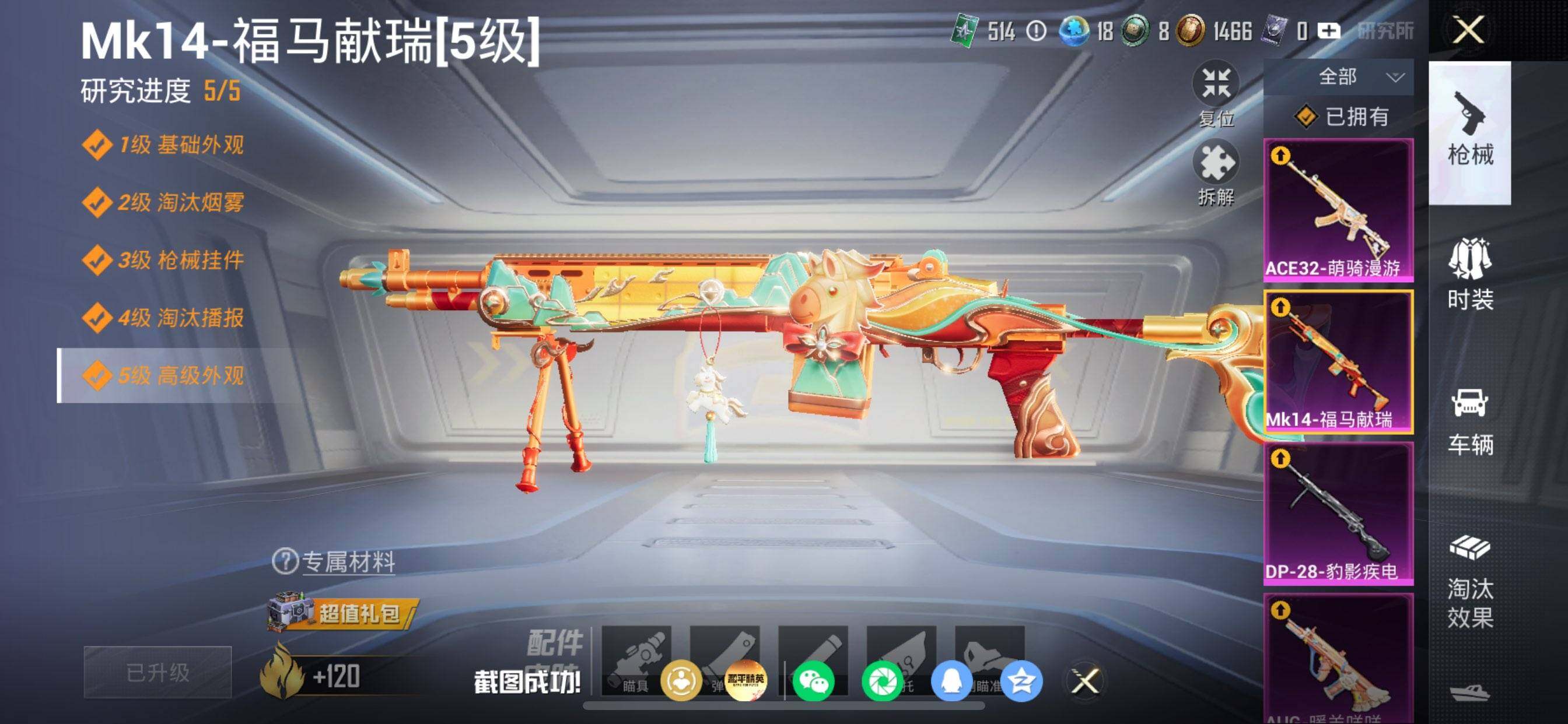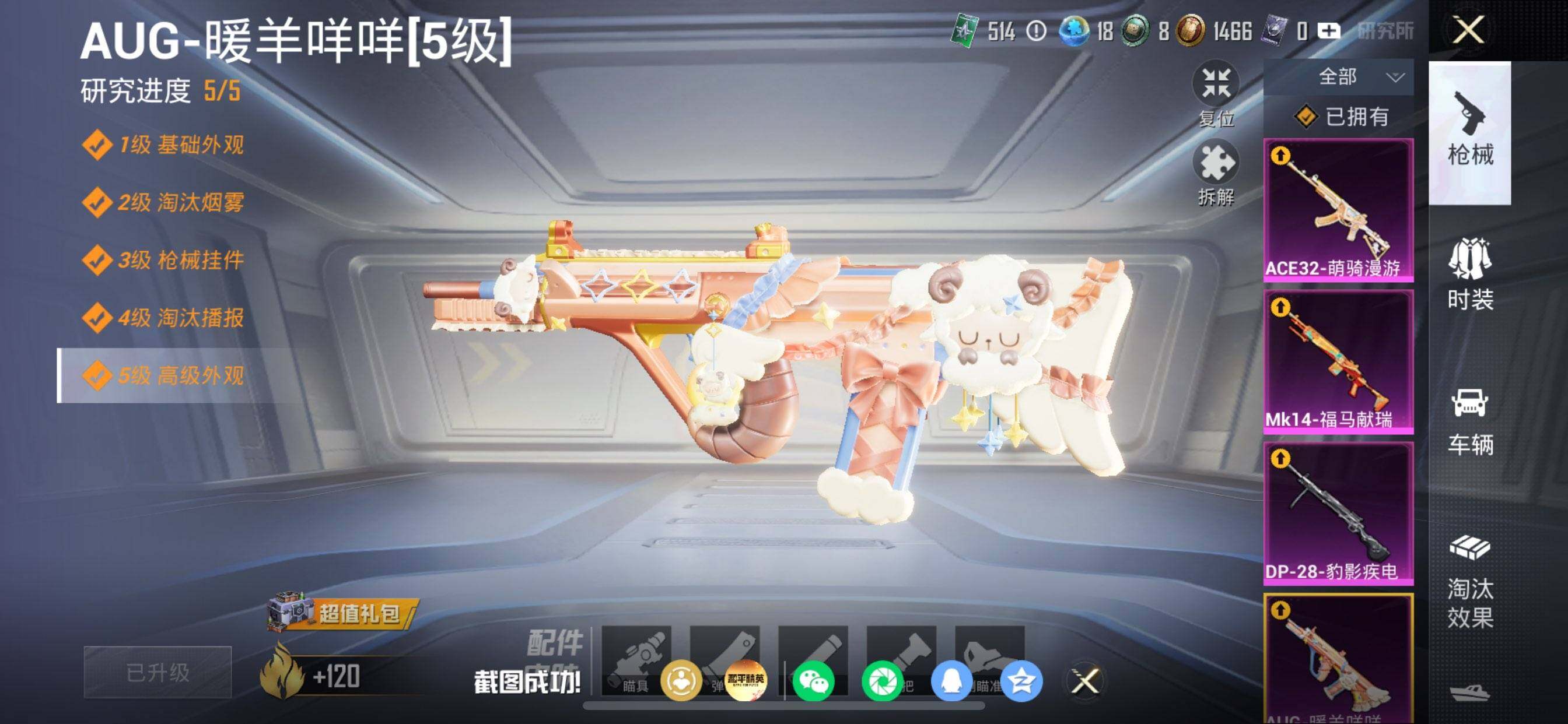 【粉色枪皮等级】:GROZA-镜光银凌(五级),AUG-暖羊咩咩(五级),ACE32-萌骑漫游(四级),Kar98K-巳巳如意(五级),Mk14-福马献瑞(五级),DP-28-豹影疾电(五级)