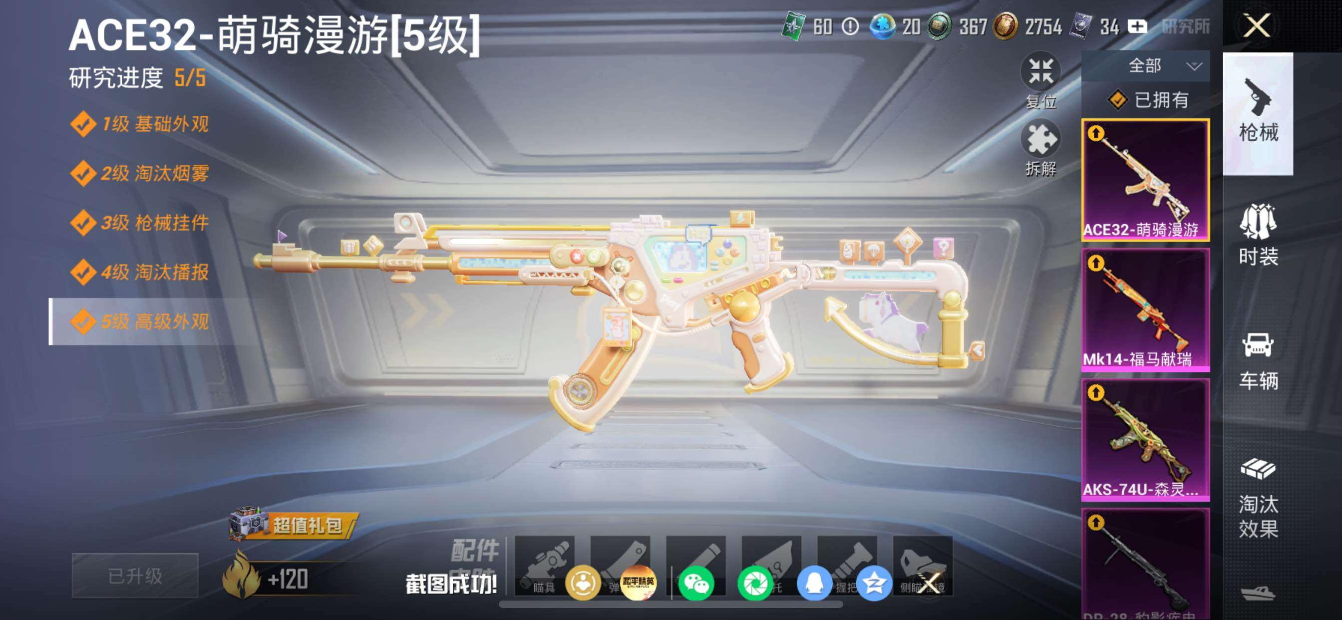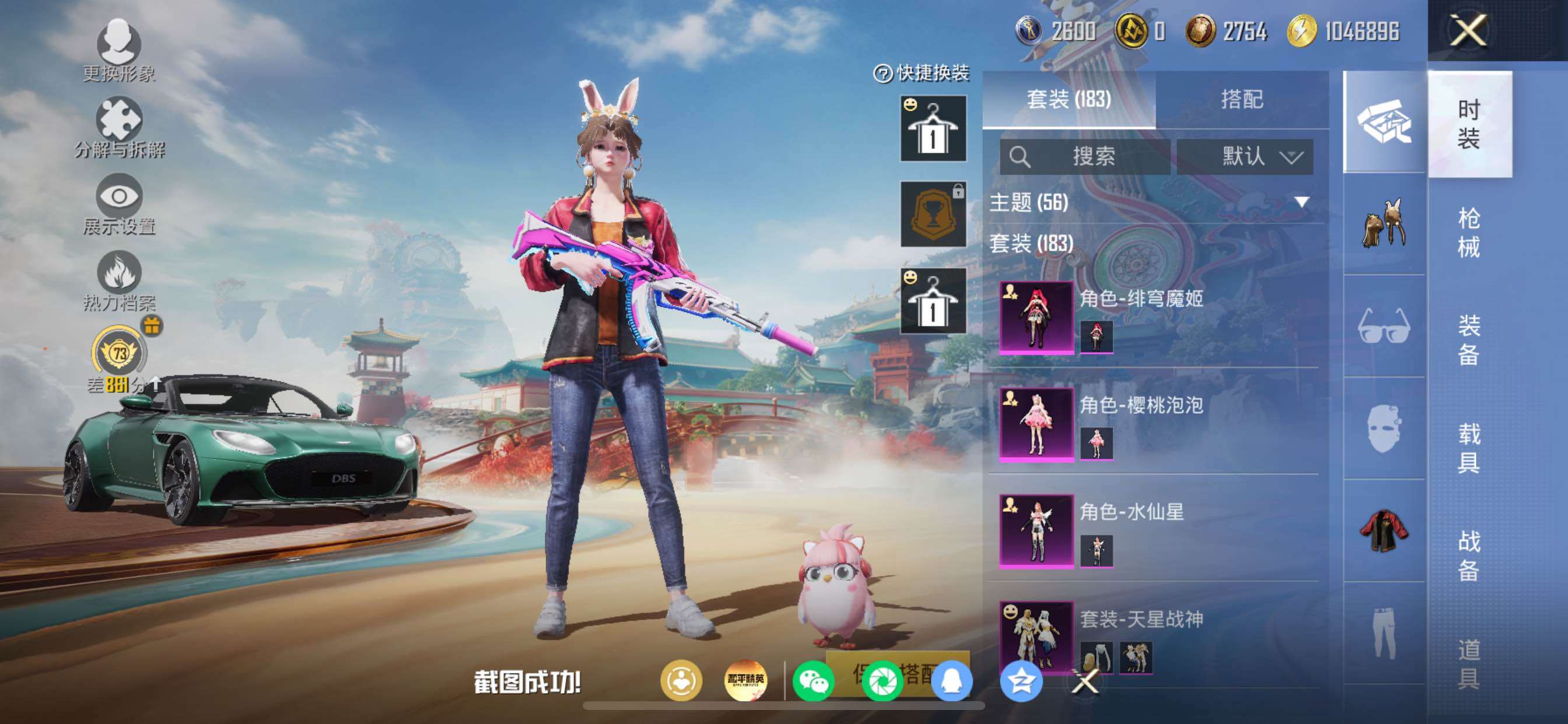 苹果 手Q-11粉装-11特效枪-1载具-1粉色飞行器-86767热力值-15王牌印记-183套装-263枪皮