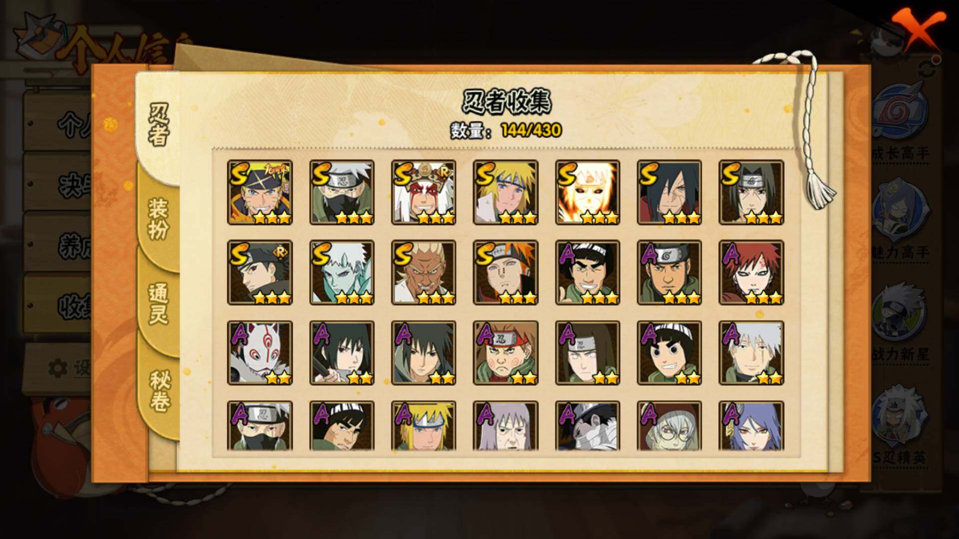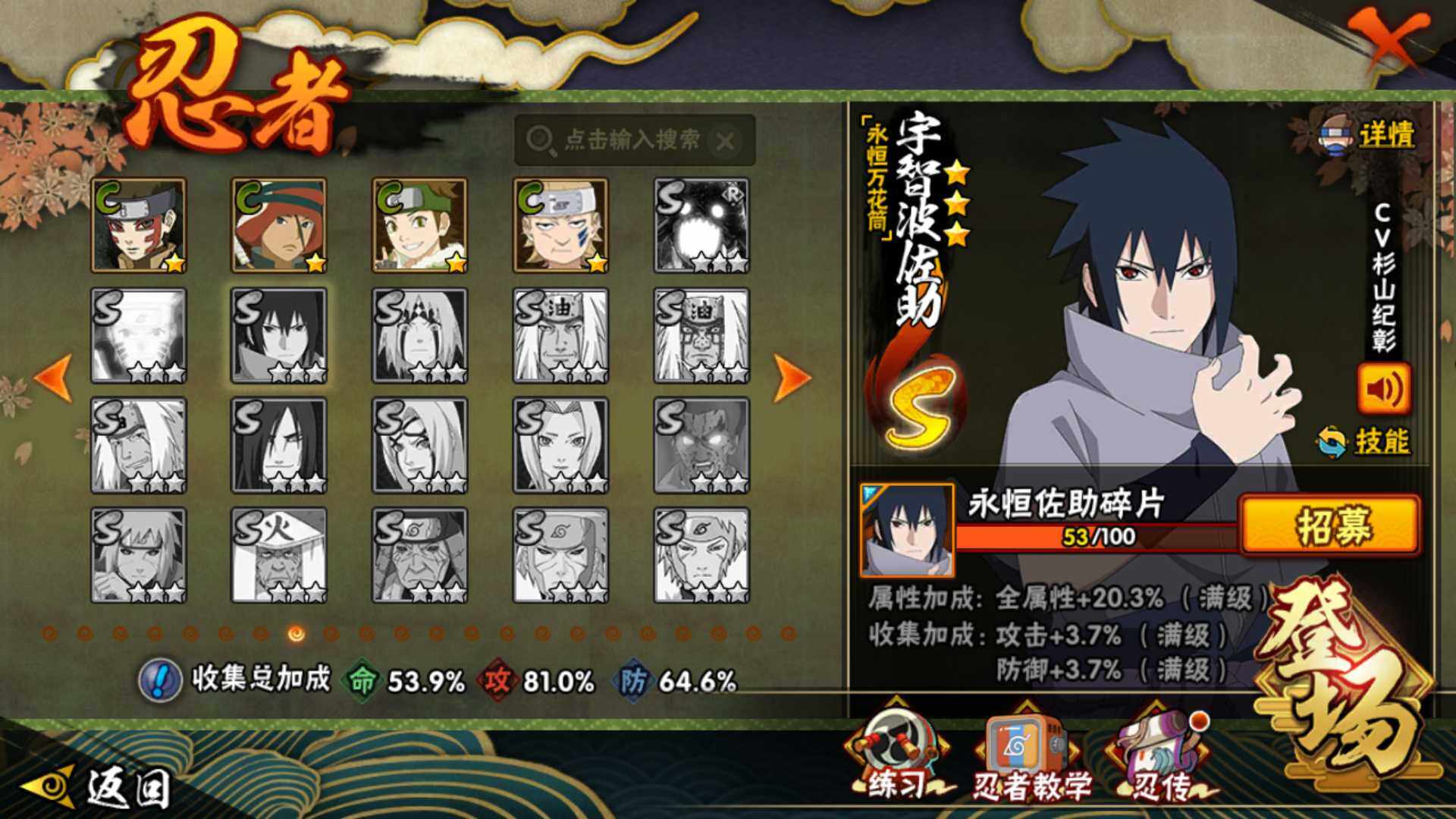 【S级忍者】:宇智波斑「秽土转生·解」(3星),艾「忍界大战」(3星),宇智波鼬「须佐能乎」(3星),宇智波止水「须佐能乎」(3星),旗木卡卡西「须佐能乎」(3星),自来也「舞之豪杰」(3星),波风水门(3星)