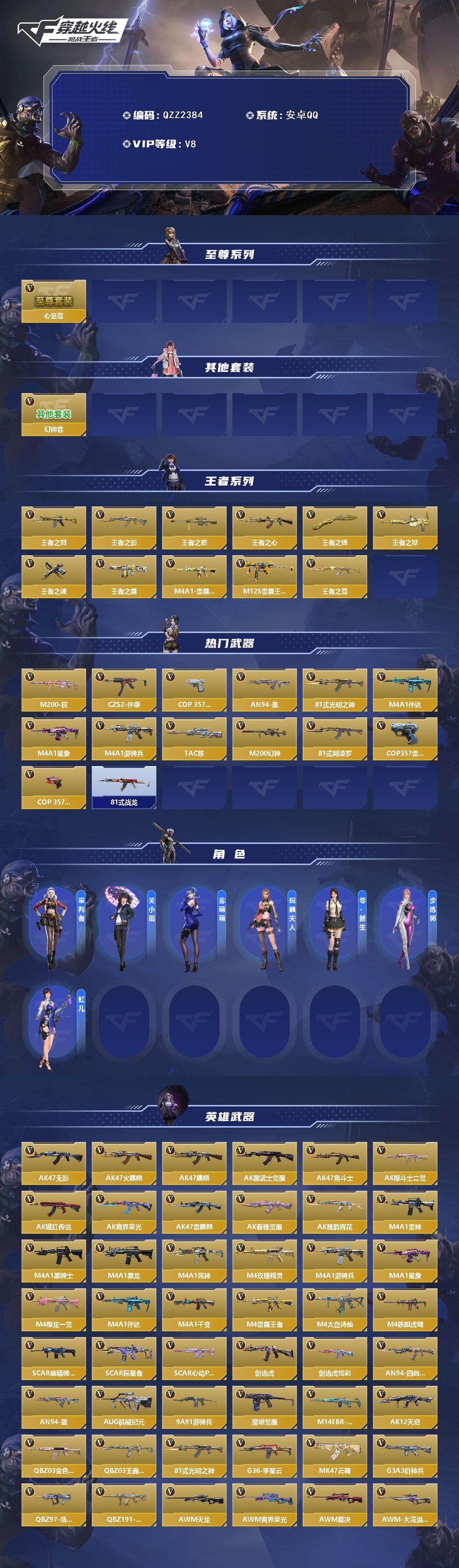 【QZZ2384】VIP8/274V/心至尊/幻神套/王者之戮/王者之影/王者之怒/王者之心/王者之锋/王者之狱/王者之魂/王者之霆/M4A1-雷霆王者/M12S-雷霆王者/王者之尊/M200-权/CZS2-仲康/COP 357-安琪拉/AN94-盖/81式-光明之神/M4A1-仲达/M4A1-星象/M4A1-游骑兵/TAC-慈/M200-幻神/81式-阿波罗/COP 357-雷霆/COP 35