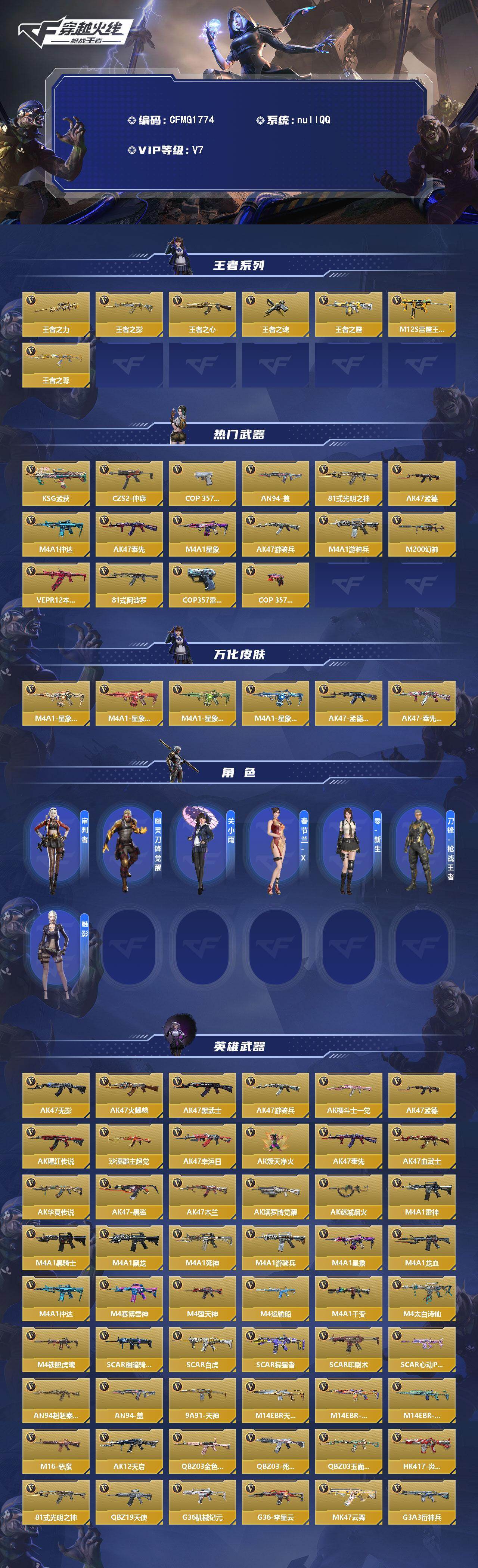 【CFMG1774】VIP7/278V/王者之力/王者之影/王者之心/王者之魂/王者之霆/M12S-雷霆王者/王者之尊/KSG-孟获/CZS2-仲康/COP 357-安琪拉/AN94-盖/81式-光明之神/AK47-孟德/M4A1-仲达/AK47-奉先/M4A1-星象/AK47-游骑兵/M4A1-游骑兵/M200-幻神/VEPR12-本初/81式-阿波罗/COP 357-雷霆/COP 357-堕