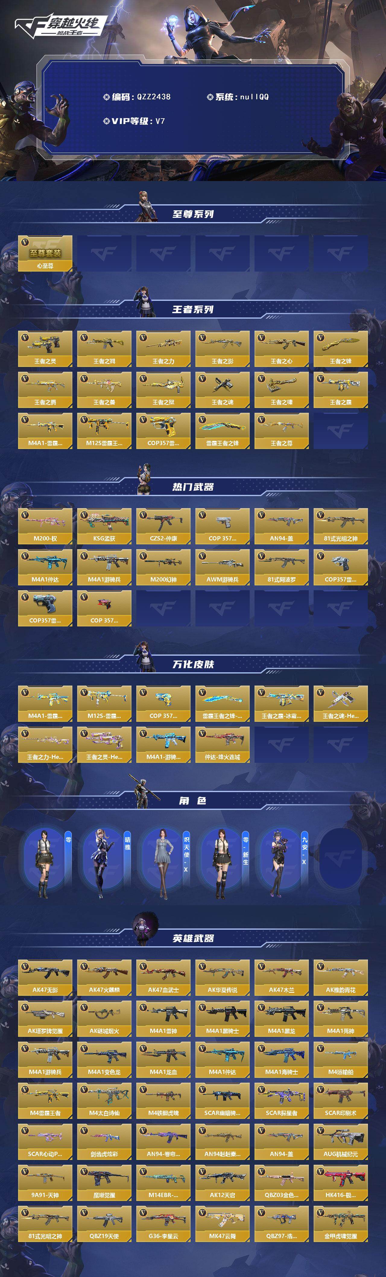 【QZZ2438】VIP7/286V/心至尊/王者之灵/王者之戮/王者之力/王者之影/王者之心/王者之锋/王者之腾/王者之兽/王者之狱/王者之魂/王者之啸/王者之霆/M4A1-雷霆王者/M12S-雷霆王者/COP 357-雷霆王者/雷霆王者之锋/王者之尊/M200-权/KSG-孟获/CZS2-仲康/COP 357-安琪拉/AN94-盖/81式-光明之神/M4A1-仲达/M4A1-游骑兵/M200
