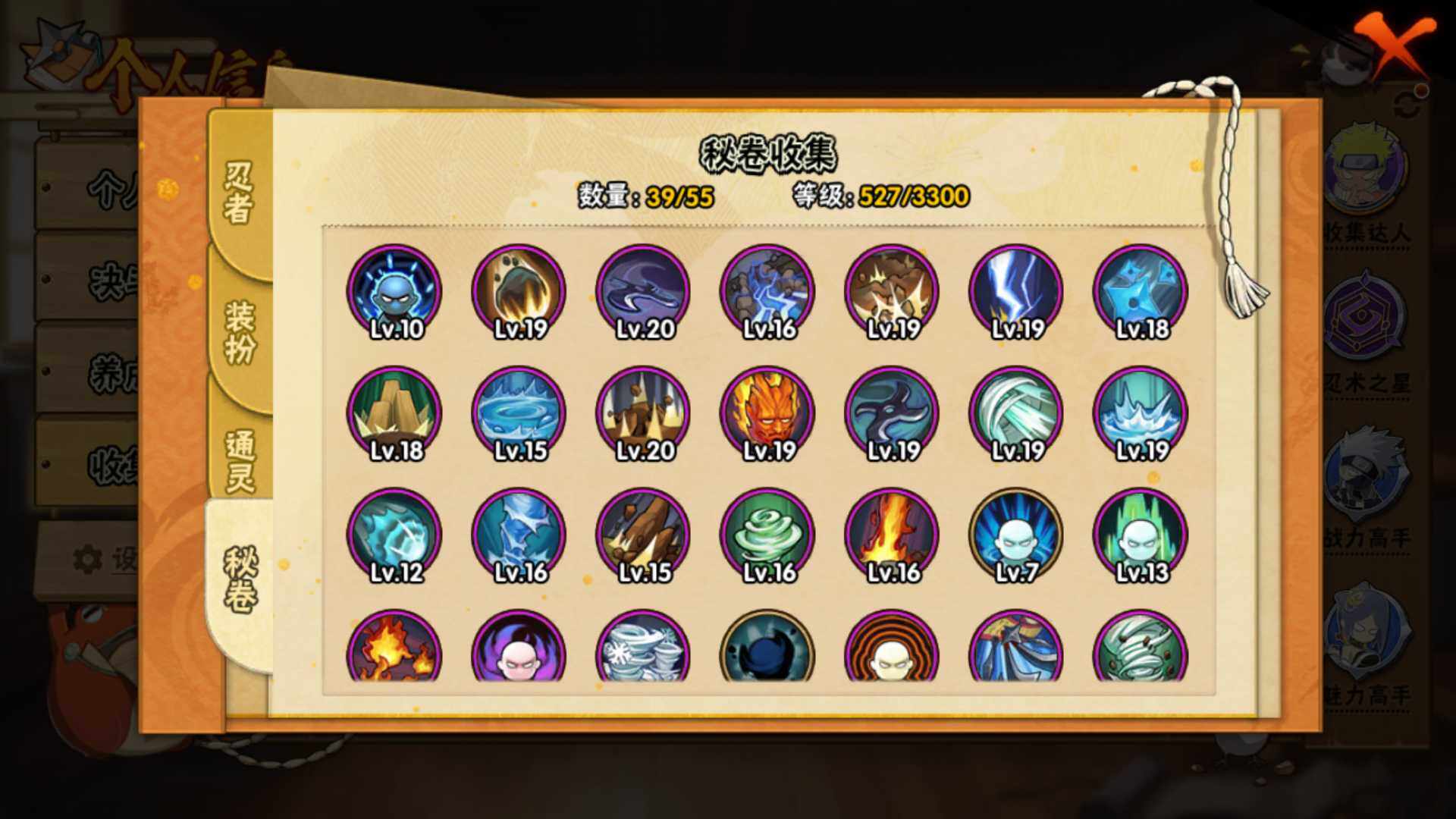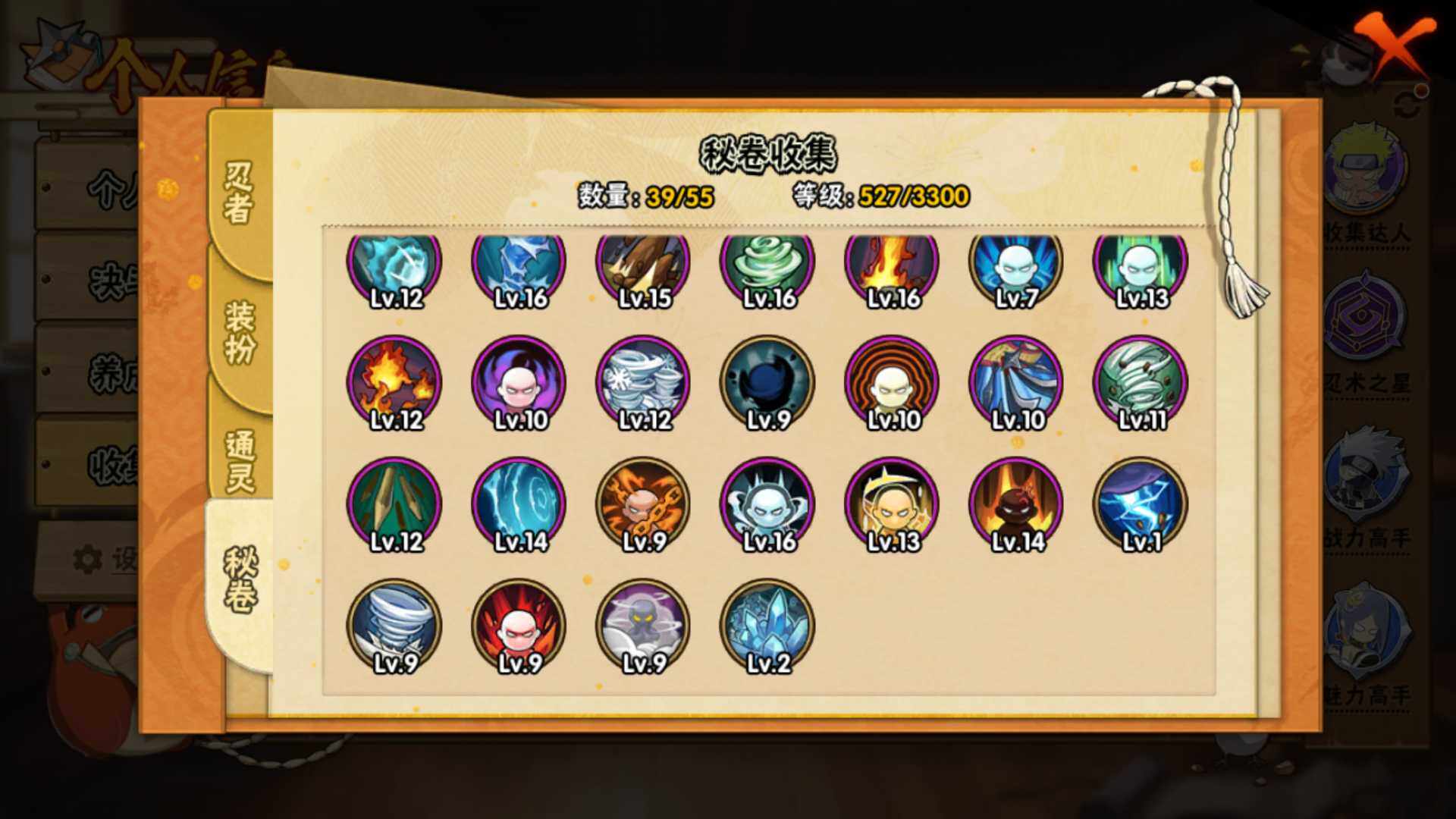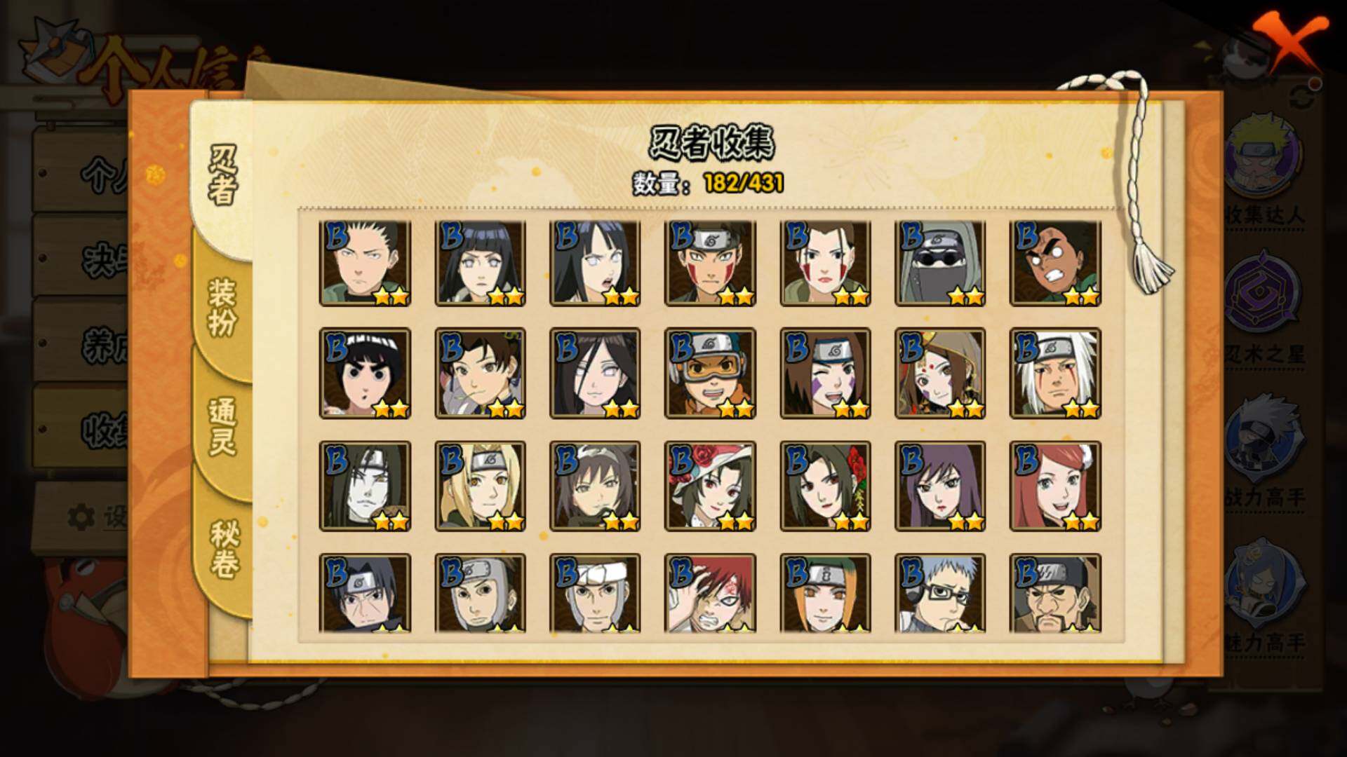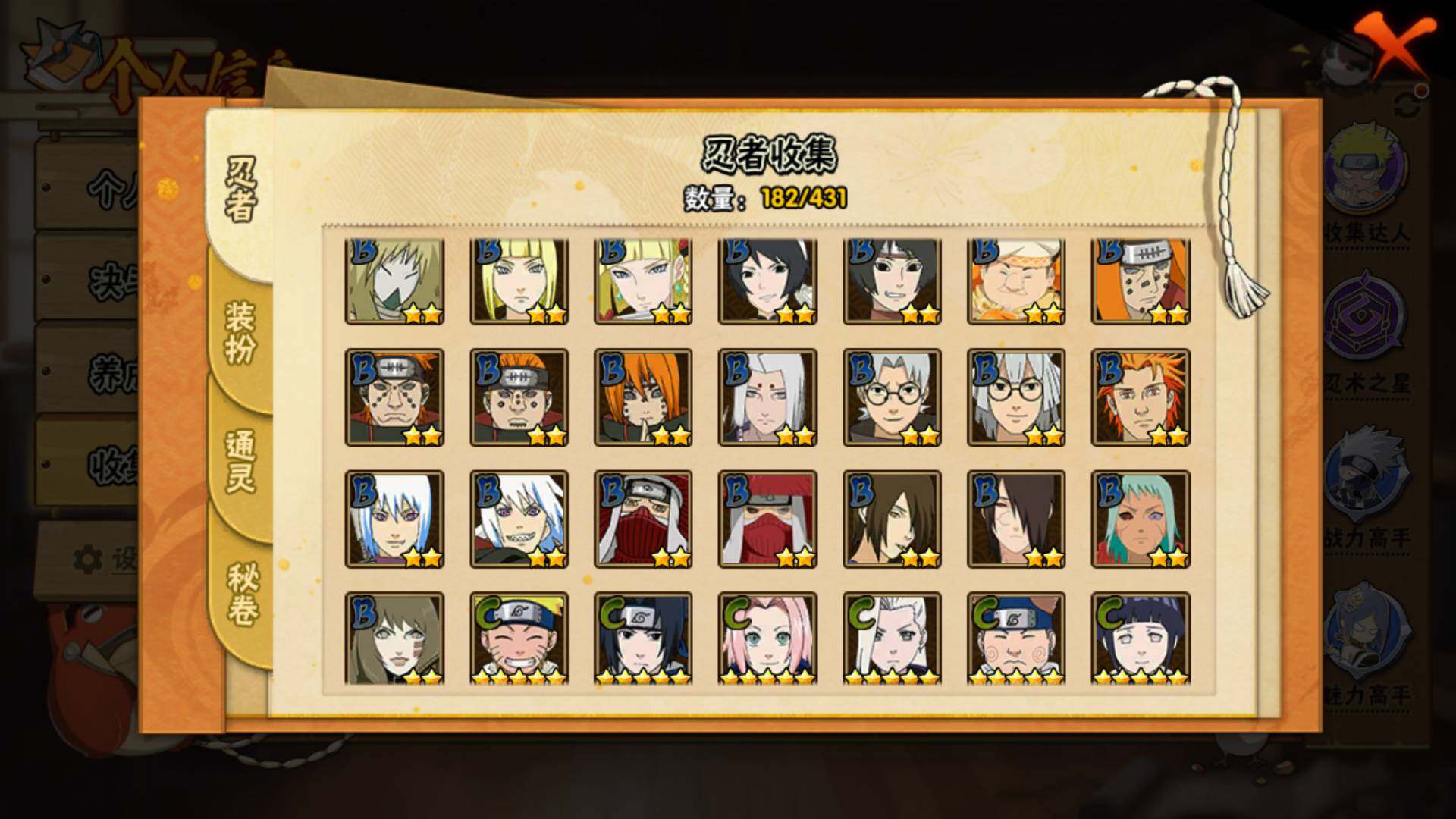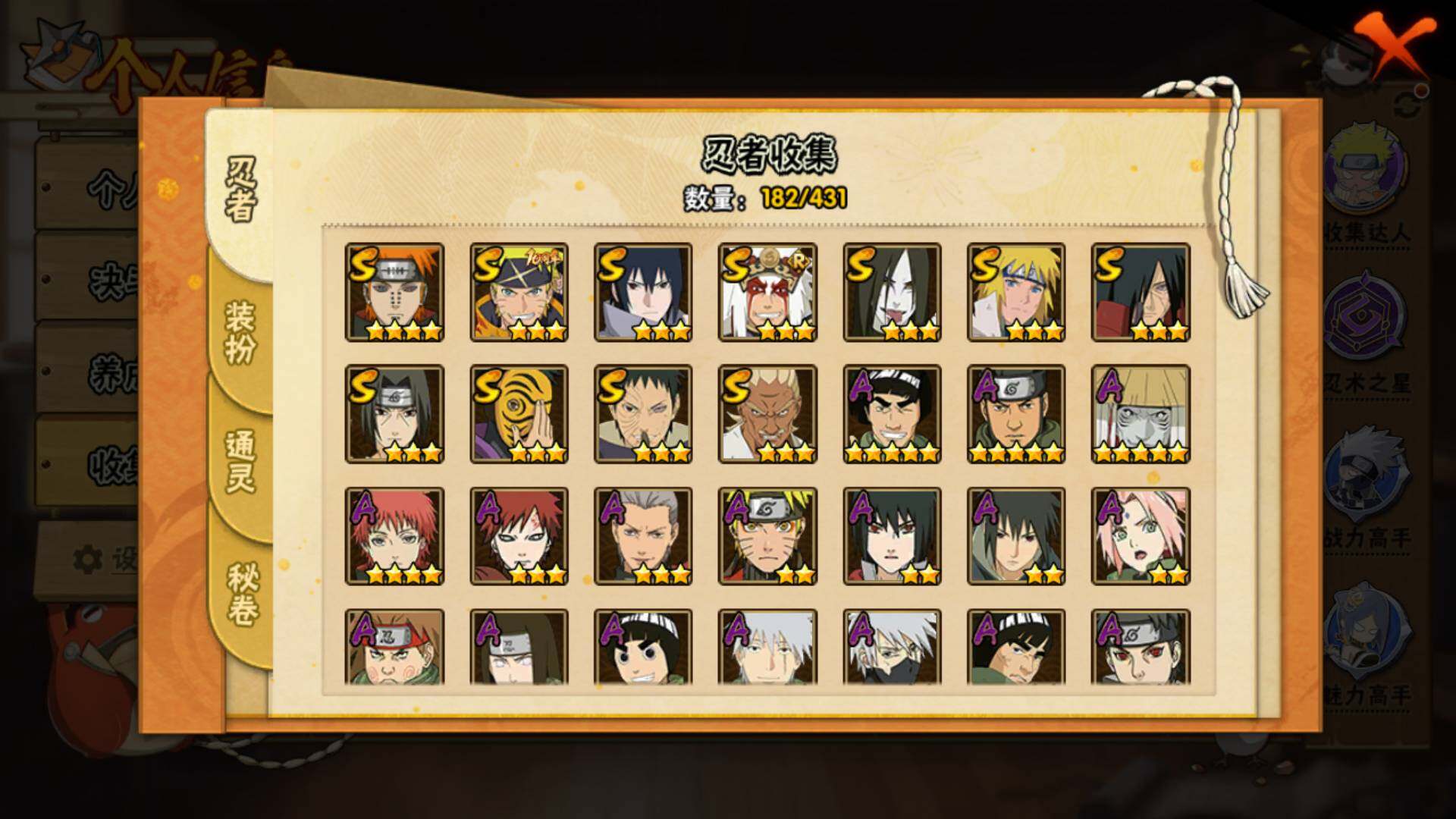 【S级忍者】:宇智波斑「秽土转生」(3星),宇智波带土「忍界大战」(3星),艾「忍界大战」(3星),宇智波鼬「须佐能乎」(3星),自来也「舞之豪杰」(3星),大蛇丸(3星),波风水门