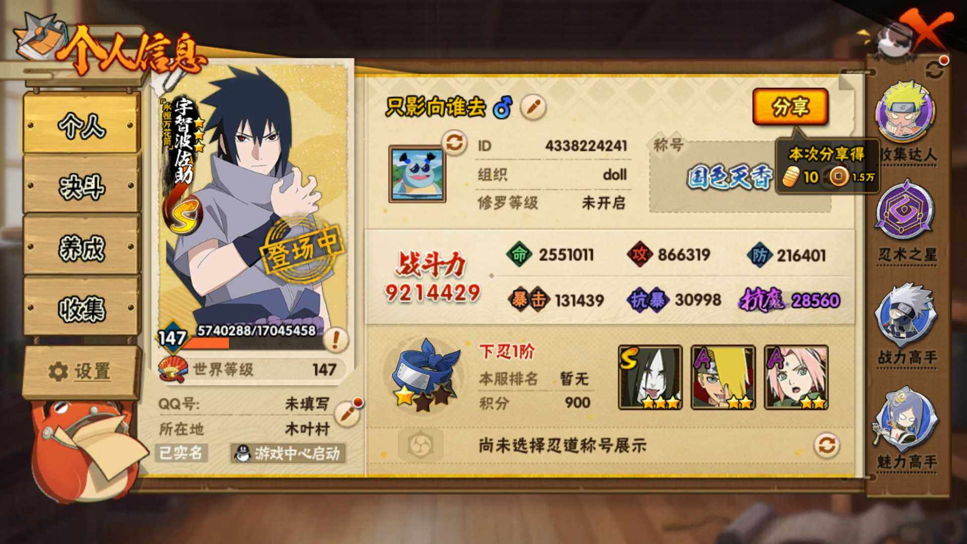 (可免费转苹果)v9 11S 33A 921w战力 传说自来也61片 纲手54片 死门凯53片 四代目雷影86片 热门A忍:侠隐大野木 夏日限定宇智波鼬 1个主场景:博人传 39张招募券 6626金币 YY2122