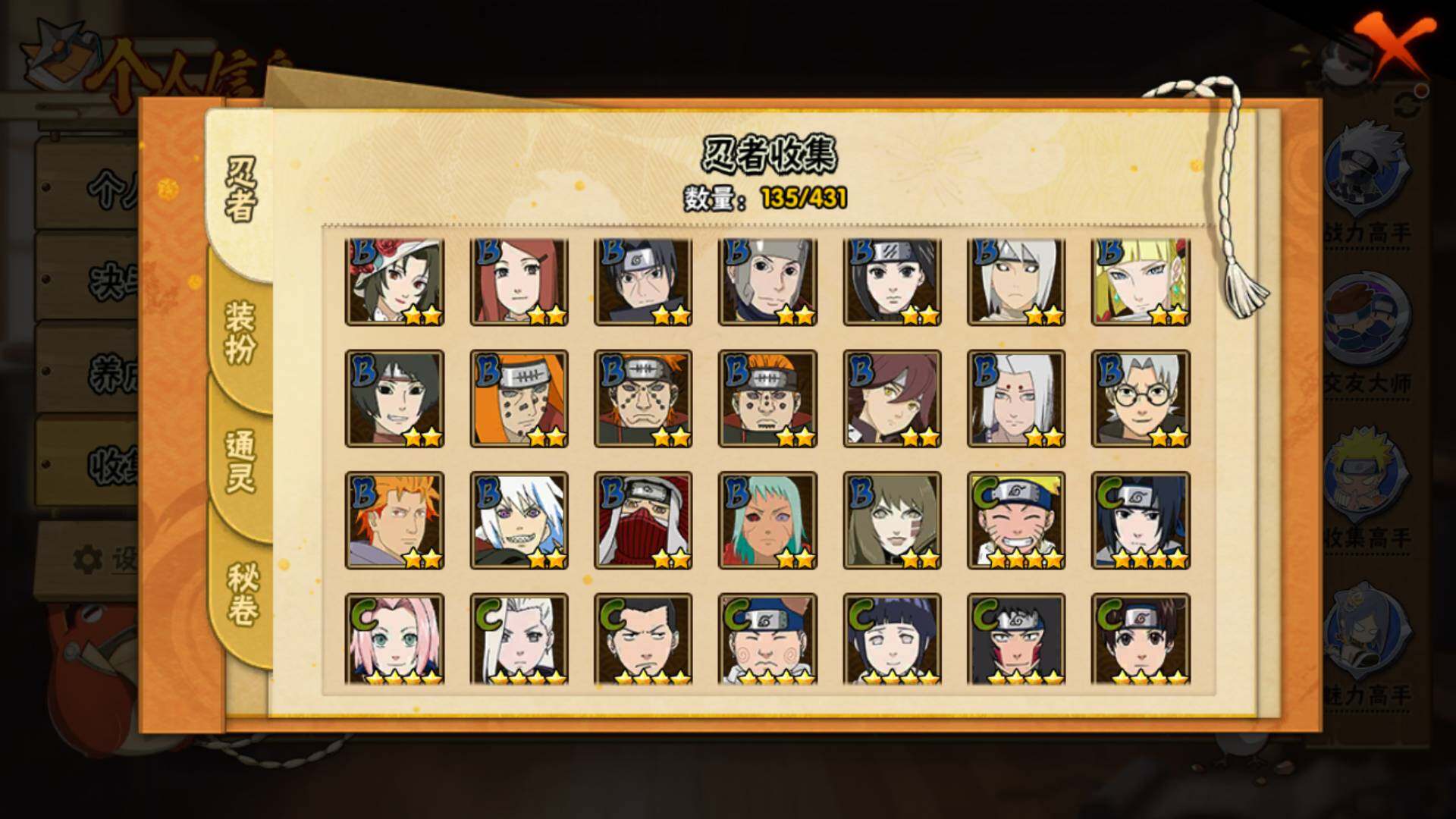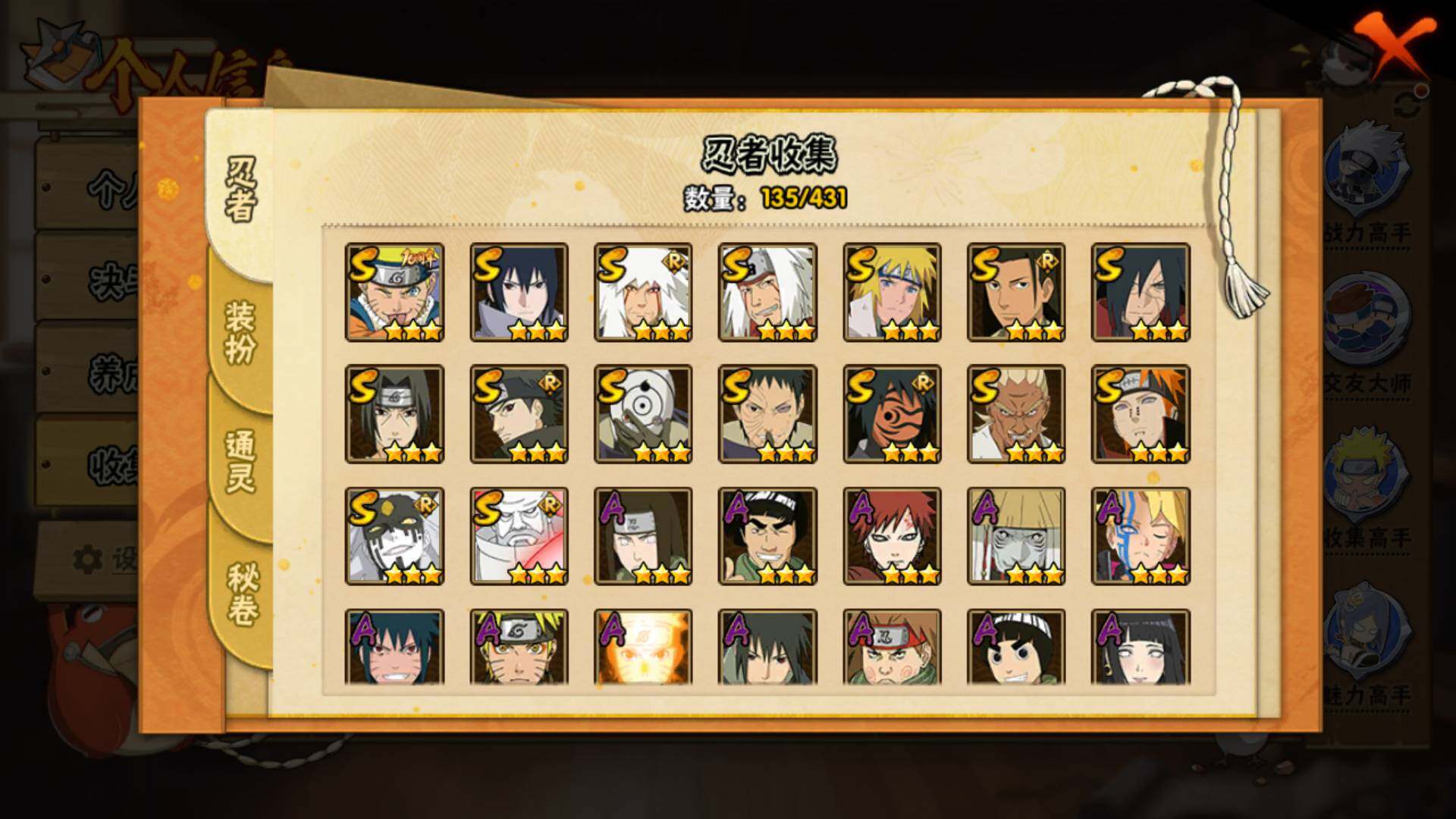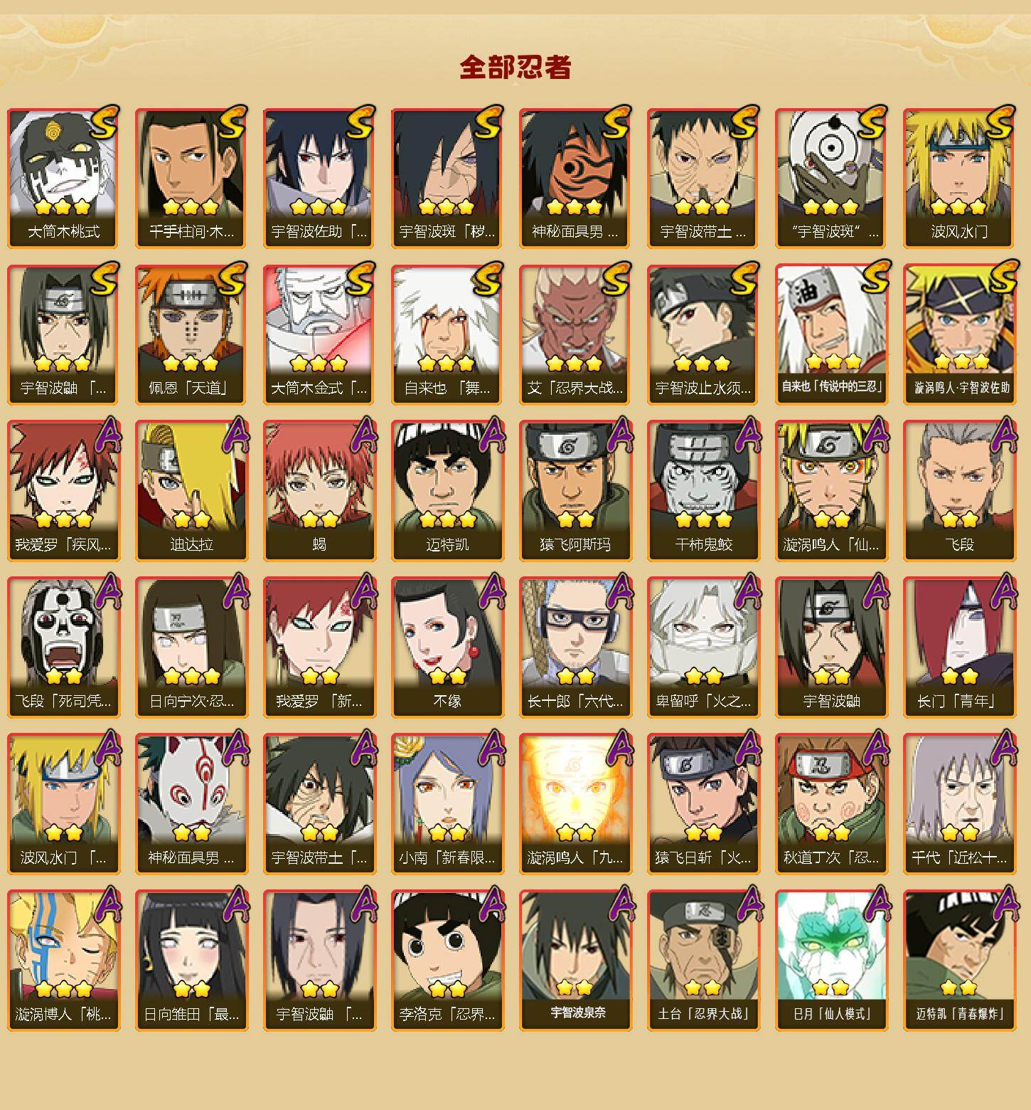 【S级忍者】:宇智波斑「秽土转生·解」(3星),宇智波带土「忍界大战」(3星),艾「忍界大战」(3星),宇智波鼬「须佐能乎」(3星),宇智波止水「须佐能乎」(3星),千手柱间「木叶创立」(3星),自来也「舞之豪杰」(3星),自来也「传说中的三忍」(3星),波风水门(3星),神秘