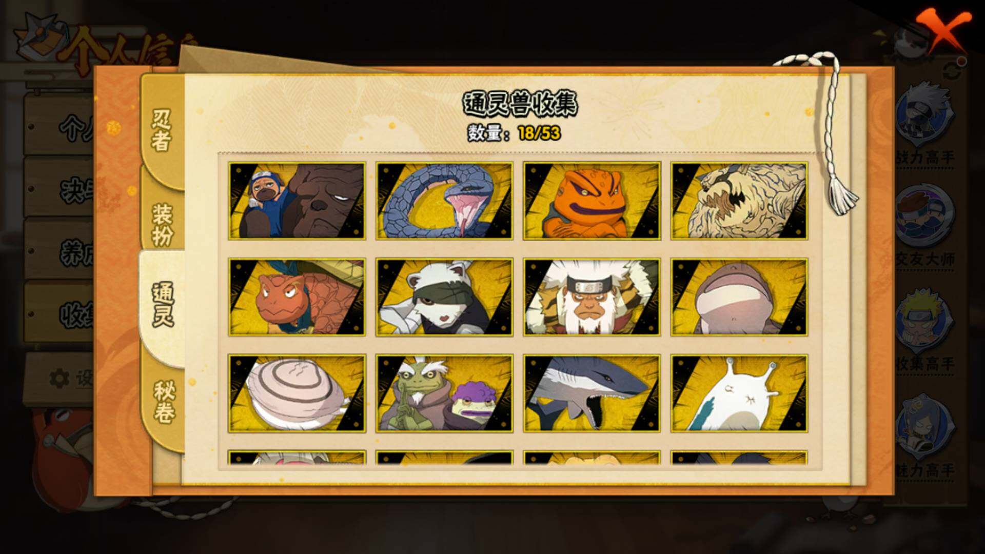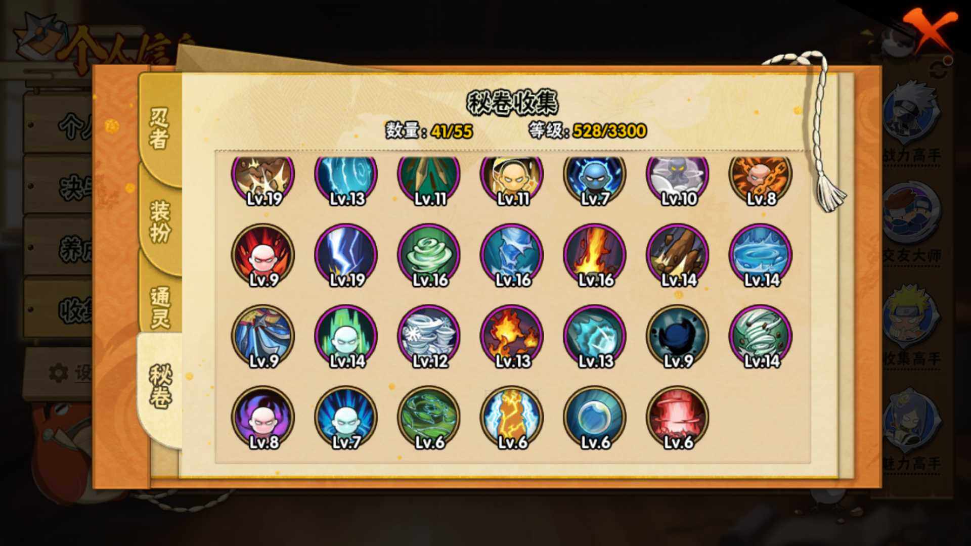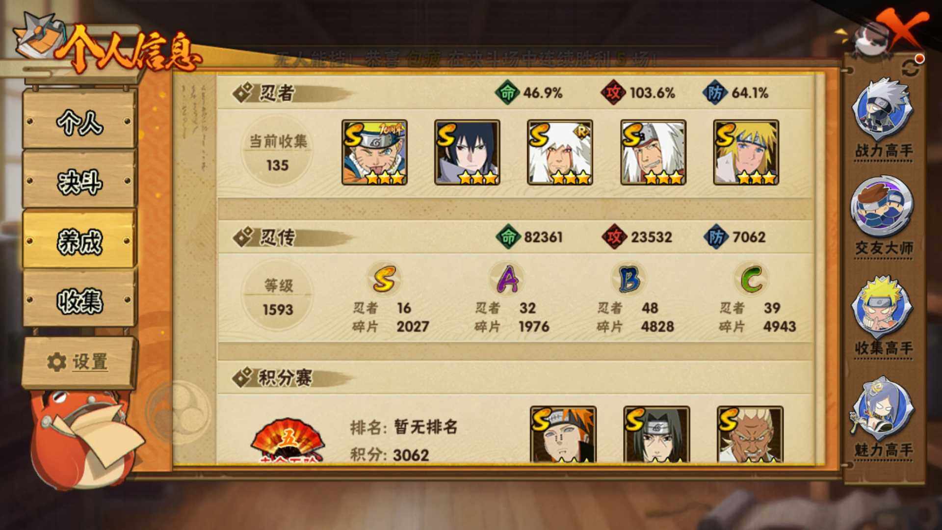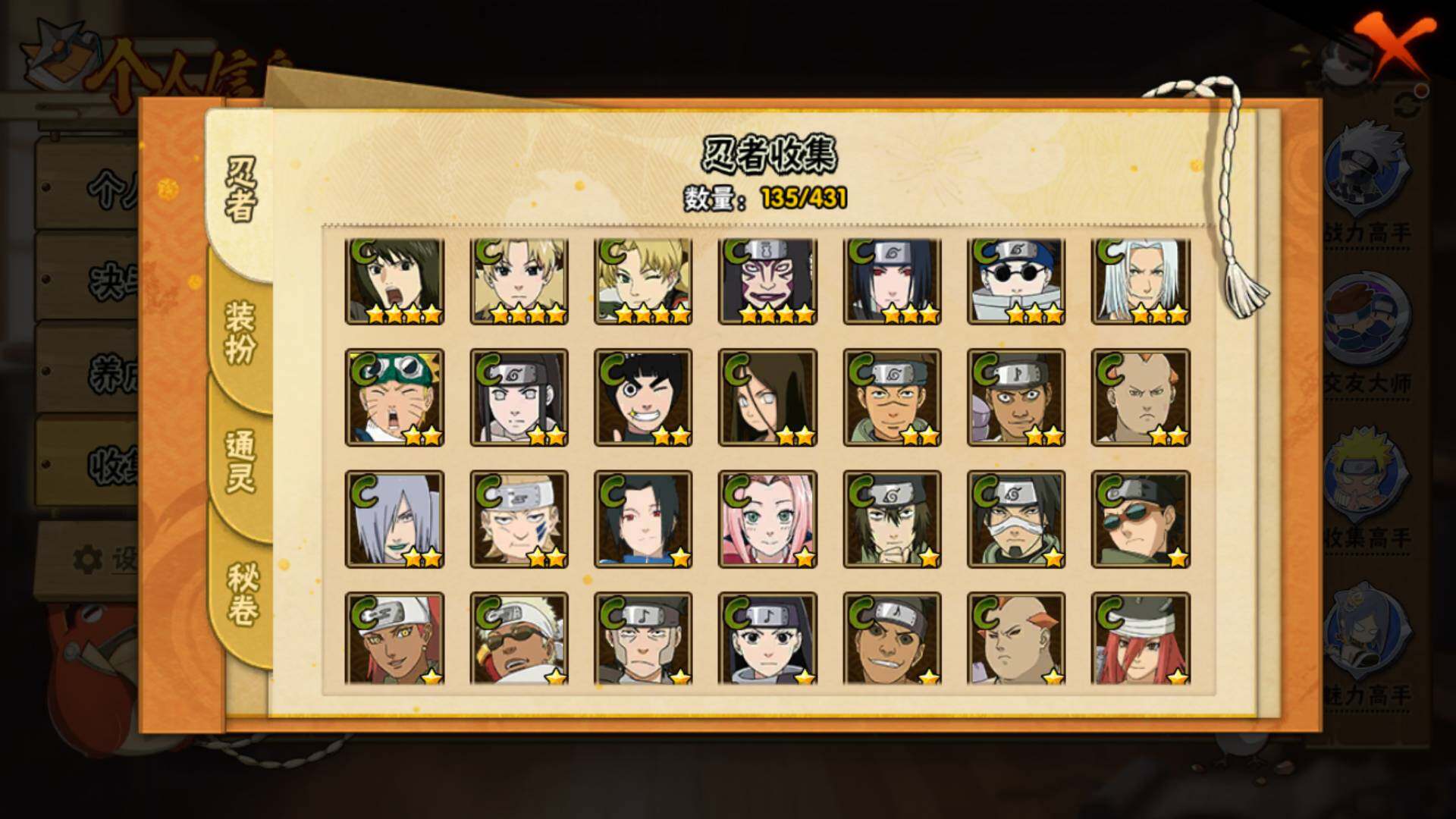 【S级忍者】:宇智波斑「秽土转生·解」(3星),宇智波带土「忍界大战」(3星),艾「忍界大战」(3星),宇智波鼬「须佐能乎」(3星),宇智波止水「须佐能乎」(3星),千手柱间「木叶创立」(3星),自来也「舞之豪杰」(3星),自来也「传说中的三忍」(3星),波风水门(3星),神秘