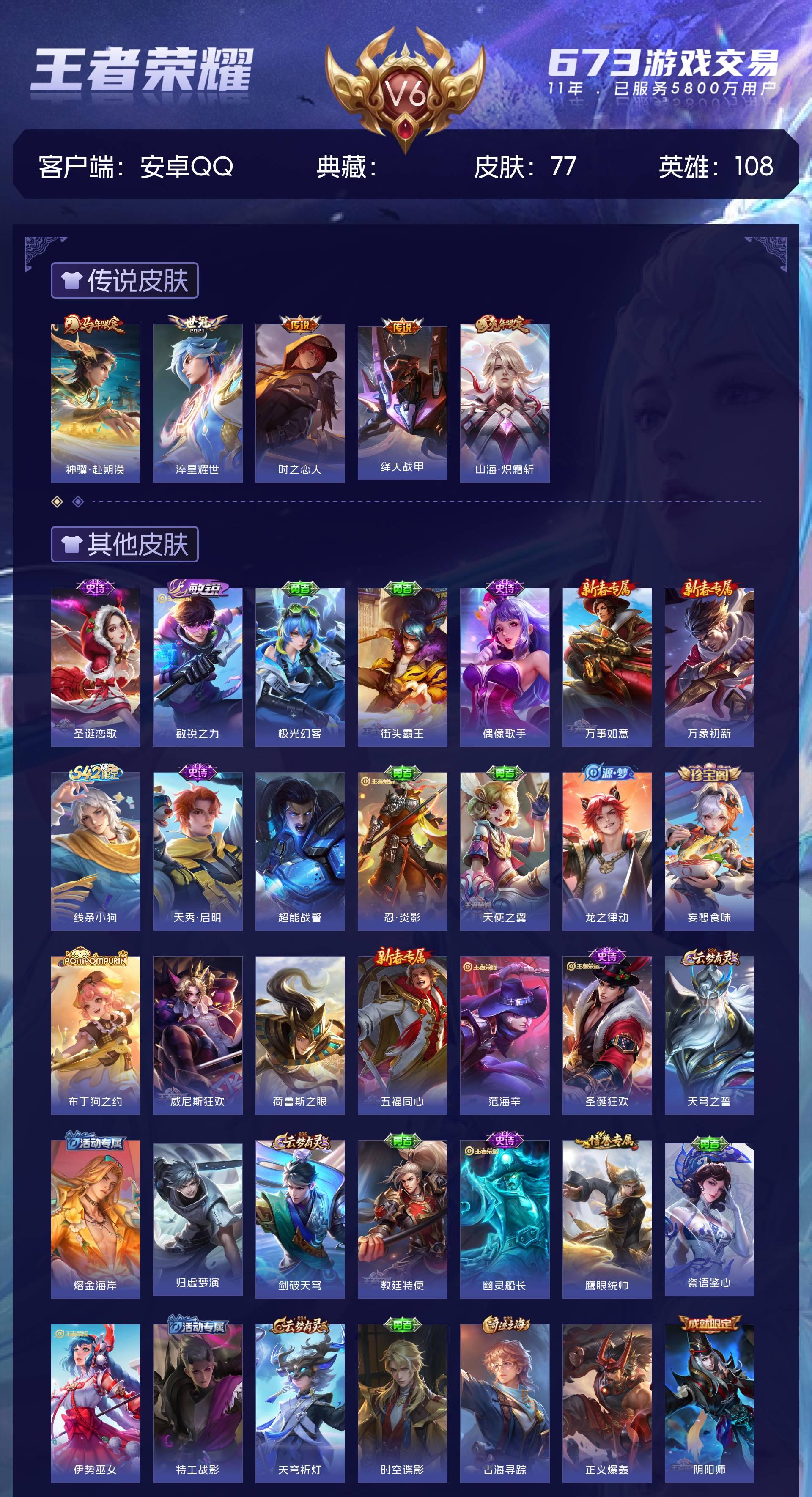 V6 皮肤77 英雄108 至尊星耀 传说5