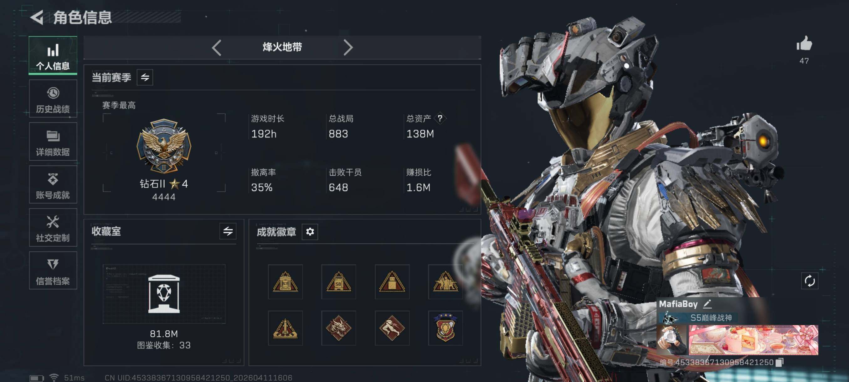 {特价出售}等级:60总资产:138M 流动资产: 117 M 纯币:3080k 隐藏挂饰:黑夜猎手2s 红皮:凌霄戍卫 蚀金玫瑰 天际线 维什戴尔 战令皮肤: 无题密令 刀皮:暗星 影锋 怜悯 信条 砖皮:k416优品a m7优品b ASVal优品a 特勤处:仓库7,训练6,靶场3