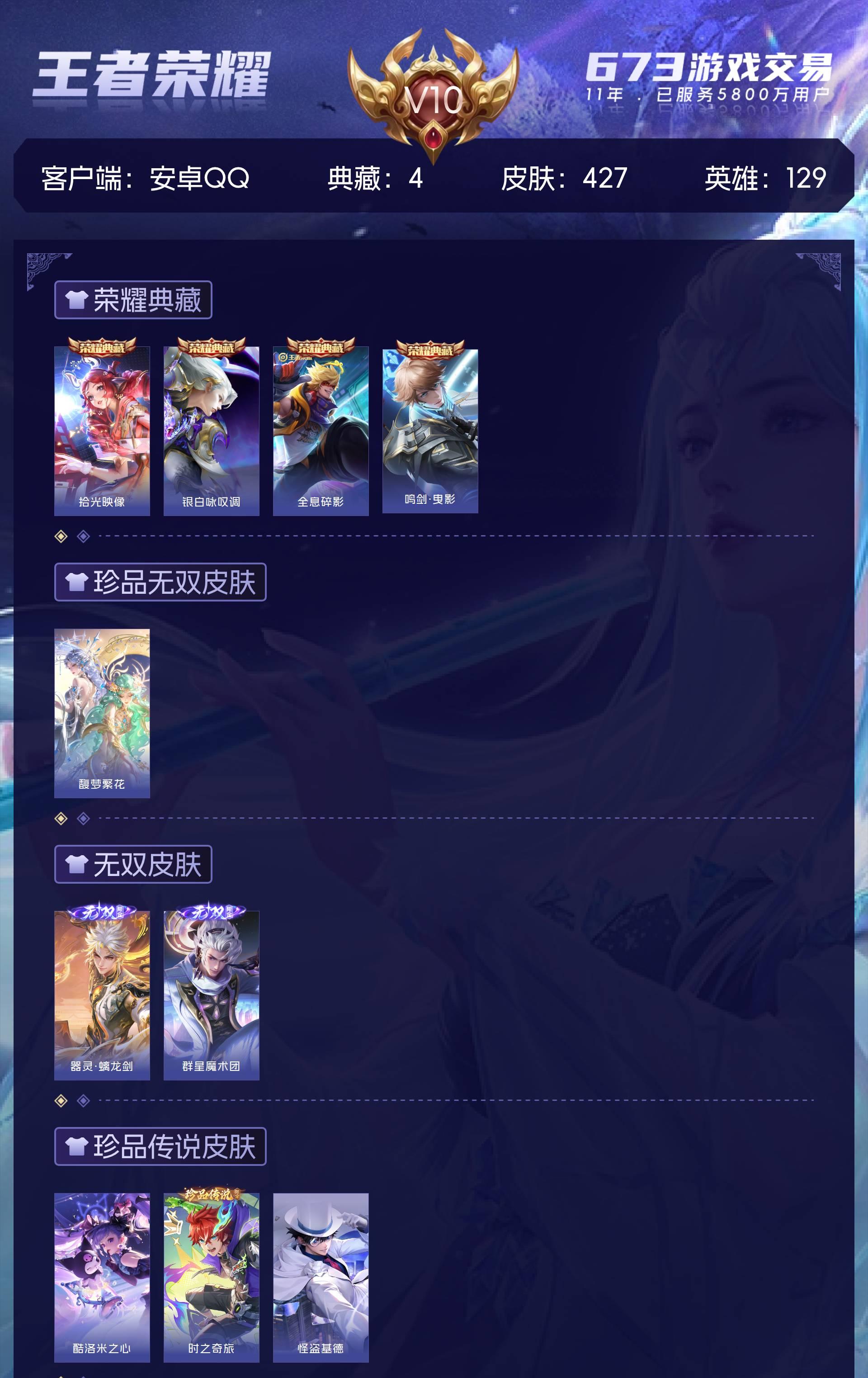 V10 皮肤427 英雄129 至尊星耀 荣耀典藏4 珍品无双1 无双皮肤2 珍品传说3 星传说5 传说53