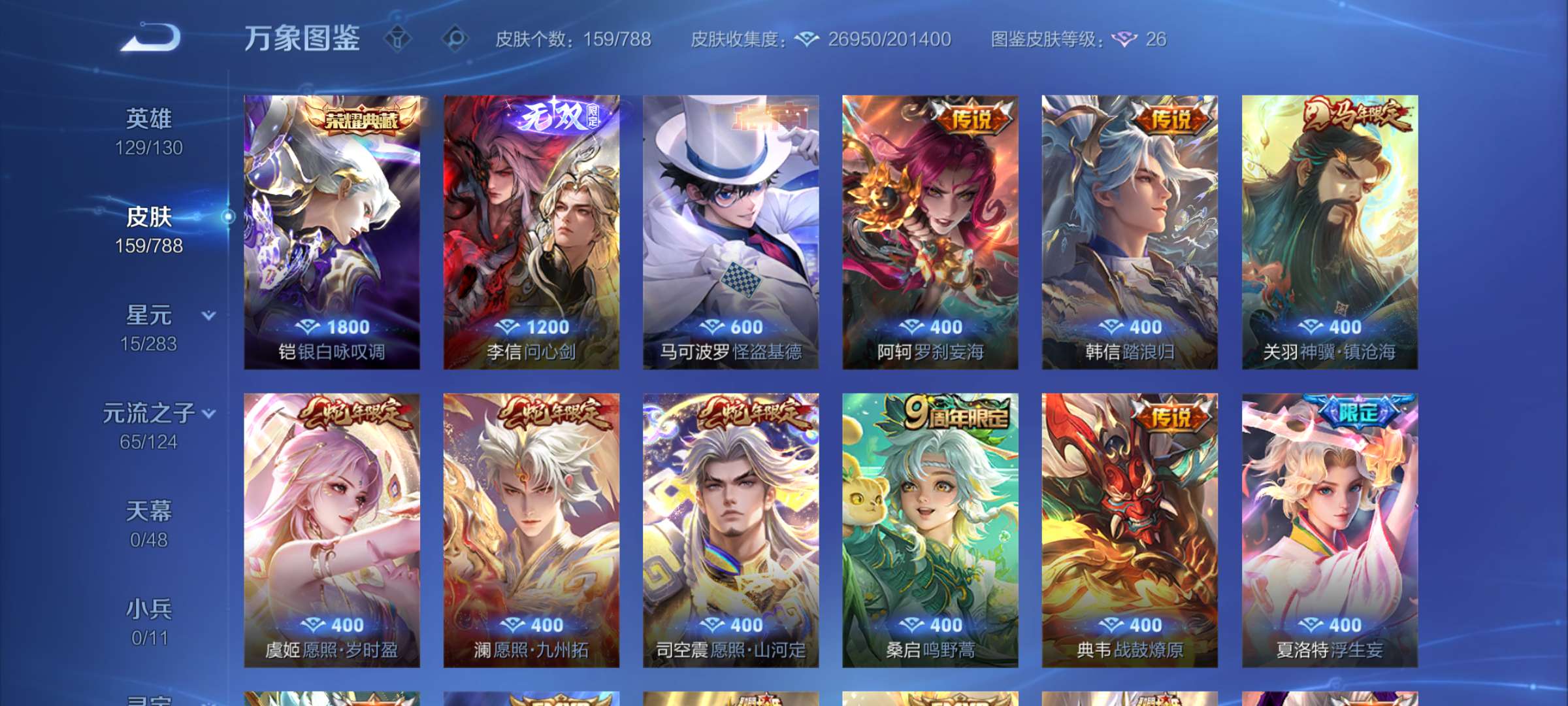 V7 皮肤159 英雄129 至尊星耀 荣耀典藏1 无双皮肤1 珍品传说1 星传说1 传说15