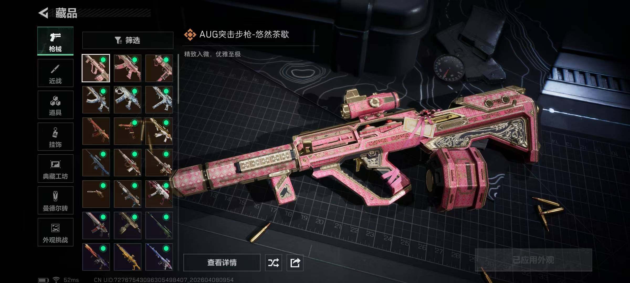 【传说外观】:AKM突击步枪-锦绣,AUG突击步枪-悠然茶歇,腾龙突击步枪-马年祥瑞,腾龙突击步枪-万金泪冠,K437突击步枪-锦绣,MK47突击步枪-悠然茶歇,UZI冲锋枪-悠然茶歇,SMG-4
