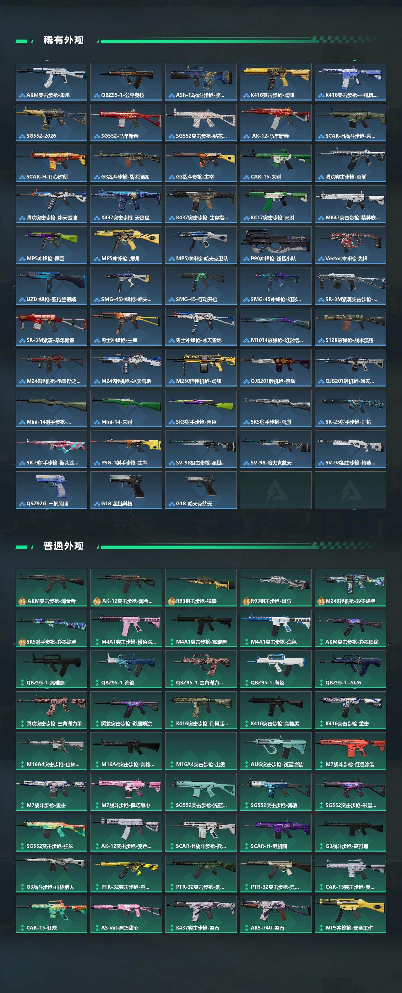 【传说外观】:M4A1突击步枪-蚀金玫瑰,M4A1突击步枪-阿米娅,AKM突击步枪-锦绣,ASh-12战斗步枪-鹅鸭杀,K416突击步枪-StoryBoard,A
