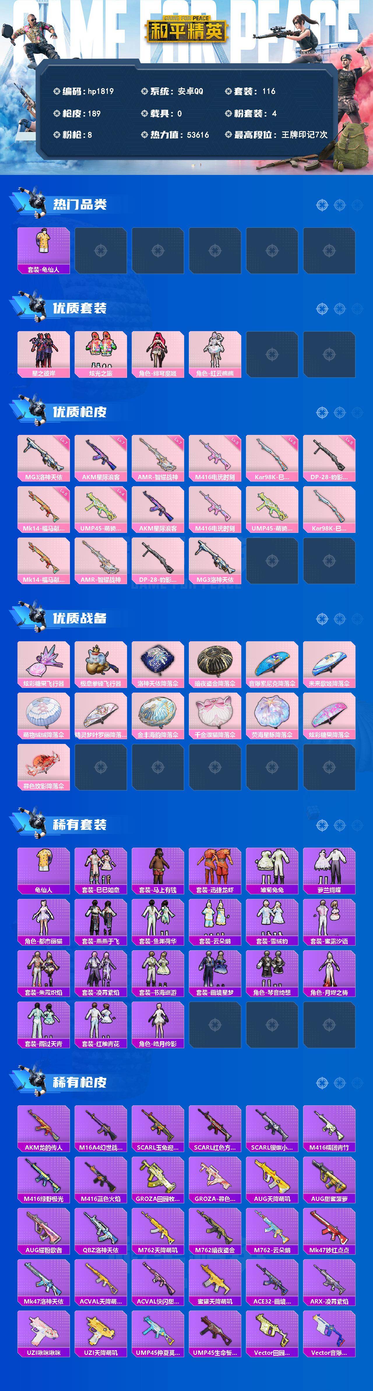 安卓 手Q-4粉装-8特效枪-0载具-2粉色飞行器-53616热力值-7王牌印记-116套装-189枪皮
