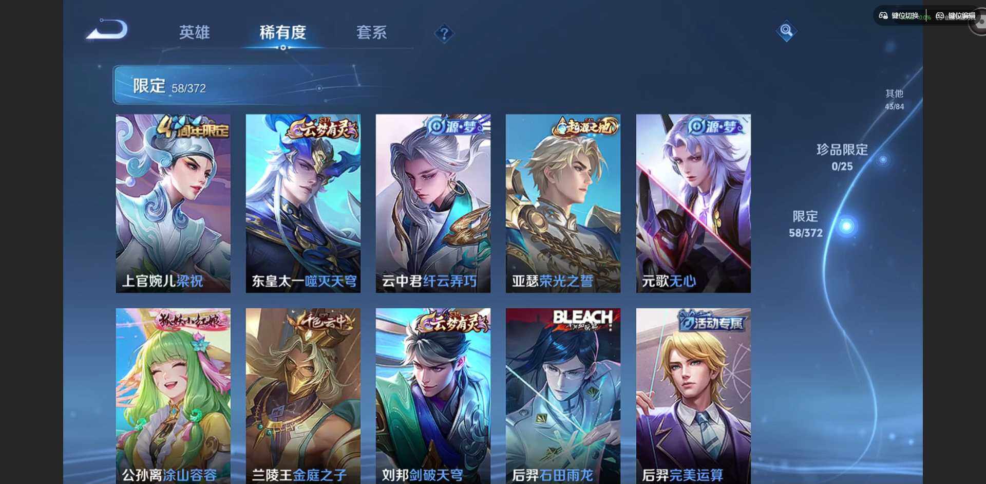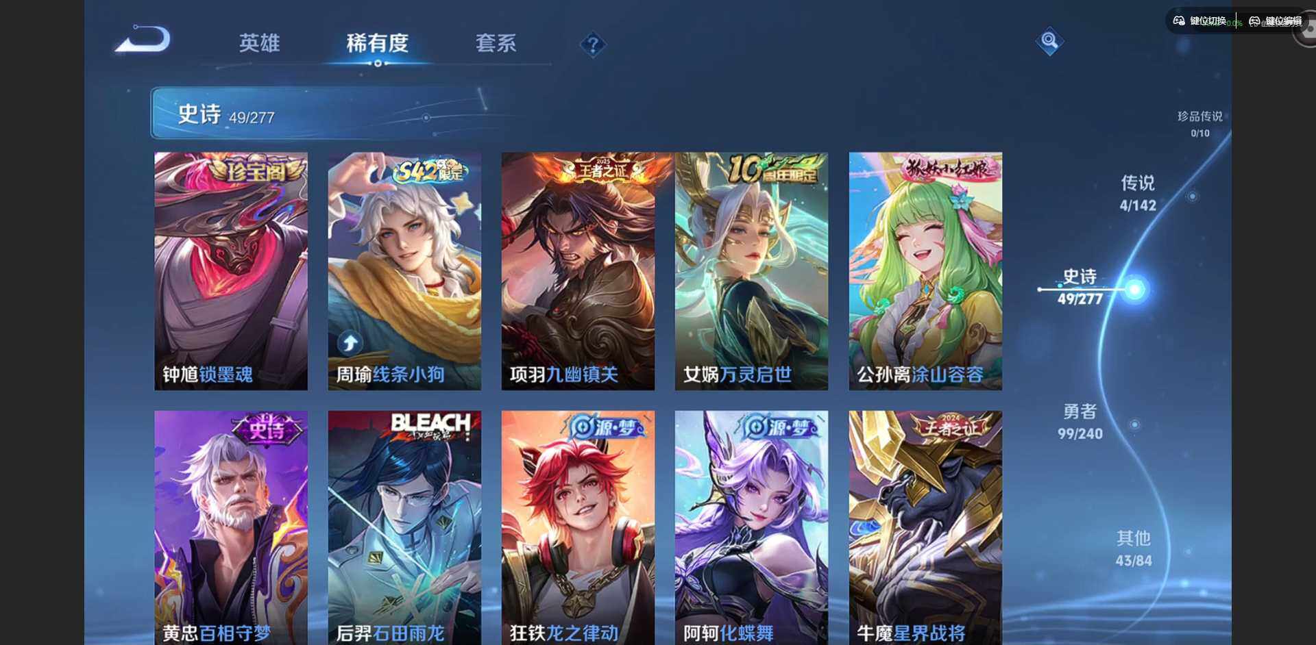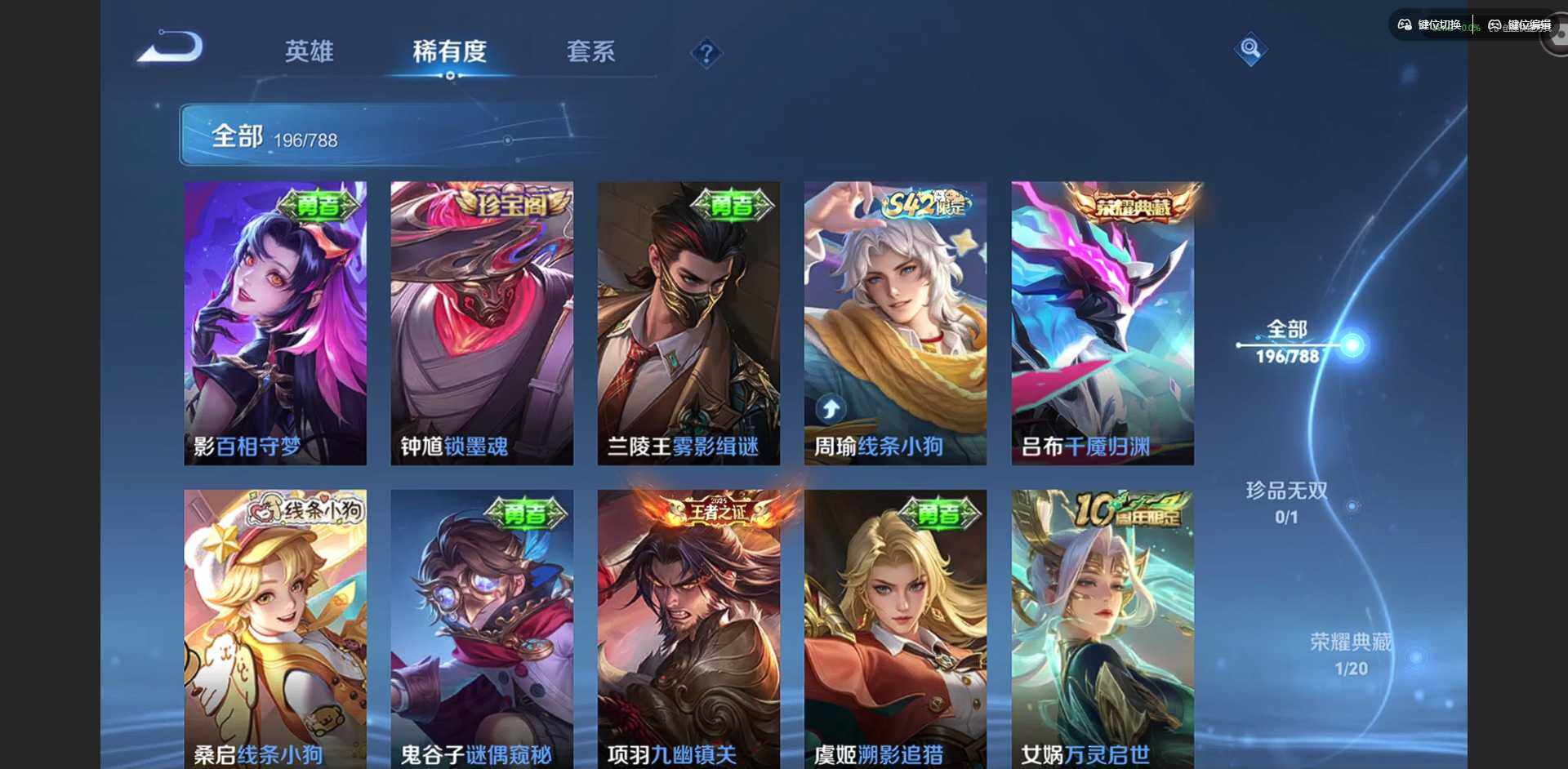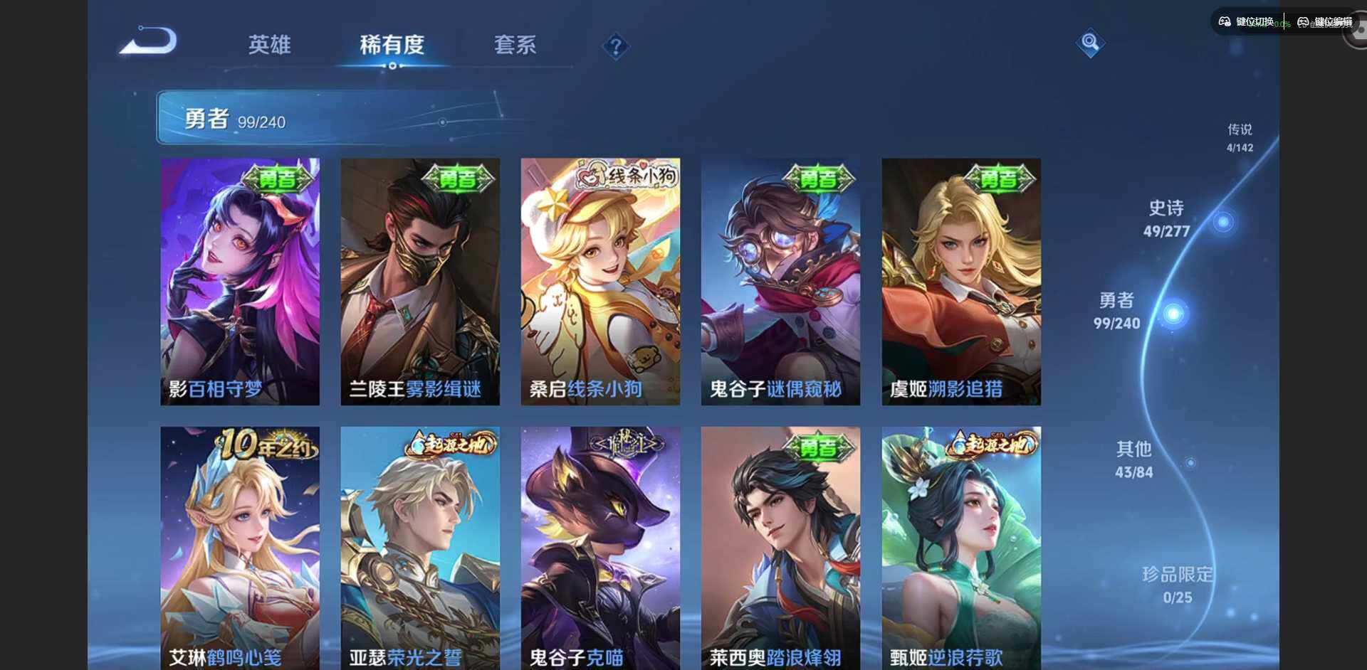 实名: 可修改 贵族等级: V5 英雄数: 128 皮肤数: 196 荣耀水晶