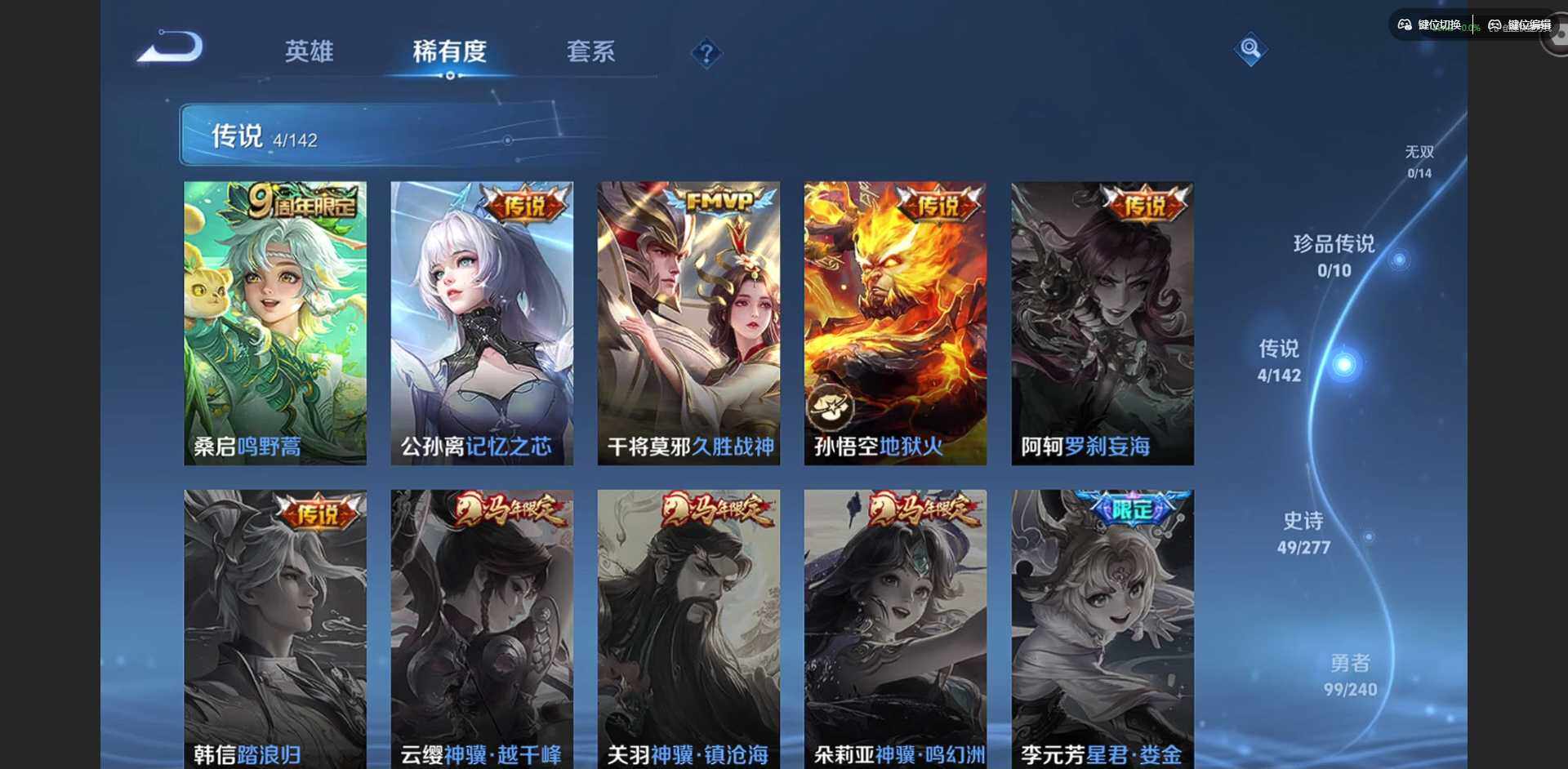 /实名: 可修改 贵族等级: V5 英雄数: 128 皮肤数: 196 荣耀水晶: 千魇归渊 星传说: 幽冥火 传说皮: 久胜战神,地狱火,记忆之芯 限定皮: 李小龙,梁祝,五谷丰年,鸣野蒿