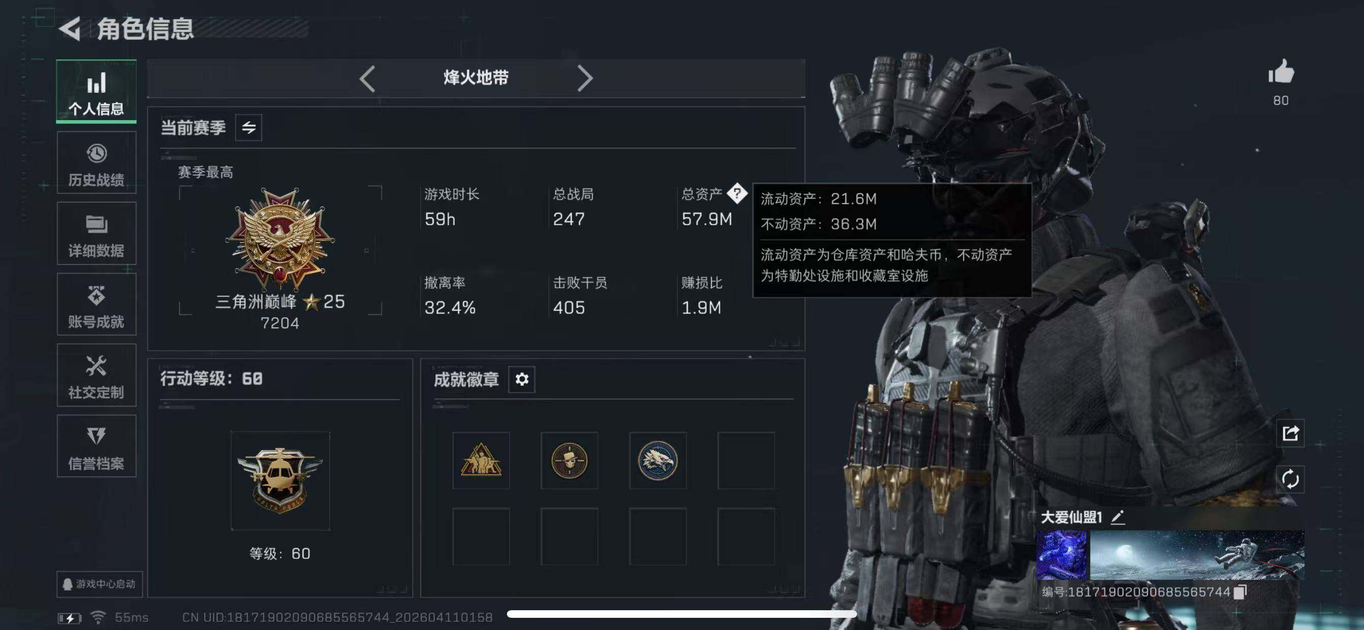 57m总资产-31k哈夫币-60烽火等级-三角洲巅峰-50战场等级-尉官【干