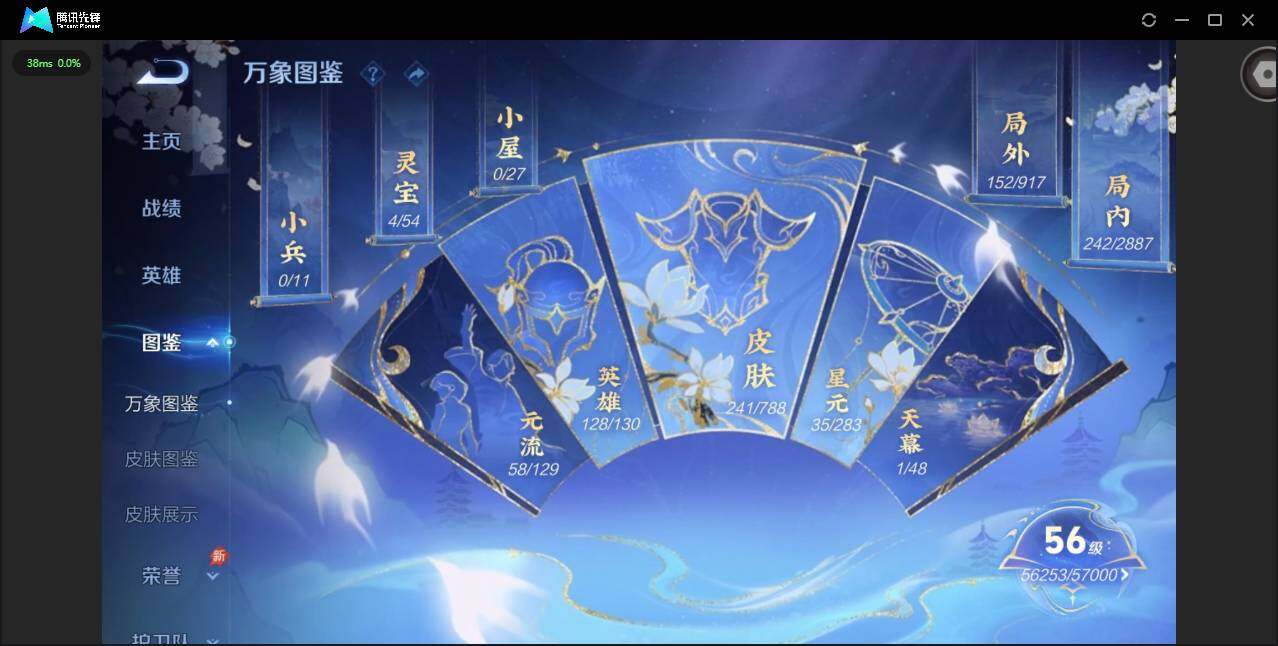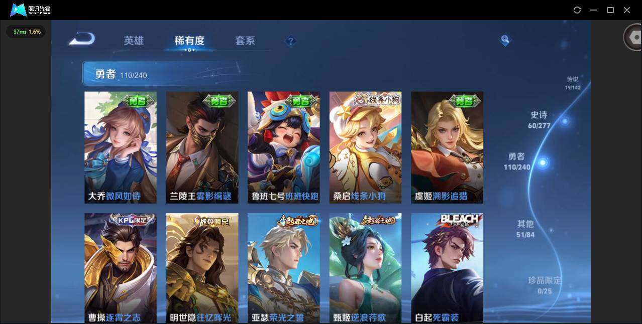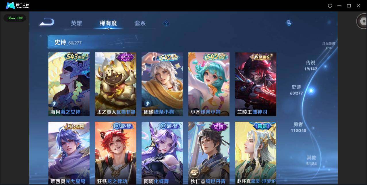 贵族等级: V7 英雄数: 128 皮肤数: 241 荣耀水晶: 鸣剑·曳影 星传说: 幽冥之眼 传说皮: 冠军飞将,云鹰飞将,仲夏夜之梦,地狱之眼,无双飞将,山海·苍雷引,浮生妄,澜逐花归海,乘龙·铭钟鼎,幻光神枪,云诺千山,神树通天,长夜焕生,神骥·越千峰 限定皮: 李小龙,梁祝,至尊宝,一生所爱,高山流水,寅虎·赤拳,五谷丰年,诗剑行,鸣野蒿,愿照·岁时盈,