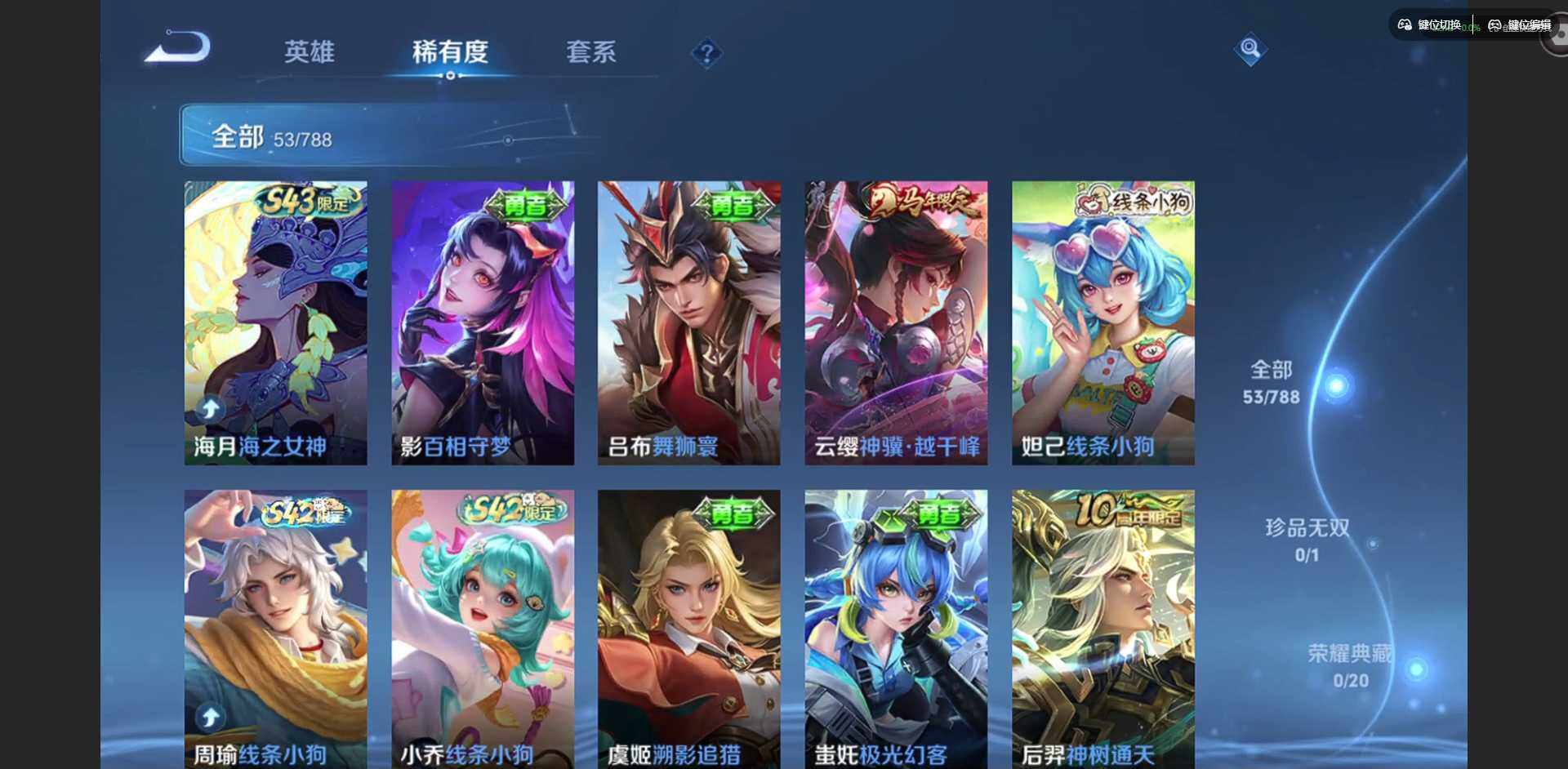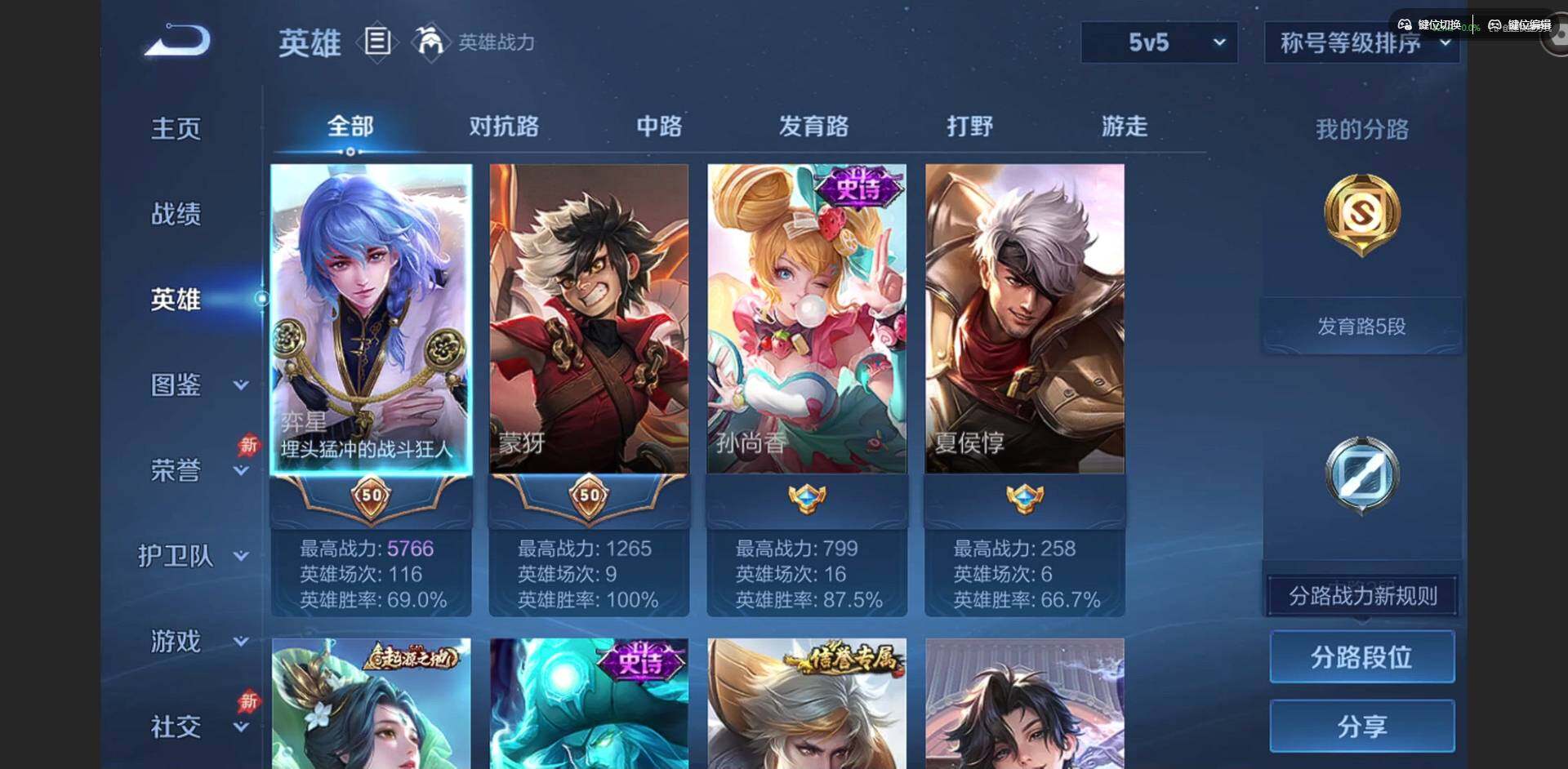 实名: 可修改 贵族等级: V4 英雄数: 78 皮肤数: 53 传说皮: 久胜战神,神树通天,神骥·越千峰 限定皮: 愿照·九州拓