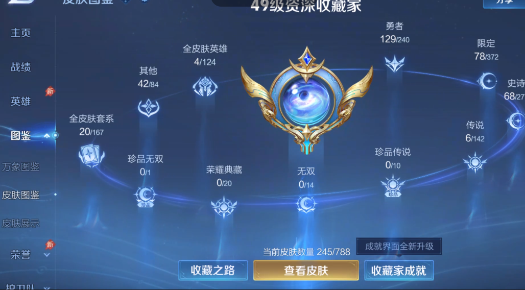 亏本清仓皮肤数245传说皮肤数6史诗皮肤数66英雄数129营