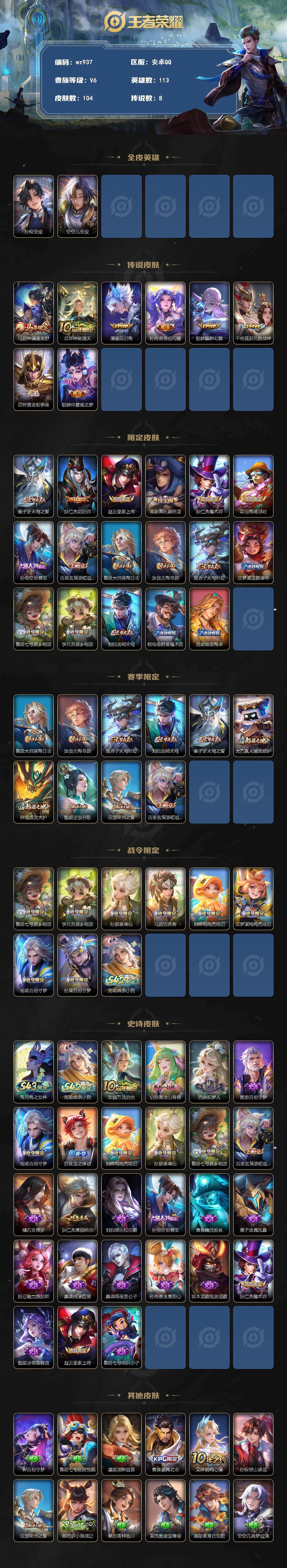 852/至尊宝 马超年限-安卓Q-V6-永恒钻石I段位-113英雄-104皮肤-8传说-25史诗