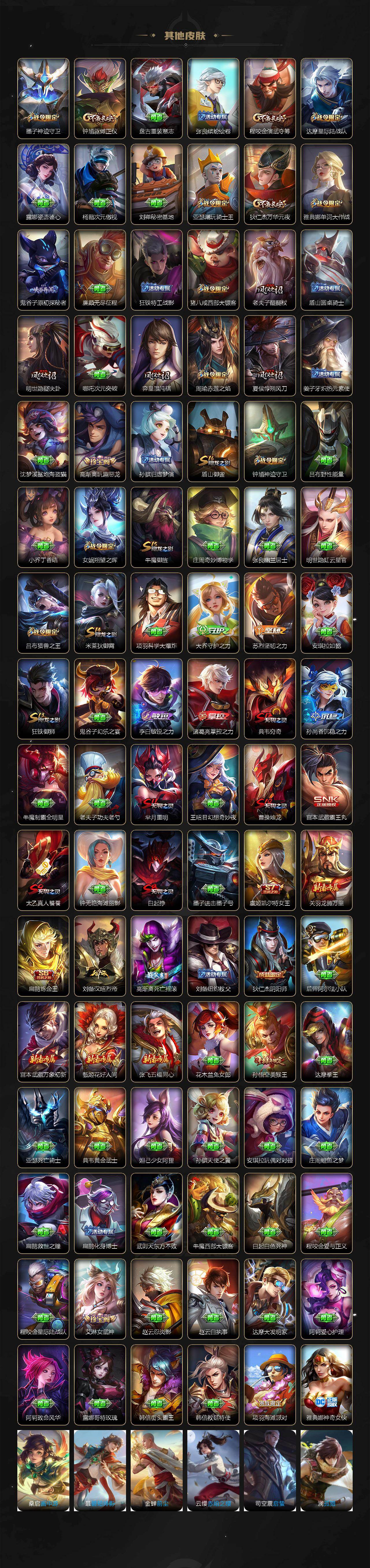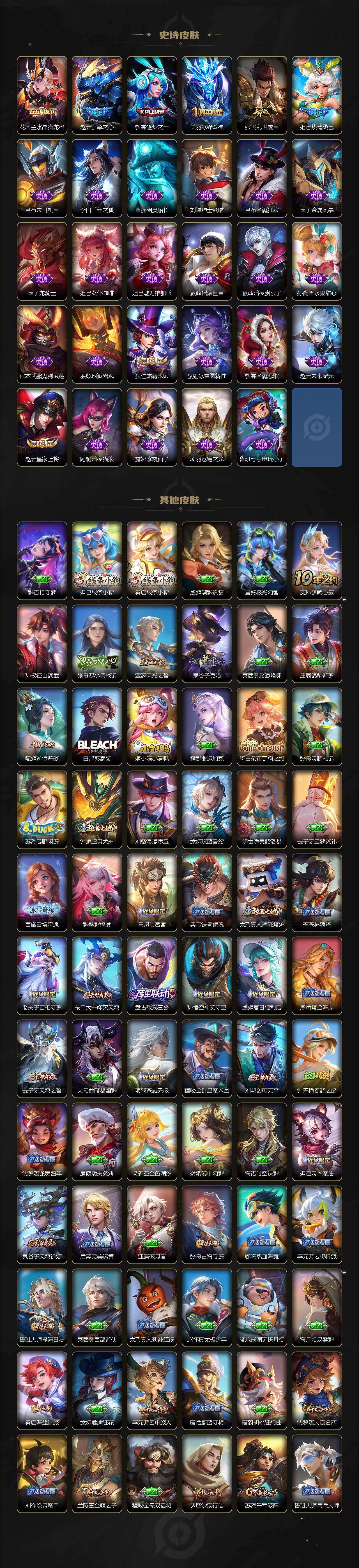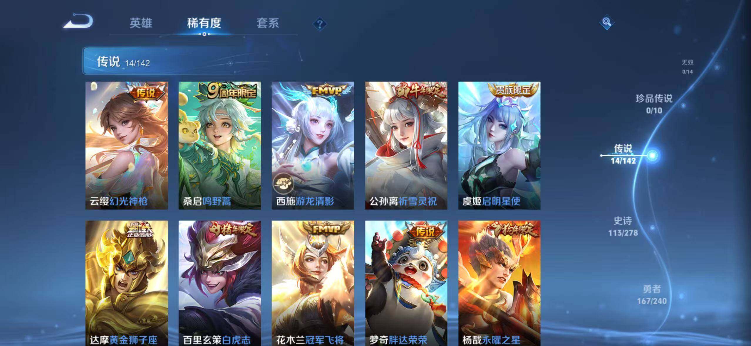 【传说皮肤】:云缨幻光神枪,桑启鸣野蒿,西施游龙清影,公孙离祈雪灵祝,虞姬启明星使,达摩黄金狮子座,百里玄策白虎志,花木兰冠军飞将,梦奇胖达荣荣,杨戬永曜之星,诸葛亮武陵仙君,孙尚香末日机甲,宫本武
