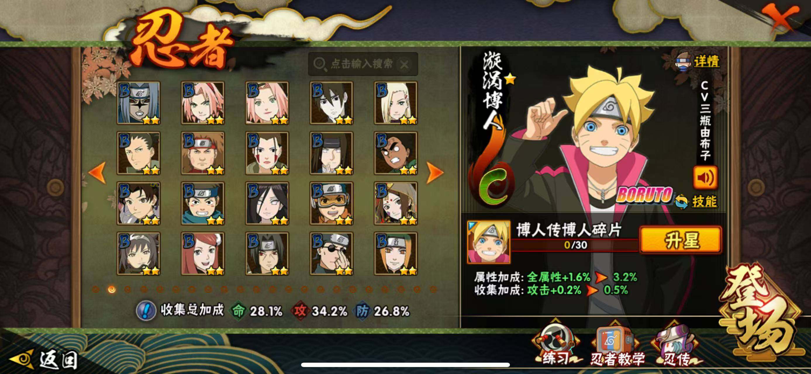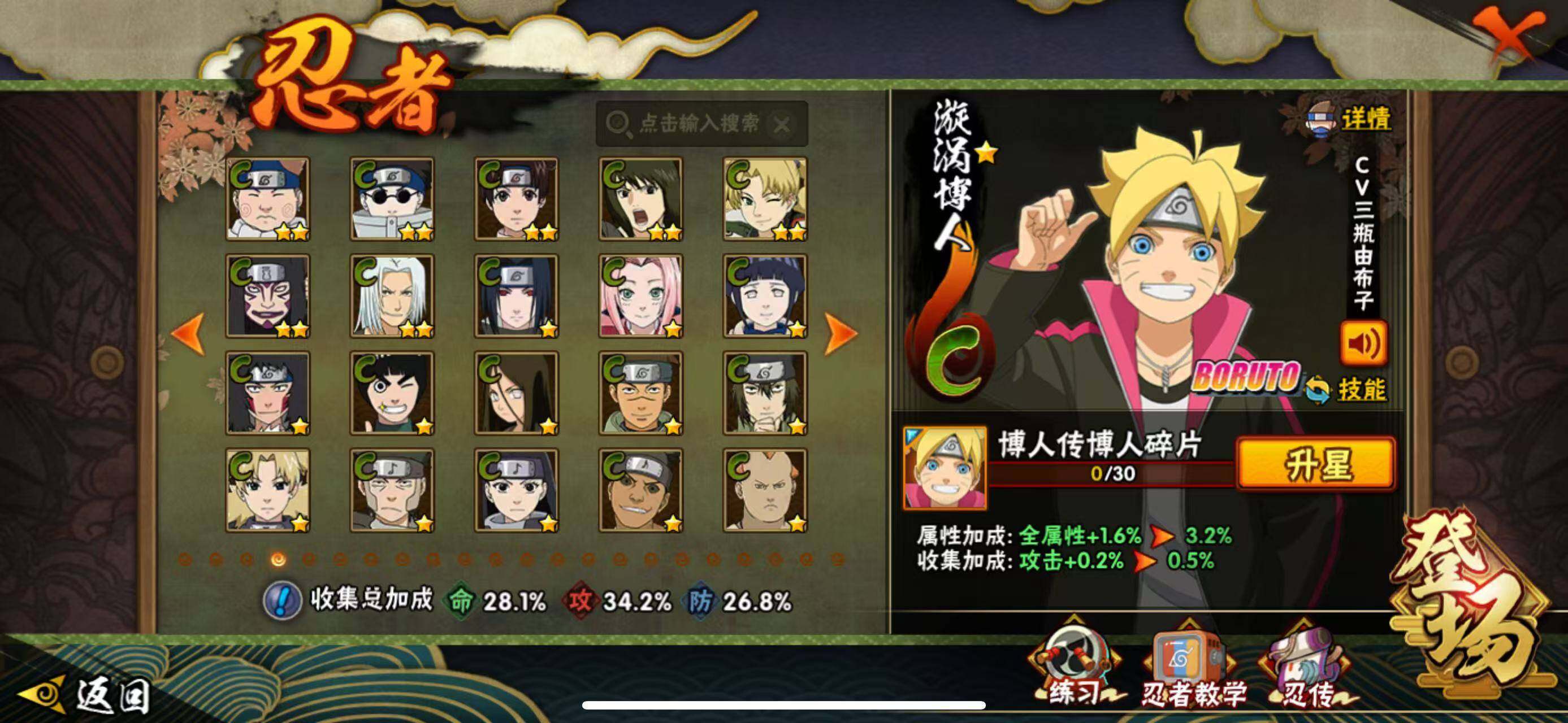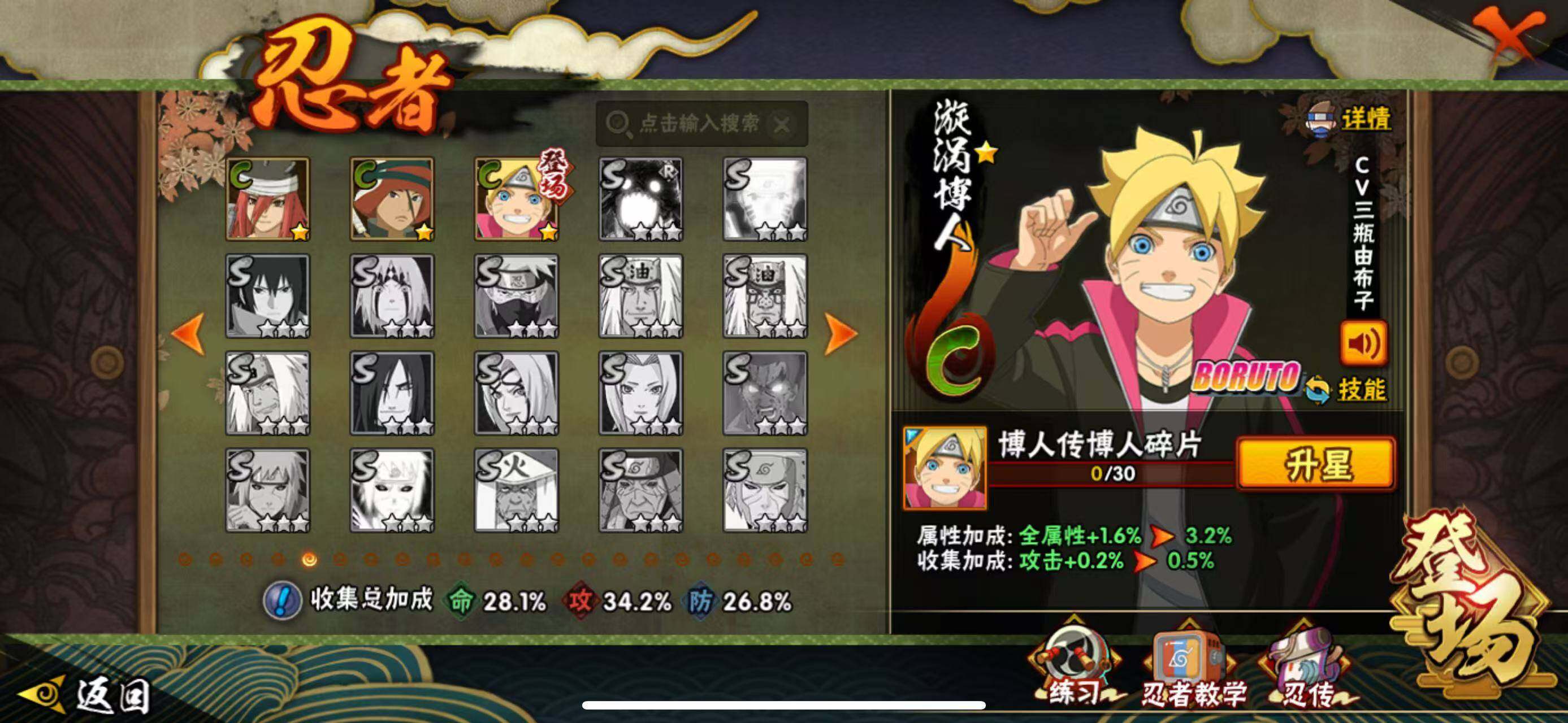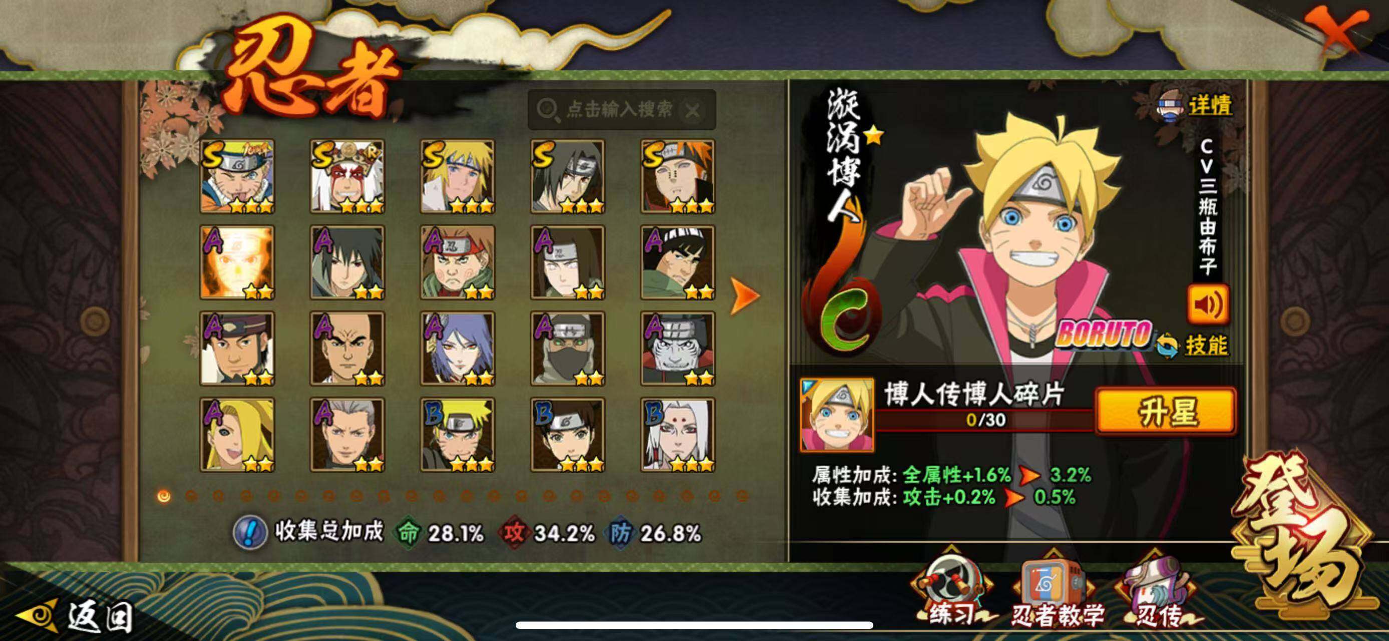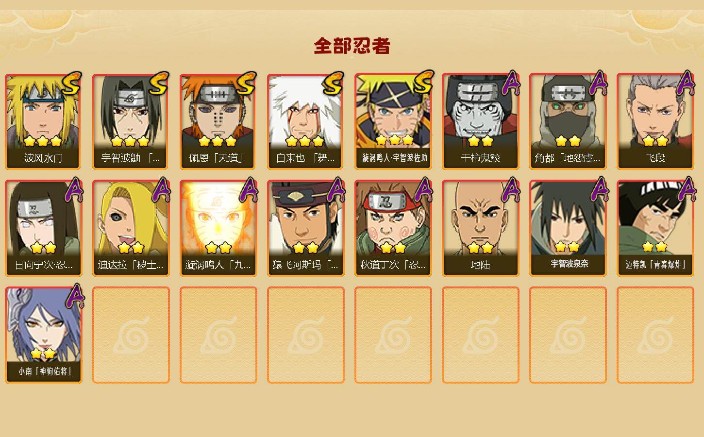 【S级忍者】:宇智波鼬「须佐能乎」(3星),自来也「舞之豪杰」(3星),波风水门(3星),佩恩「天道」(3星),漩涡鸣人·宇智波佐助(3星)
