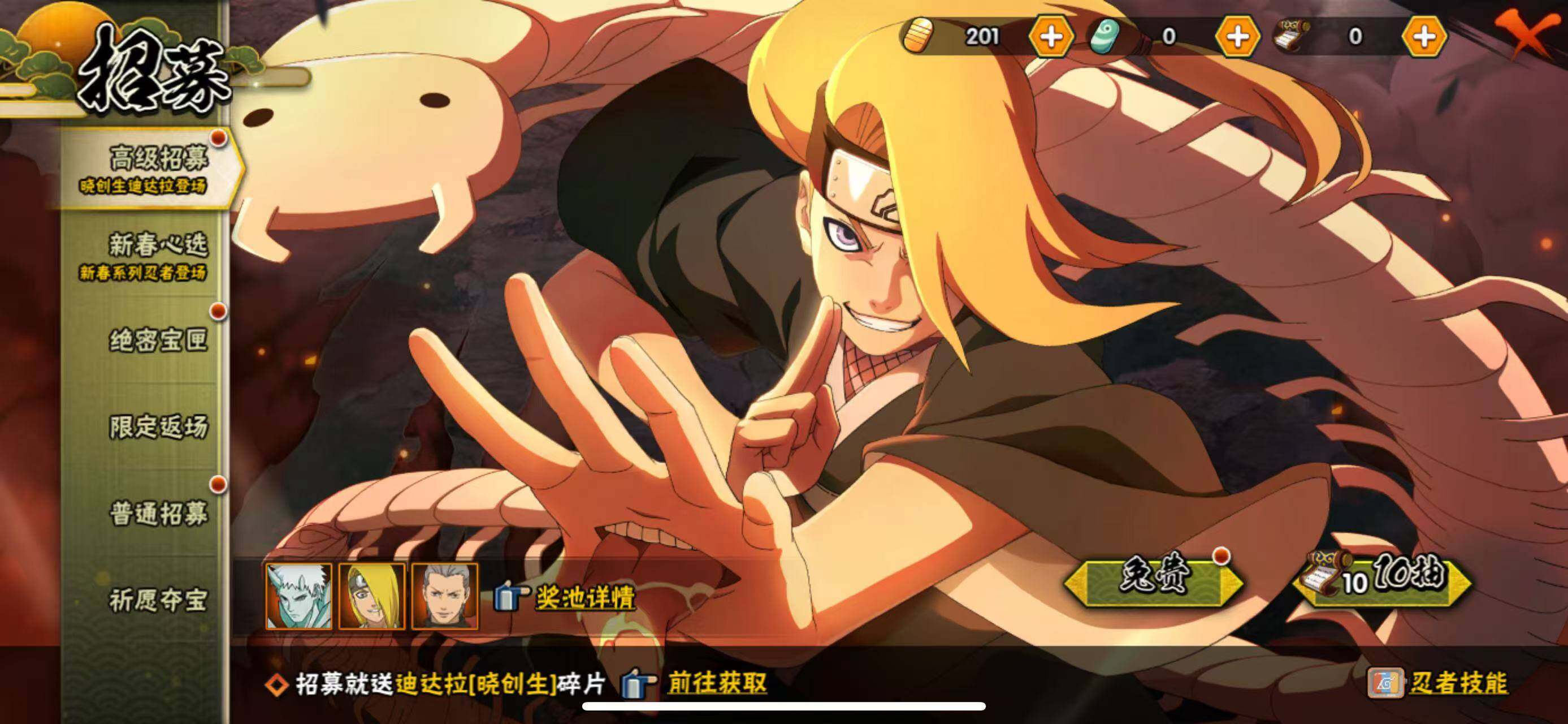 【A级忍者】:迪达拉「秽土转生」(2星),飞段(2星),干柿鬼鲛(2星),漩涡鸣人「九尾查克拉」(2星),小南「神驹佑将」(2星),角都「地怨虞」(2星),猿飞阿斯玛「七夕限定」(2星),日向宁次「忍界大战」(2星